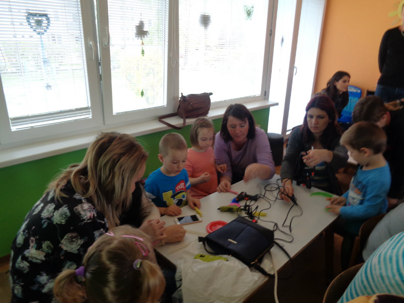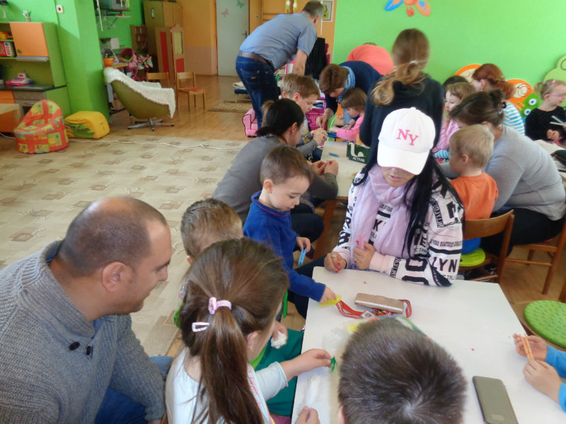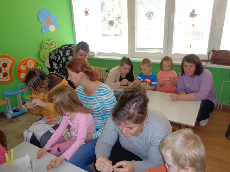 Deti si po kultúrnom programe vyhrnuli rukáviky a s mamami a oteckami vyrábali pestrofarebných vtáčikov. Práca sa im vydarila.