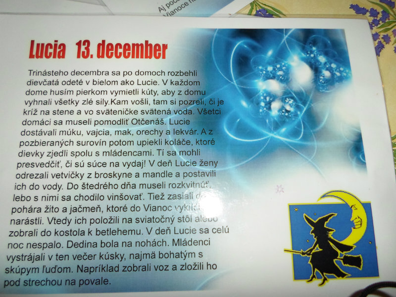 13. december je zaujímavým dňom v predvianočnom období. Aj Sviatok Lucie patrí do série stridžích dní, ktoré predchádzajú Vianociam. Trvali od Kataríny (25. novembra) do Tomáša (21. decembra). Viazali sa tiež na Ondreja(30. novembra), Barboru (4. decembra), Mikuláša (6. decembra) a Luciu (13. decembra). Ľudia verili, že v tento deň môžu strigy aj uvidieť. Podľa najznámejšej ľúbostnej veštby si na Luciu dievčatá pripravili trinásť lístočkov. Na dvanásť z nich napísali rôzne mužské mená, pričom posledný trinásty zostal prázdny. Lístočky poskrúcali a postupne, počas nasledujúcich dní ich po jednom zničili (pálili). Predposledný lístok spálili na Štedrý deň ráno, a posledný otvorili večer. Meno, ktoré na ňom bolo napísané, malo byť menom budúceho manžela. Ak zostal posledný lístok prázdny, budúci rok sa dievčina ešte vydať nemala.