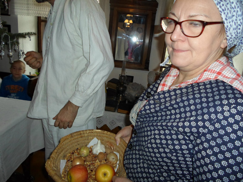 Na štedrý deň si ľudia na stôl do každého rohu položili peniaz, aby boli budúci rok bohatí. Do prostriedku vysypali zrno, aby bol nasledujúci rok úrodný. Prikryli ho najkrajším obrusom, na stôl položili ošatku ? pletený košík so zrnom, šošovicou, hrachom, cesnakom, cibuľou, orechmi, jabĺčkami, aby bol budúci roh plný hojnosti. Gazdiná postavila na stôl ošatku s čerstvým chlebom, vianočné oblátky, med, a cesnak, gazda zapálil sviečku a omotal nohy stola pevnou reťazou, aby rodina držala pokope. Stromček zavesili na strop aby nezavadzal, lebo domy boli malé. Stromček ozdobili medovníkmi, orieškami, sušenými jabĺčkami, a salónkami, ktoré si vyrobili tak, že do alobalu zabalili kockový cukor.