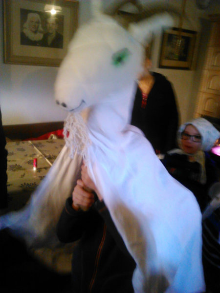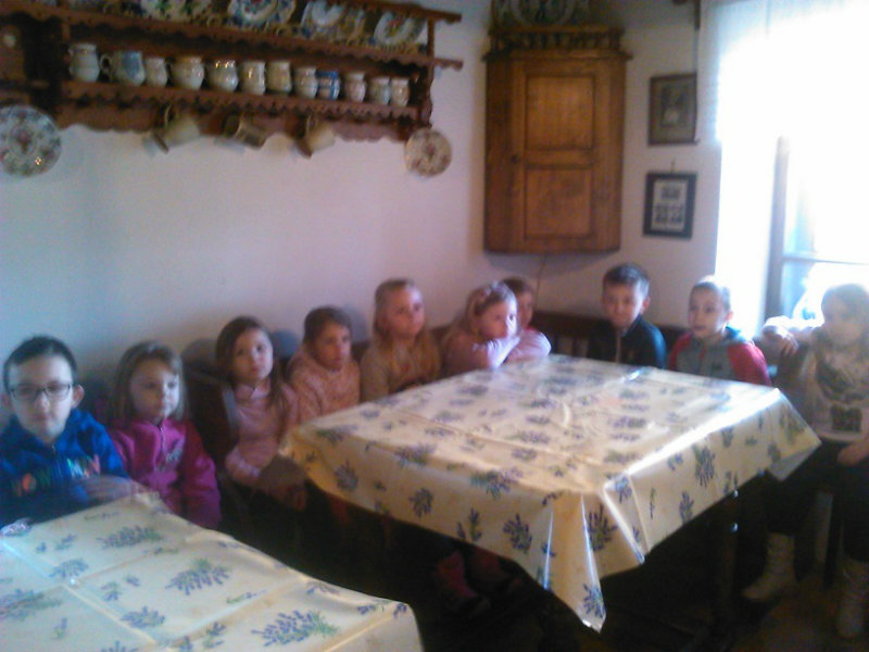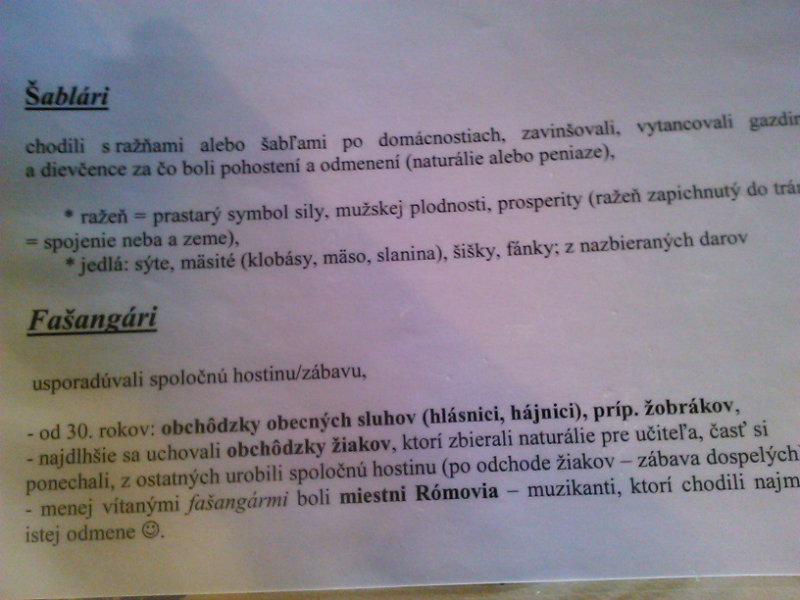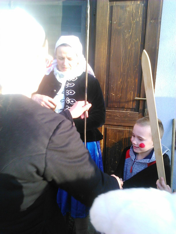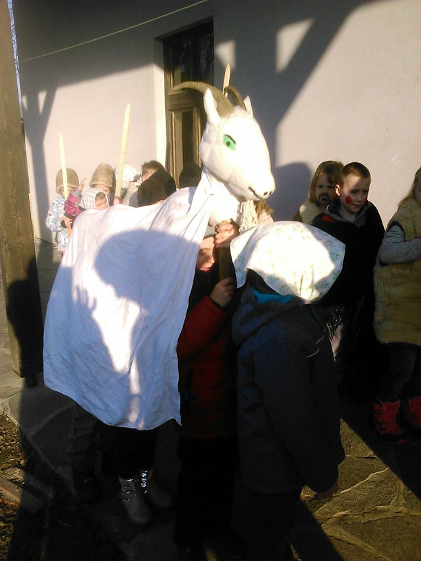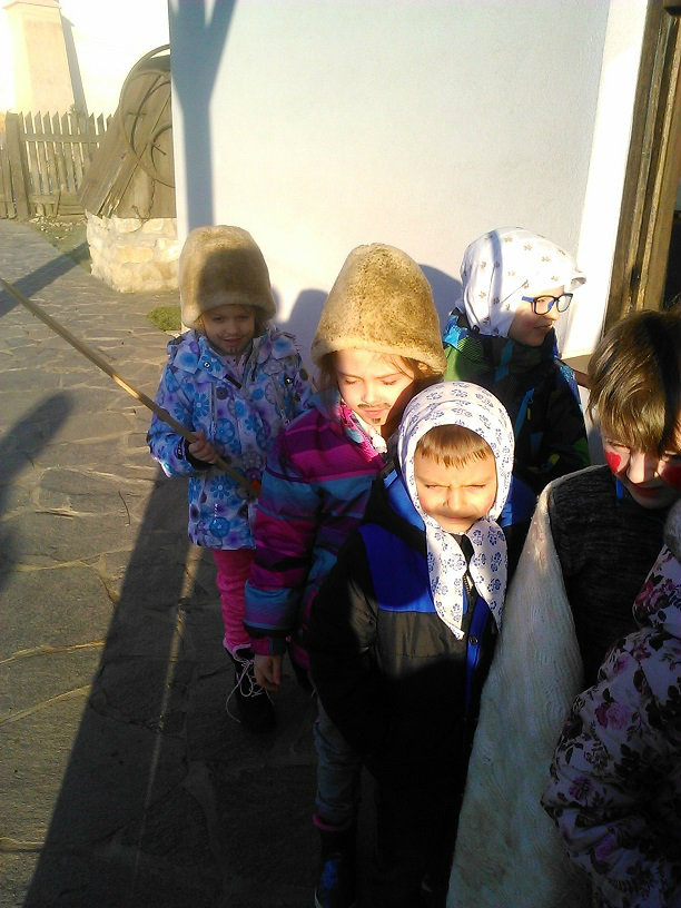 /chlapci sa prezliekli za dievčatá, dievčatá si namaľovali fúzy a stali sa chlapcami. Tri deti tvorili capka. Jeden držal hlavu capka na palici a dvaja boli pod plachtou a tvorili telo./ V maskách sme znovu tancovali a spievali sme tak, ako to bolo kedysi na veselici. Po tanci sme sa v sprievode, so spevom, vybrali koledovať pred dom za gazdinou. Tancom, spevom sme si vykoledovali klobásu a slaninu, ktorú nám gazdiná napichla na šable a pozvala nás ku stolu kde nám pripravila tradičné šišky a čaj. S novými poznatkami a zážitkami sme sa vrátili autobusom do MŠ.