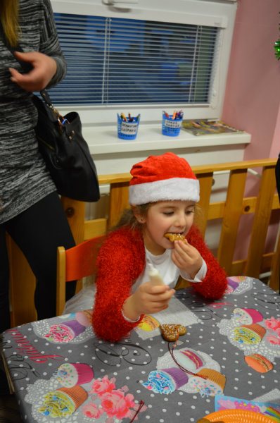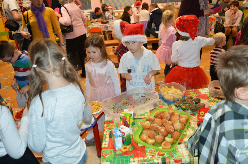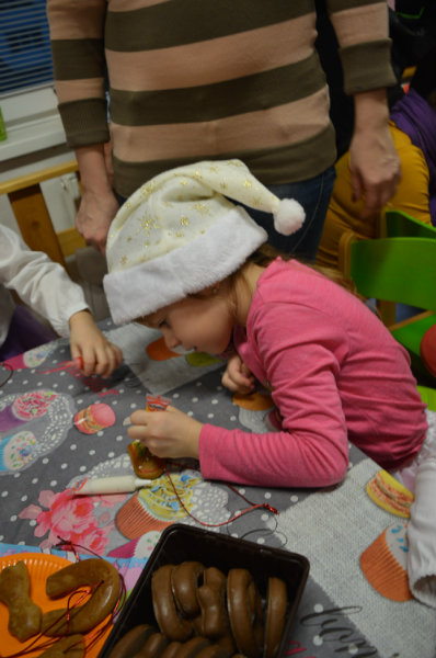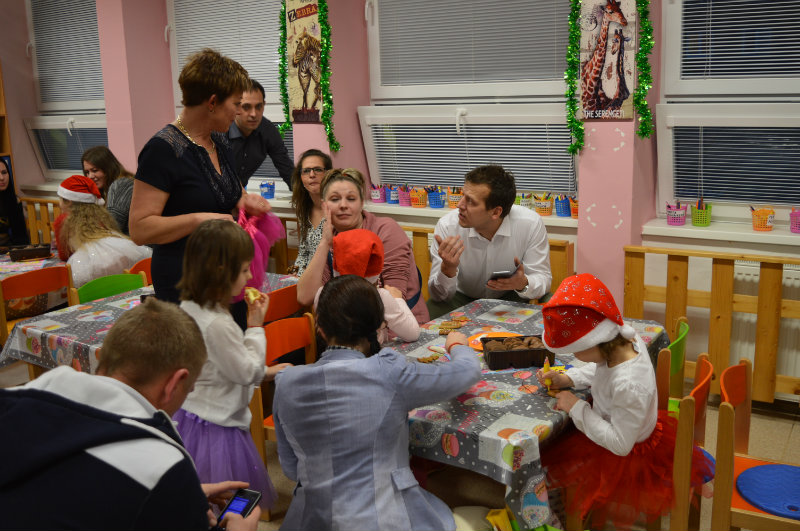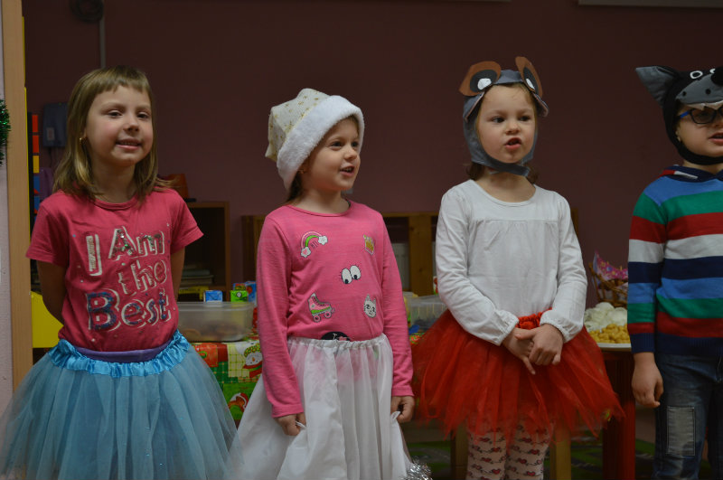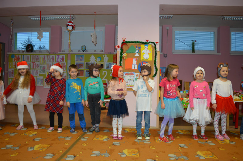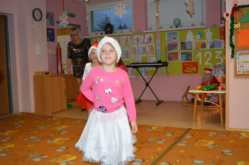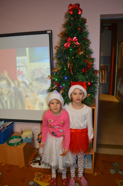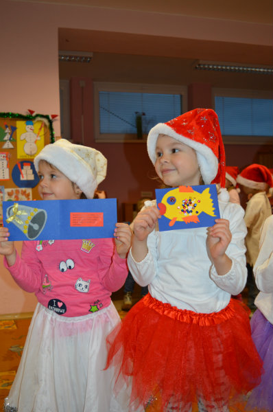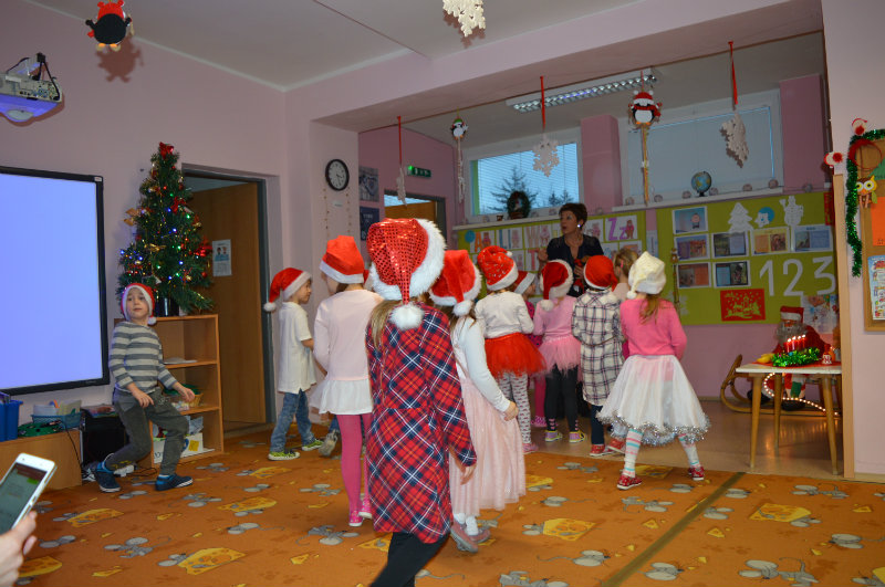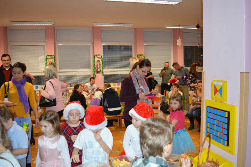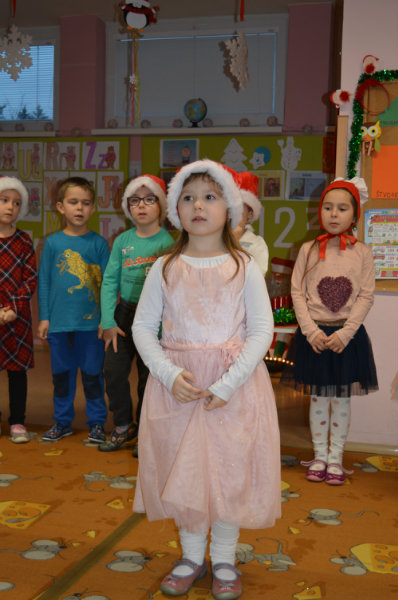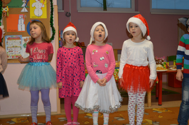 S deťmi sme si pripravili vianočný program, zimné básne a piesne o snehuliakoch, vtáčikoch, sánkovačke a guľovačke, divadielka o zvieratkách i o Červenej čiapočke, koledy i tanec. Rodičom sme vyrobili vianočné pozdravy s kaprom na vrchnej strane, blahoželaním a zvončekom vo vnútri, lepením a strihaním. Spoločne sme vyzdobili triedu, ozdobili stromček, rozsvietili sviečky, vyparádili sme sa a tešili sa na rodičov. Starostlivé mamičky nám pripravili vianočné pohostenie. Medovníčky rôznych tvarov, linecké koláčiky s lekvárom, buchtičky, piškóty s banánom v čokoláde, slané tyčinky a najrozličnejšie voňavé dobroty. Keď prišli rodičia, s radosťou a odvážne sme im zaspievali, zatancovali, zarecitovali a vytvorili príjemnú vianočnú náladu. Po vystúpení sme rozdali pozdravy a pobozkali rodičov. Potom sme spoločne zdobili medovníky a zároveň aj ochutnávali. Zábava pokračovala tancovaním, hodovaním, hrami a rozhovormi. Na záver sme si popriali krásne, veselé a šťastné Vianoce.