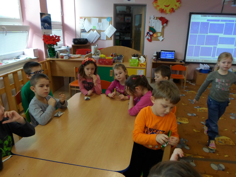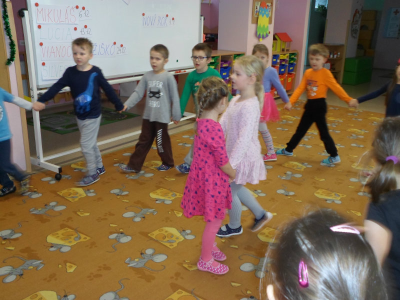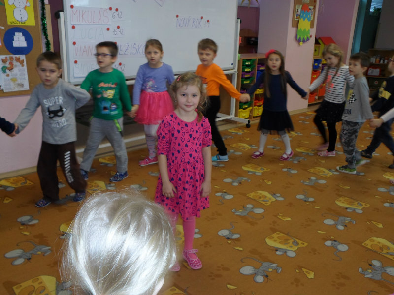 Tradíciu, ktorú ľudia dodržiavali na Luciu a s ktorou sme sa zoznámili na Gazdovskom dvore na Turej Lúke, sme si vyskúšali v MŠ, nakoľko máme v triede jednu Luciu. Zaspievali sme jej pieseň od Mira Jaroša Narodeniny, zagratulovali, zatancovali sme si s ňou. Spoločne sme si pripravili nepečený koláč. Na plech sme ukladali piškóty, na ne sme natierali jablkovú plnku a vrstvili. Vrch koláča sme ozdobili smotanou a horkou čokoládou. Potom sme spoločne hodovali a oslavovali Luckine meniny. Ona nám za odmenu, podľa tradície, zahalená do bielej plachty, povymetala všetky kúty v triede husím pierkom, aby vyhnala od nás zlé sily.