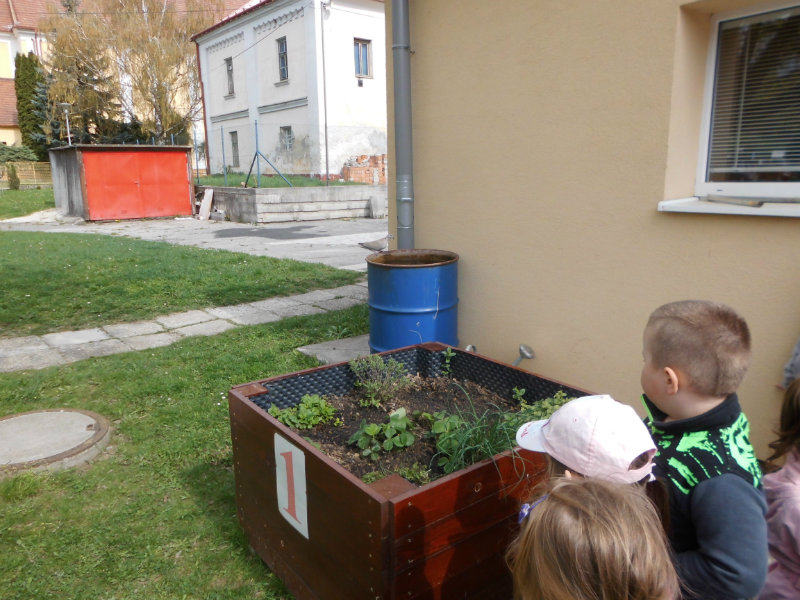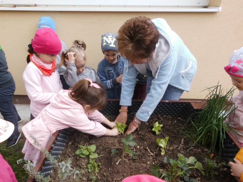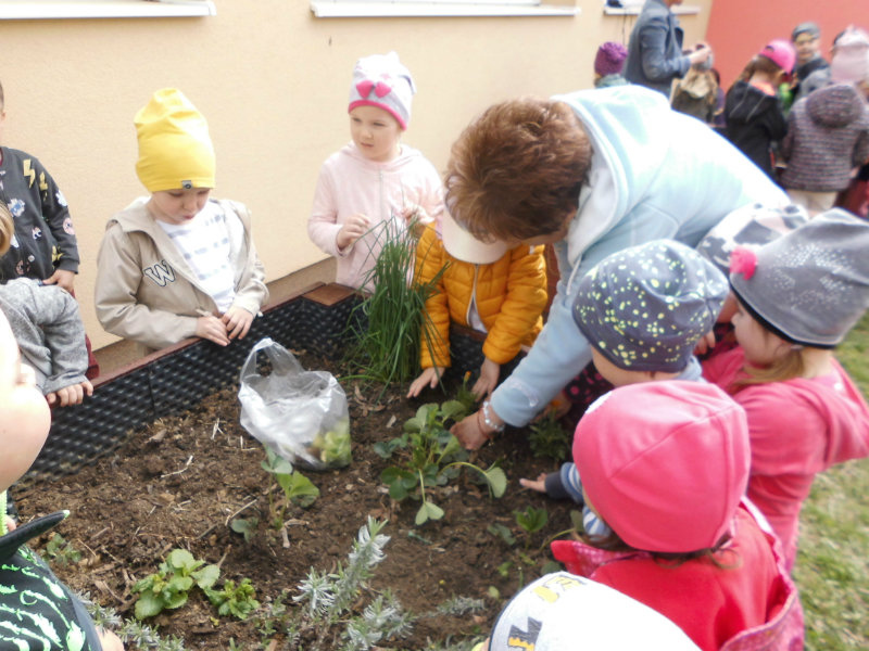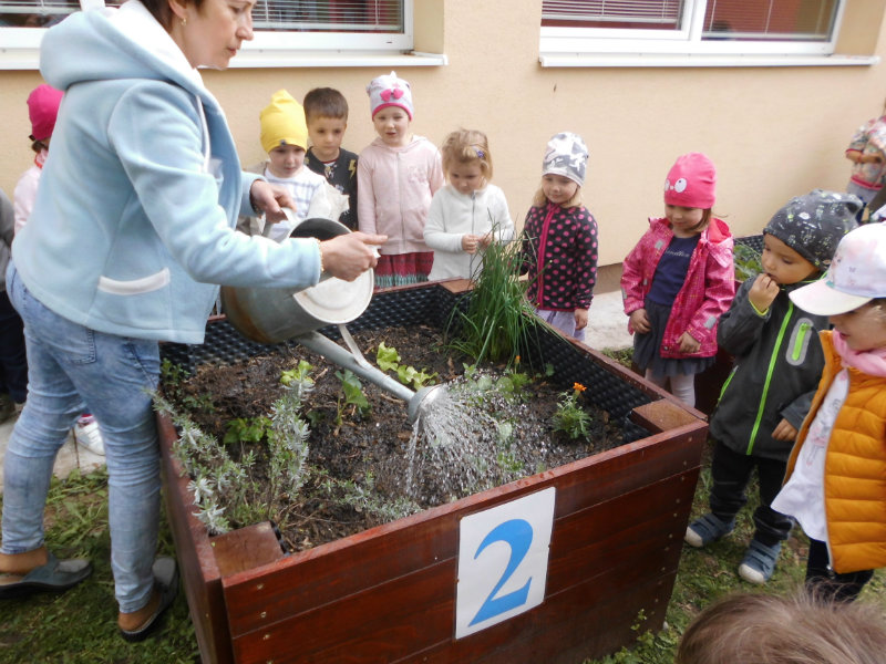 Slniečko už viacej hreje, na nás dolu sa viac smeje, kúpili sme planty malé, o ktoré sa postaráme. Do hriadky ich zasadíme a vodičkou polejeme.