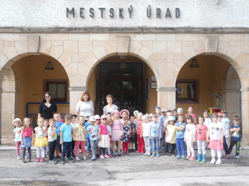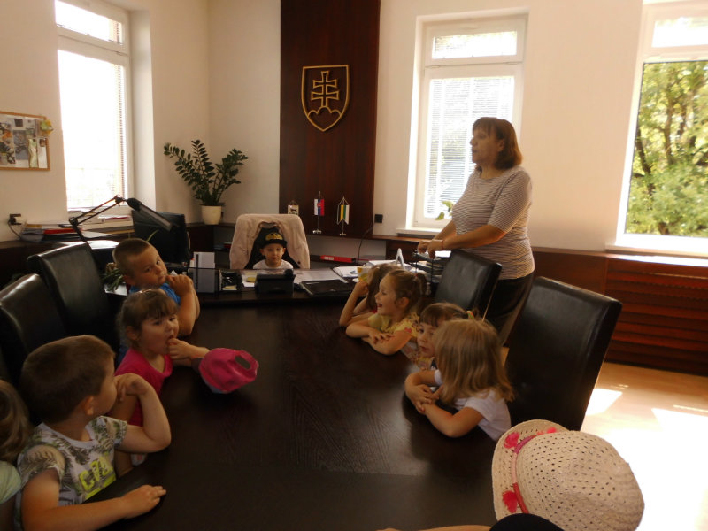 23.5.2018 sme v rámci témy "Slovensko moja vlasť" navštívili Mestský úrad v našom meste. Hostiteľkou nám bola pani primátorka Ing. Anna Halinárová. Nakuknúť sme mohli do jej kancelárie i do zasadacej miestnosti. V obradnej sále sme si mohli skúsiť, ako sa nosí štátny znak a poťažkať si kroniku mesta. Ďakujeme za milé prijatie a nevšedný zážitok.