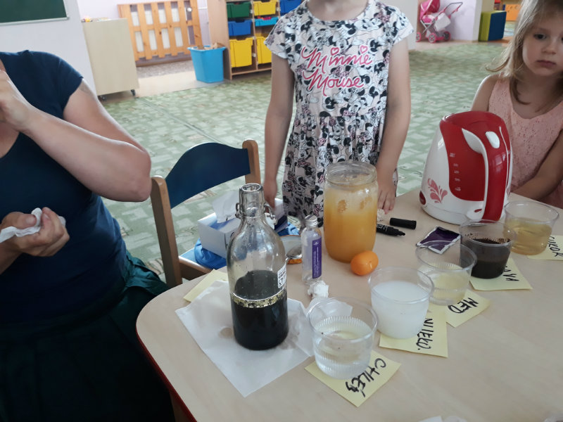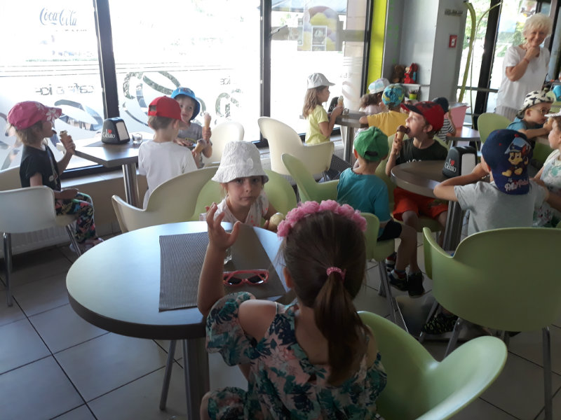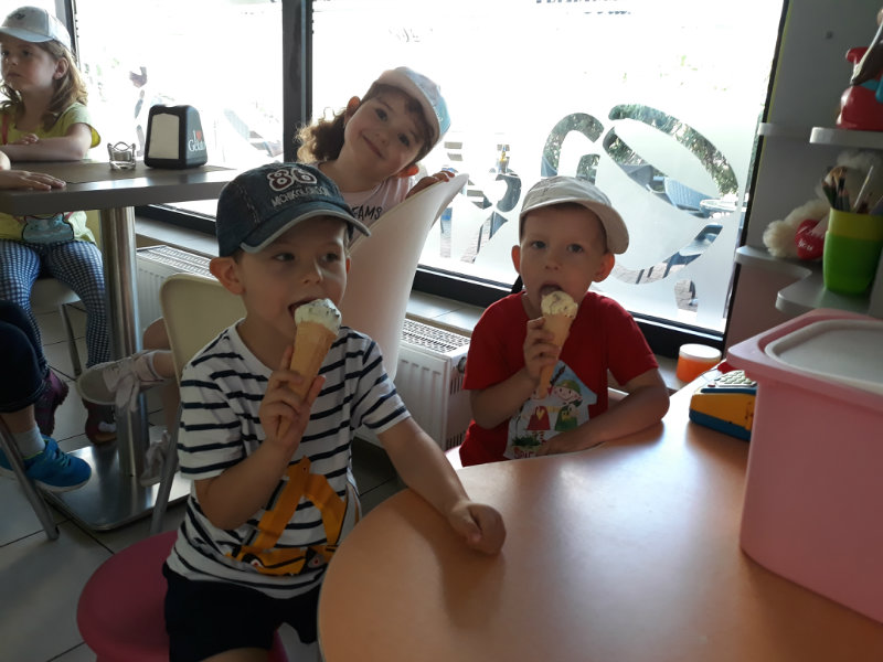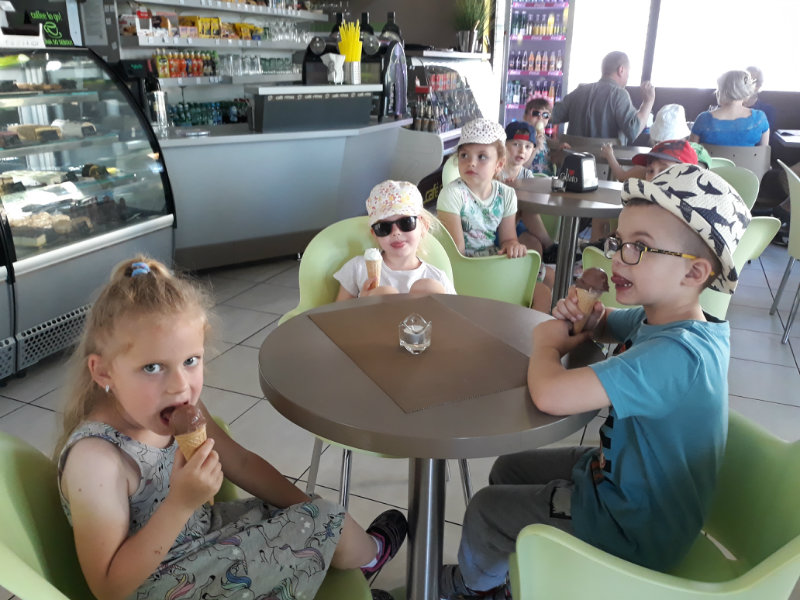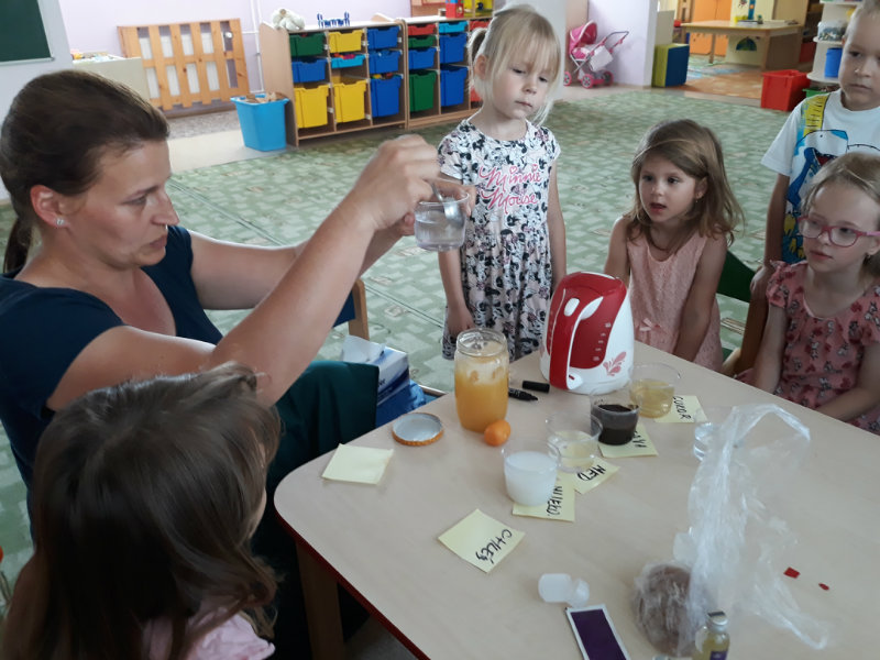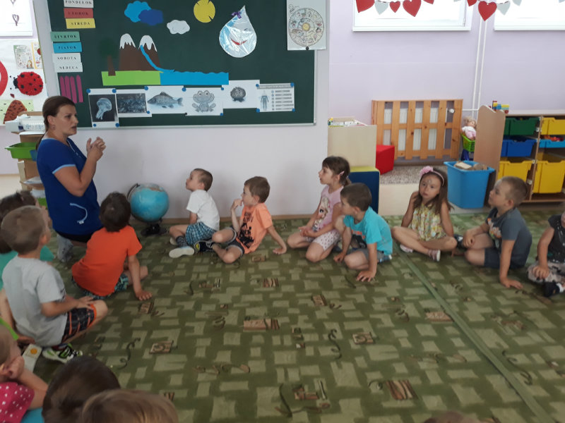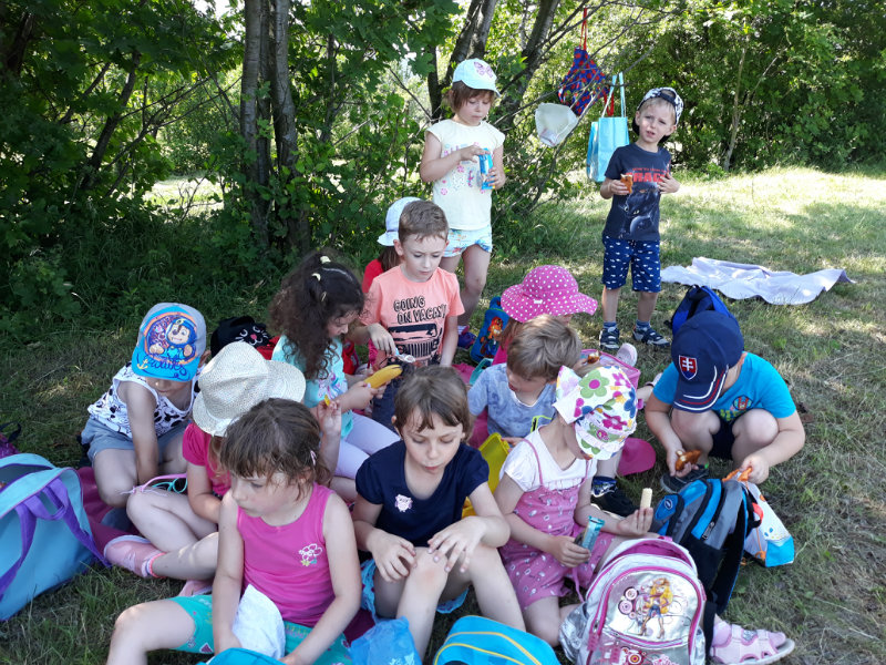 Posledný školský mesiac v roku JÚN sme začali sladkou pochúťkou. Vďaka p. J. Breštenskému si deti pri príležitosti Dňa detí vychutnali osviežujúcu zmrzlinu podľa vlastného výberu v príjemnom prostredí cukrárne. V tomto mesiaci sa počasie skutočne "predviedlo", a na zmrzlinu by sa dalo chodiť každý deň, takže téma O vode prišla práve vhod. Deti sa oboznámili o potrebe a spotrebe vody pre človeka, ako aj pre ostatnú prírodu. Prostredníctvom motivovaného príbehu "O Aničke Priesvitnej", pokusom s vyparovaním vody a piesňou Ako vznikajú mraky deti pochopili podstatu kolobehu vody, že voda je v oblakoch a v podobe dažďa padá na zem. Rozprávali sme si o premenách a úžitku vody. Skúmali a overovali, čo sa vode rozpustí, že rastliny pijú - nasávajú vodu korienkami, čím sme túto tému uzavreli myšlienkou - VODU POTREBUJÚ VŠETCI. Na turistickej vychádzke v blízkej prírode sme sa tiež museli osviežiť vodičkou, pretože nám slniečko doprialo pekné teplé počasie.