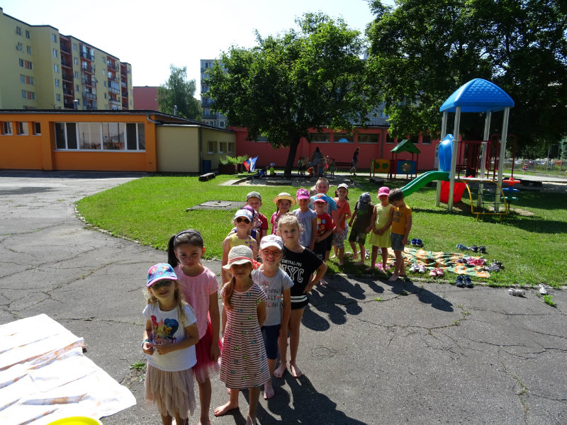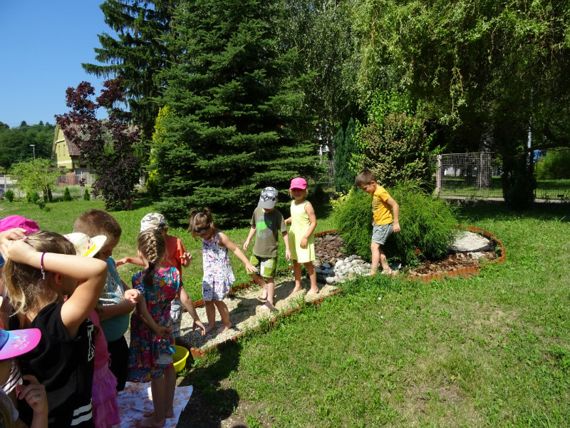 V utorok, 25.6., sme vyskúšali pocitový chodník v našej materskej škole. V tomto horúcom počasí sme sa veľmi tešili najmä na vedro s vodou, čo nás po pichľavých kamienkoch a šuškách dokonale osviežilo.