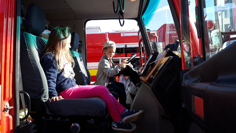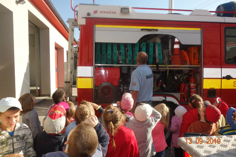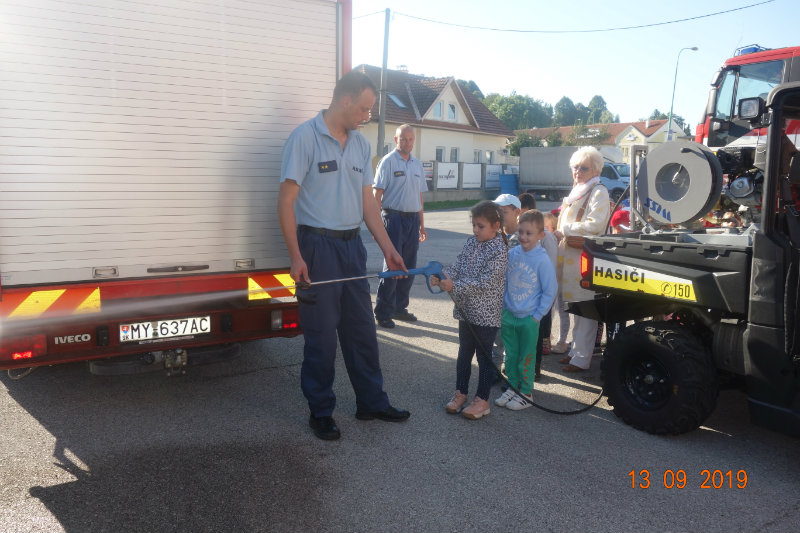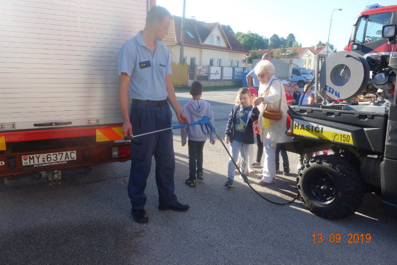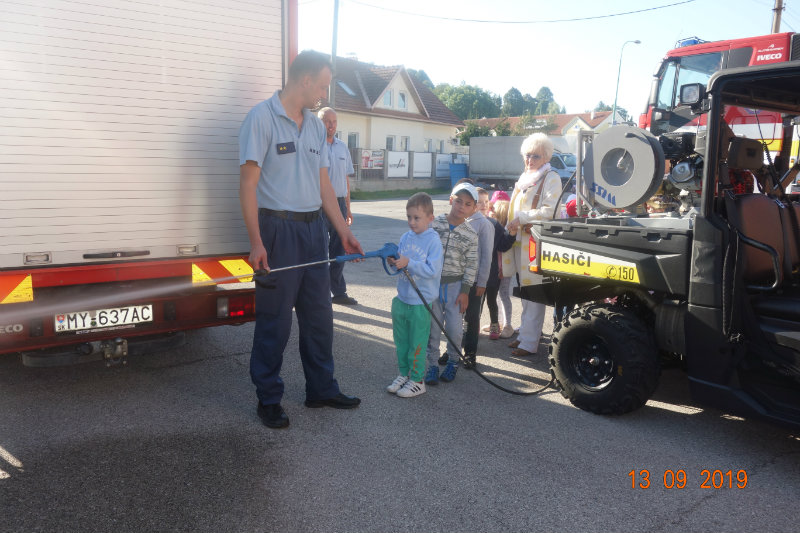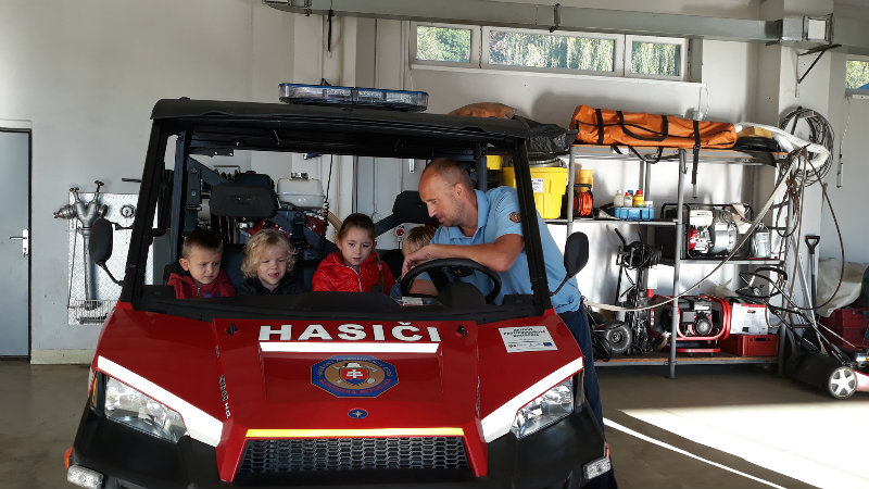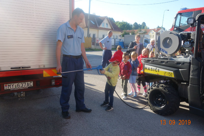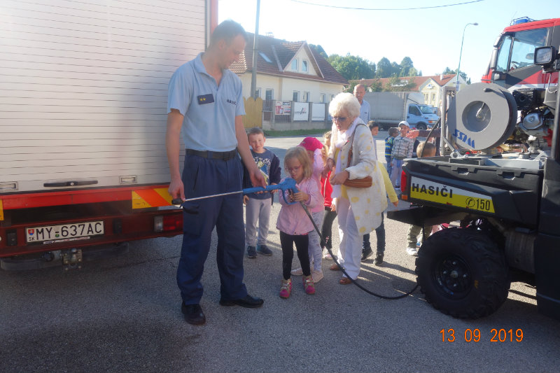 Deti z predškolských tried na exkurzii Hasičského a záchranného zboru na Myjave mali možnosť zblízka si pozrieť hasičskú techniku, výstroj hasičov, plynové masky, či vyskúšať hasičskú prilbu a odev. Obdivovali ako vysoko sa dá vysunúť rebrík na hasičskom aute. Posedeli si v hasičskom džípe, videli ako fungujú pneumatické nožnice určené na strihanie plechu. Zážitkom pre deti bolo vyskúšať si nožnicami strihanie plechu i striekanie z hadice. Za túto možnosť ďakujeme pánovi S. Zigovi a jeho kolegom.