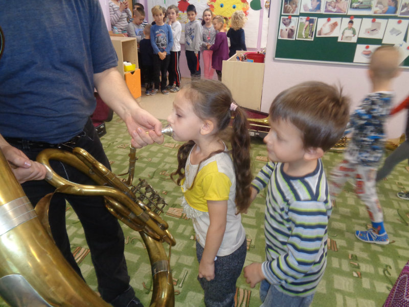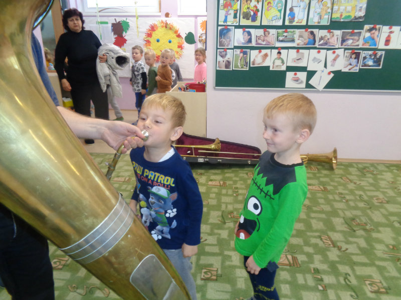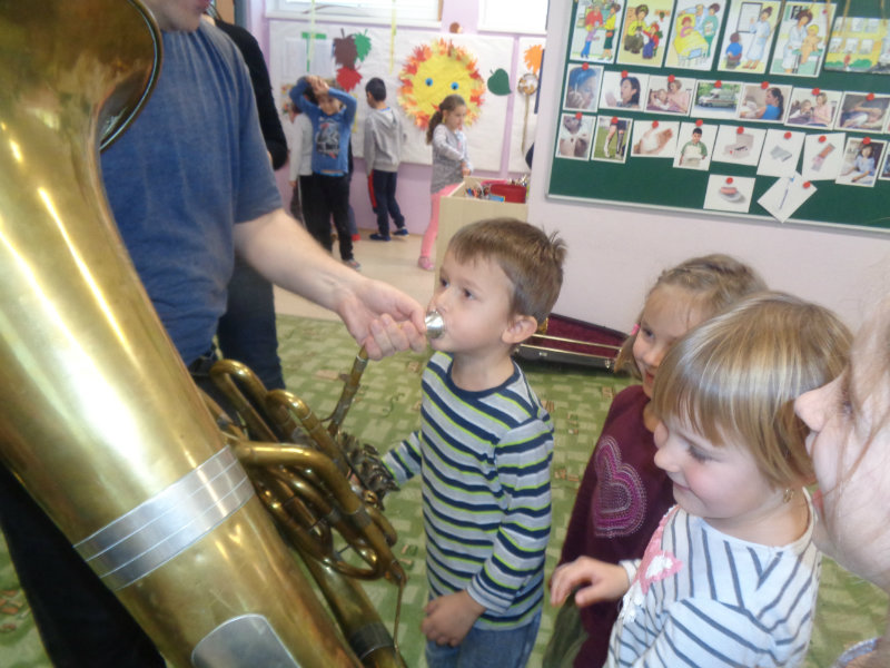 V utorok dopoludnia zavítal do MŠ pán Roman Ondrejka, ktorý pricestoval s mnohými zázračnými kuframi - plnými dychových plechových nástrojov. Pomocou pekného príbehu nás zoznámil s jednotlivými nástrojmi, ich názvami, dávnou minulosťou a z každého vylúdil známu pieseň a melódiu. Deti mali možnosť zaspievať si i fúknuť do toho najväčšieho, čo bolo pre nich naozajstným zážitkom. Ďakujeme.