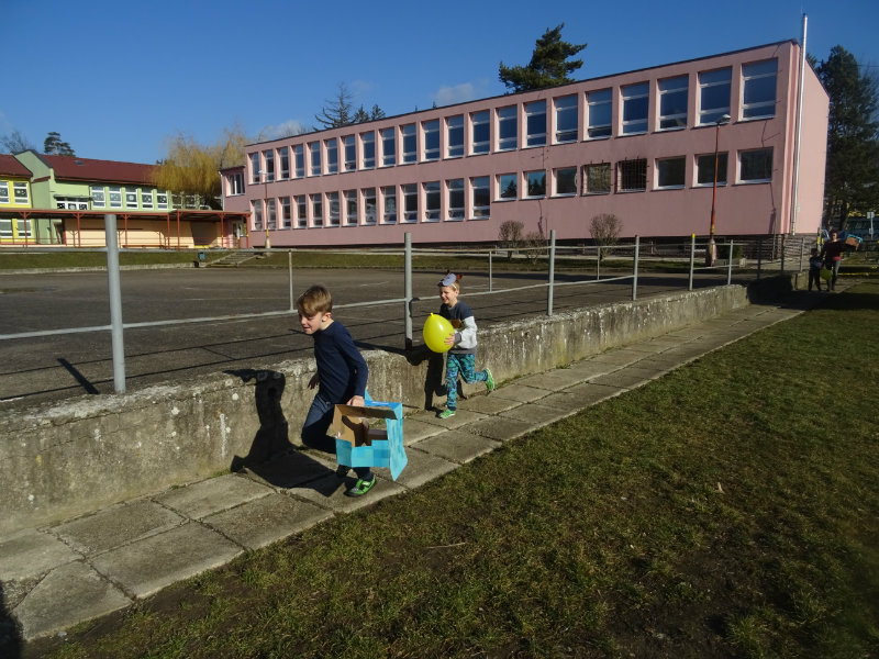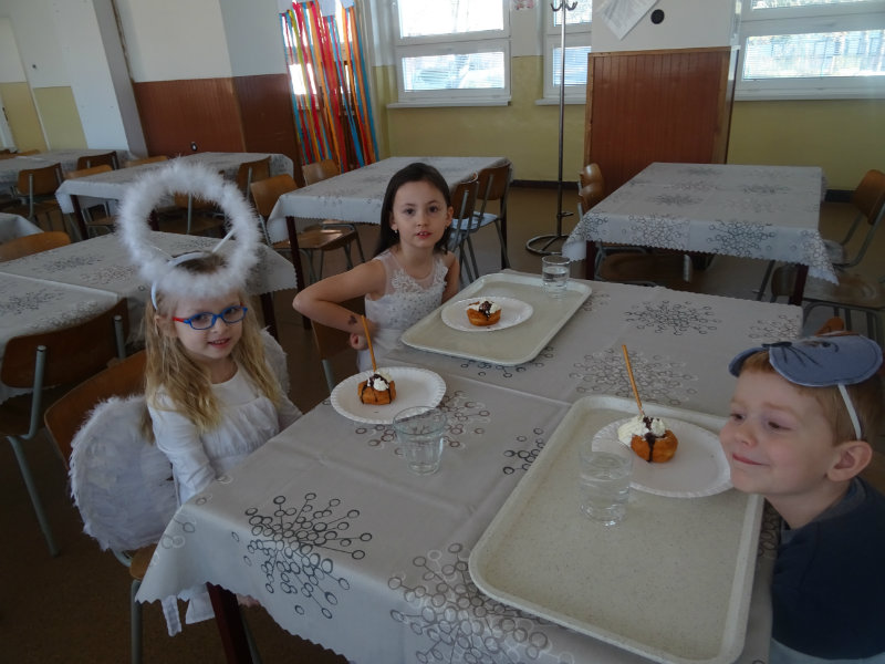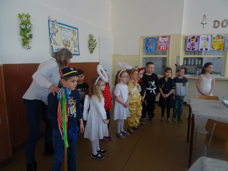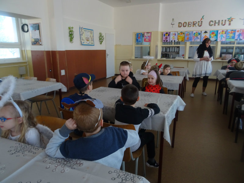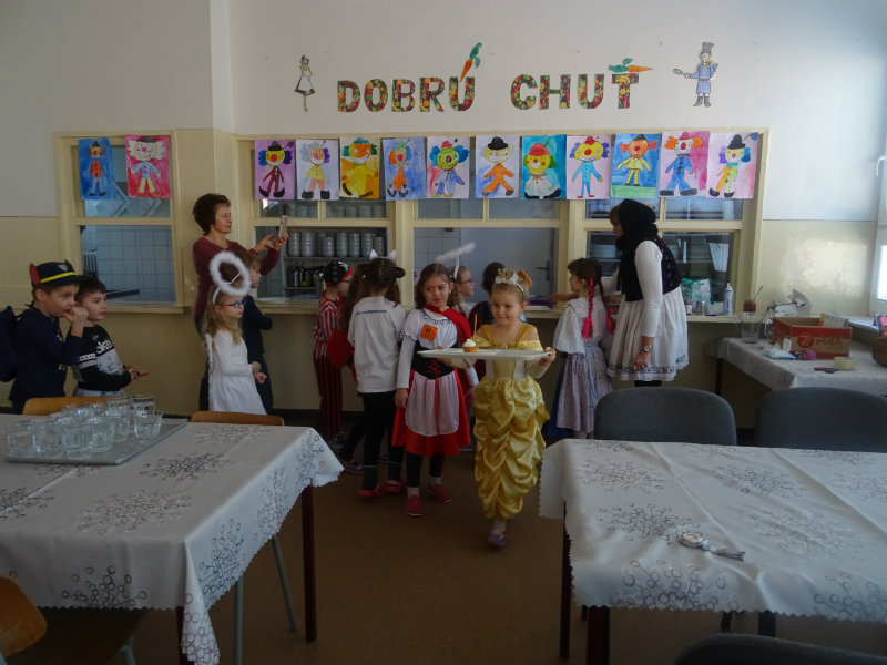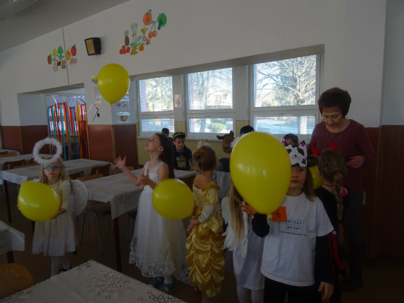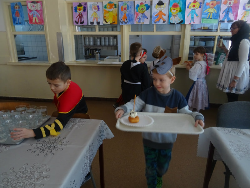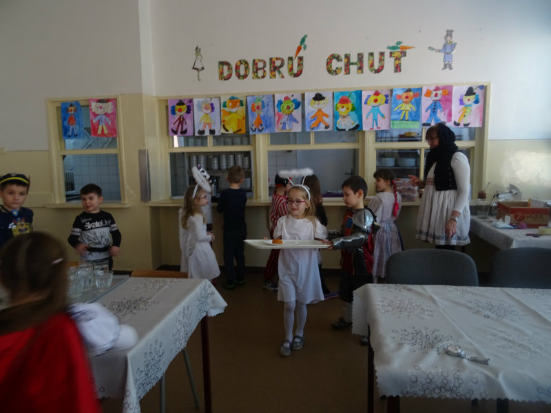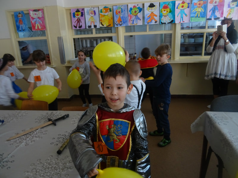 Vo štvrtok, 20.februára, nás pozvali naši kamaráti zo ZŠ na karneval. Pripravili si pre nás fašiangové prekvapenie - šišky s džemom alebo nutellou so šľahačkou a čokoládovým topingom. TO BOLA MŃAMKA! My sme pre nich vďaka tete Antalovej priniesli balóny. Súťažili sme, kto si svoj balónik dokáže sám nafúkať. Keď sme sa posilnili, presunuli sme sa do telocvične. To bolo priestoru na tancovanie! Zabavili sme sa, zatancovali, zasúťažili, bolo to veľmi príjemné stretnutie. Ďakujeme pani učiteľke Kotrasovej za krásne dopoludnie.