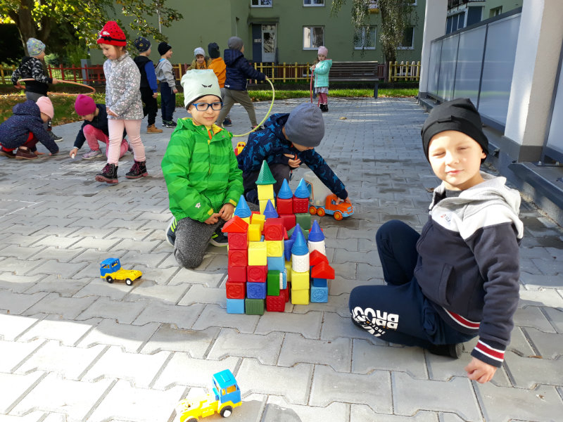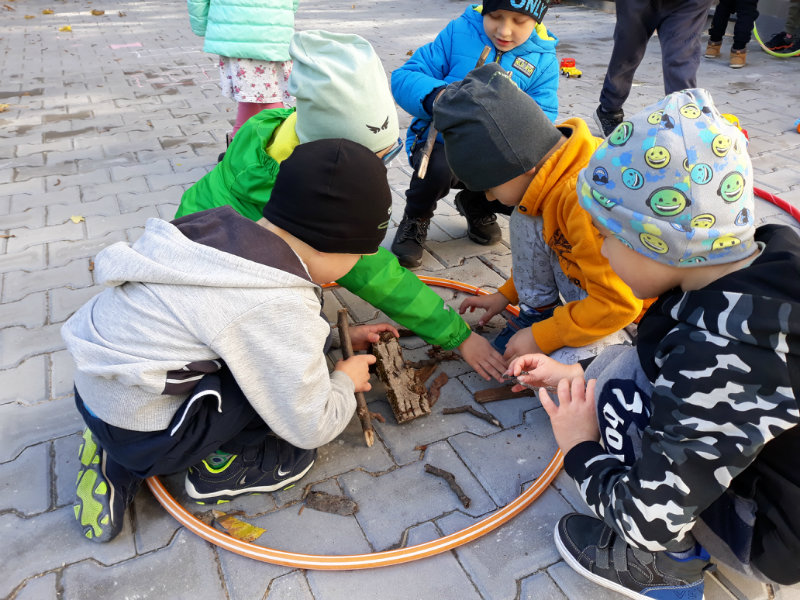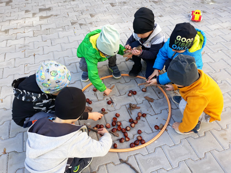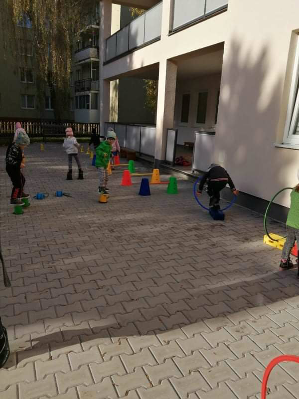 Po dažďových studených dňoch deti využili krásne jesenné počasie na školskom dvore, kde mali možnosť tvoriť rôzne obrazce z prírodnín ("na záver sme si opekali..."), športovo sa vyžili, utužovali svoje zdravie, odvážne preliezali i súťažili.