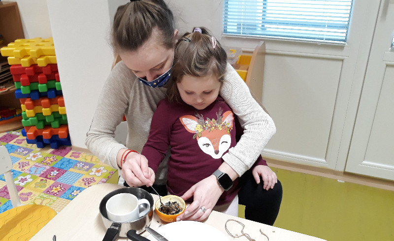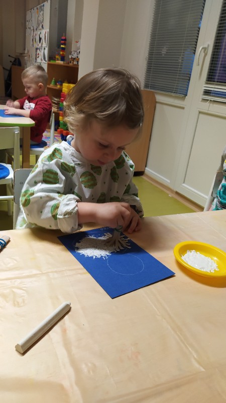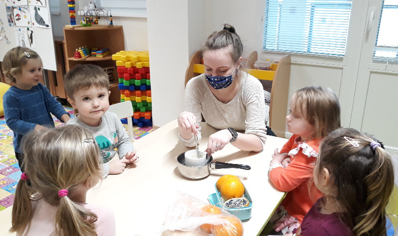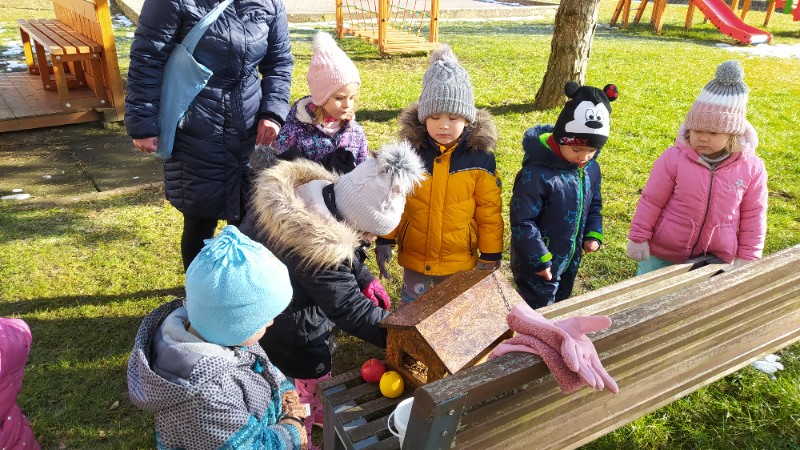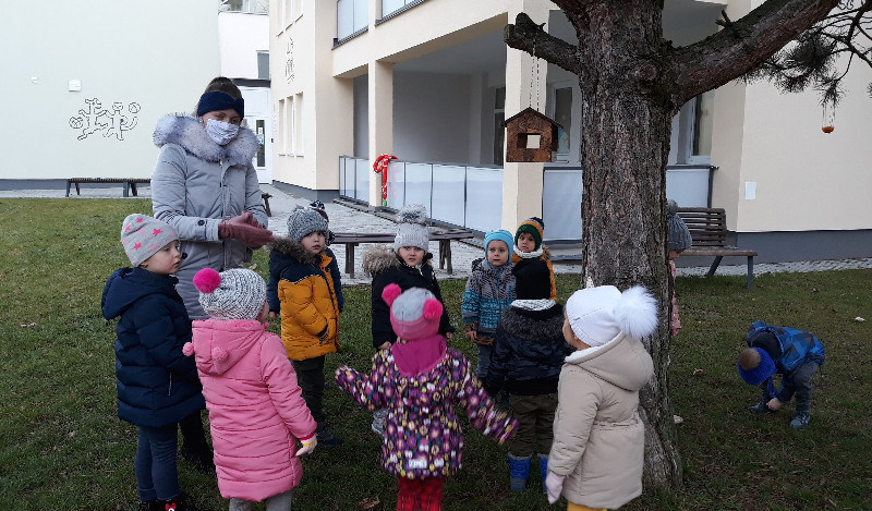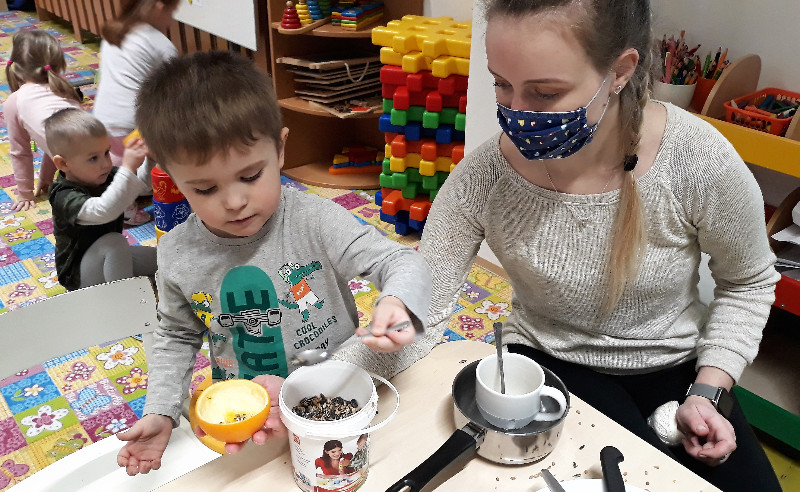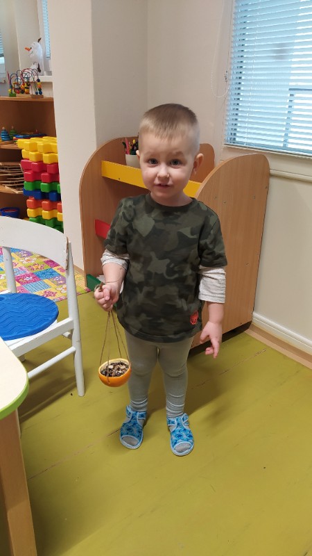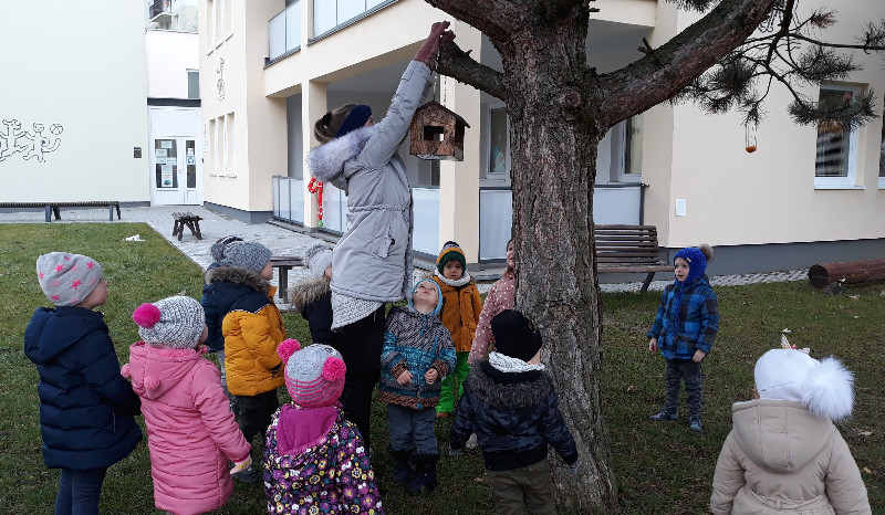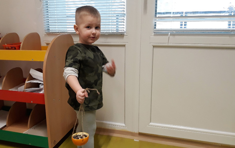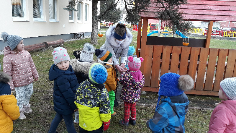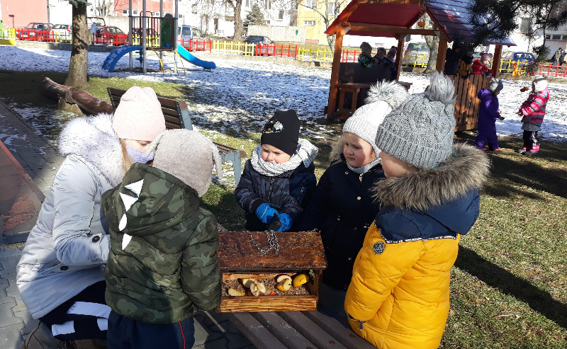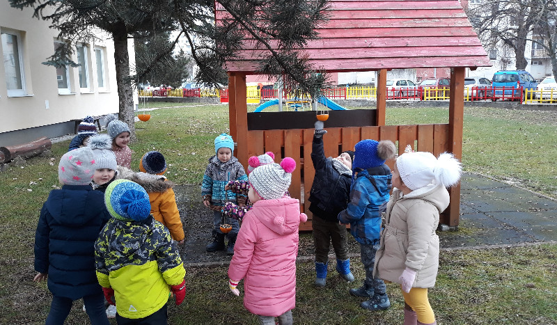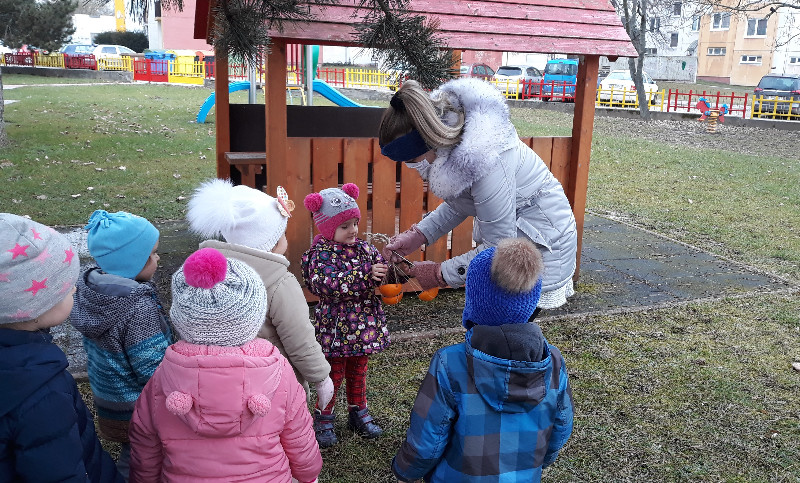 Teraz v zime deti vedia, že vtáčiky sú na tom zle a preto sme sa rozhodli urobiť kŕmidlá zo šupiek pomarančov. S pomocou p. učiteľky deti nasypali slnečnicové semienka do pomarančových pohárikov, zaliali roztopeným tukom a pripevnili špagátiky na zavesenie. Deti mali veľkú radosť, keď sme kŕmidlá zavesili na strom na školskom dvore. Do veľkej búdky, ktorú priniesli rodičia, sme ešte vtáčikom nasypali mak, slnečnicu a iné dobroty, ktoré potrebujú.