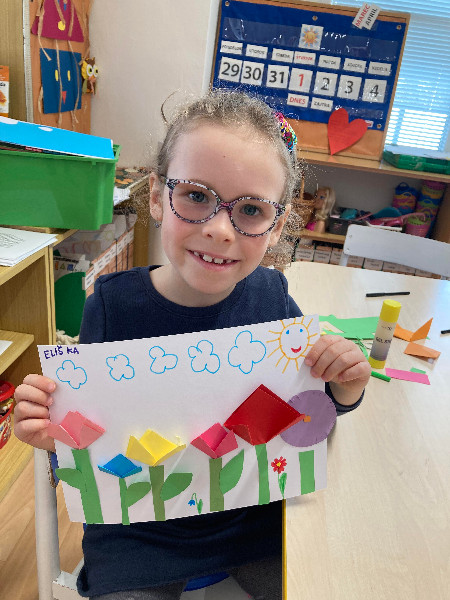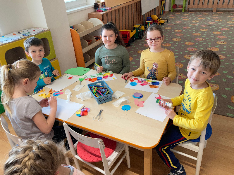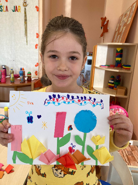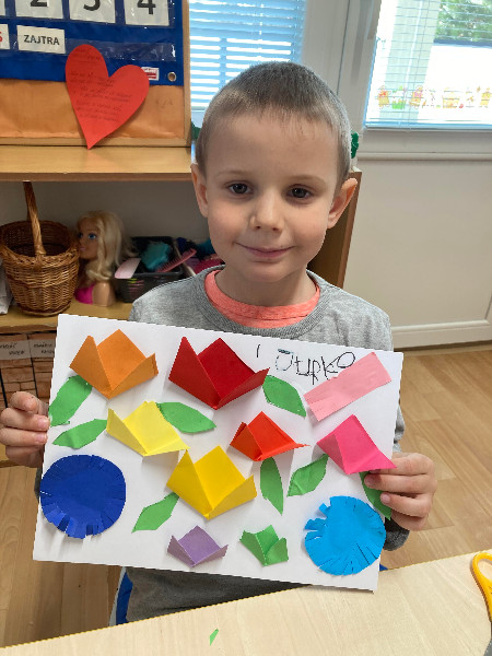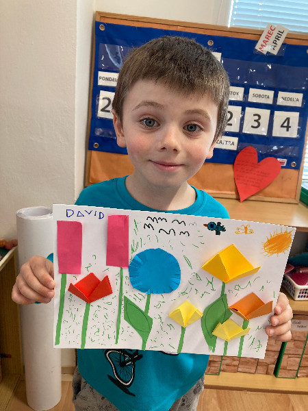 Predškoláci Usilovné včielky si precvičili jemnú i hrubú motoriku, kreativitu a prácu s farebným papierom s dodržiavaním čistoty pri práci s lepom tvorbou jarného obrazu Kvety a príroda.