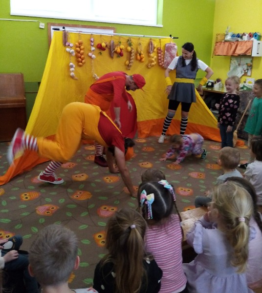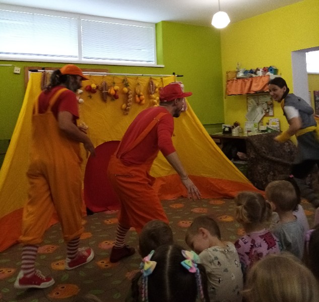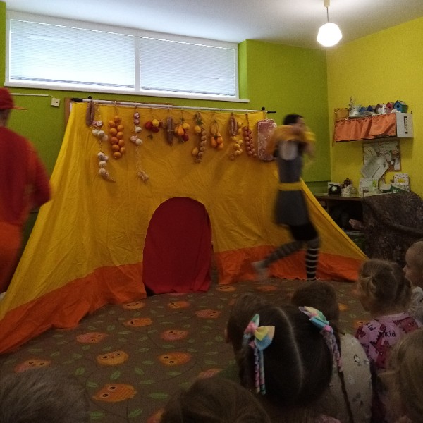 13.3.2025 bolo u nás veselo. Zavítalo k nám Divadlo Na traky s rozprávkou Dvaja leniví kocúri a myš.