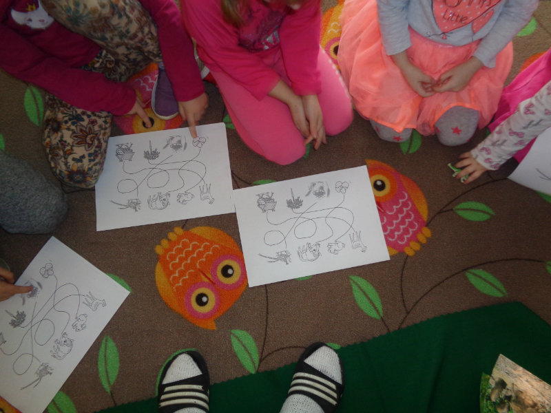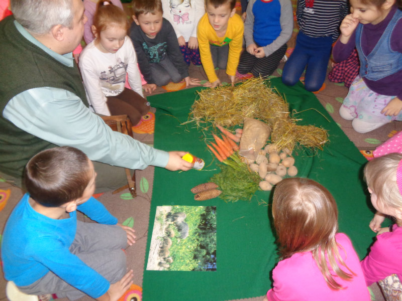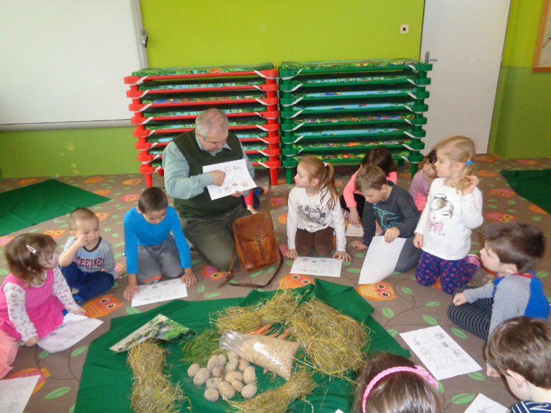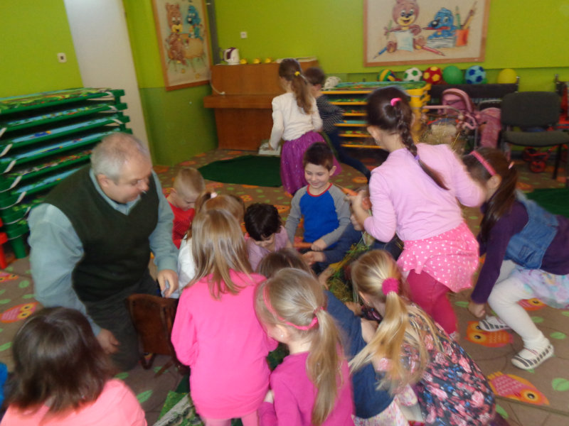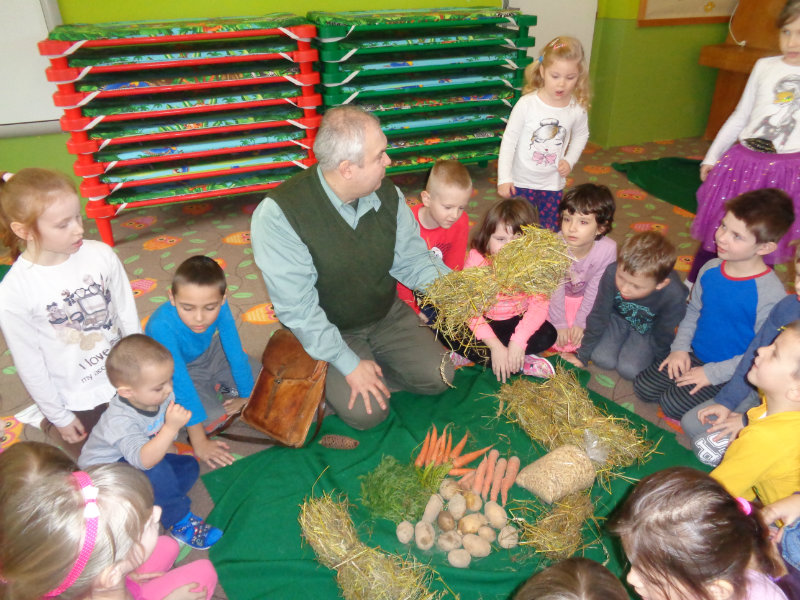 Rozprávali sme sa o tom, ako žijú zvieratká v zime. Vtedy vytiahol z batohu ujo Jožko veľmi zvláštne veci - seno, mrkvu, zrno a zemiaky. Postupne sme sa dozvedeli, ktoré lesné zvieratká by sme tým mohli v lese pohostiť. Dozvedeli sme sa i veľa zaujímavostí zo života zvierat v zimnom lese a zahrali sme sa rôzne hry - ako sa kŕmia zvieratká, líšky naháňali zajačikov, poznávali sme zvuky lesa...