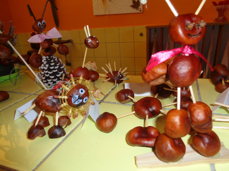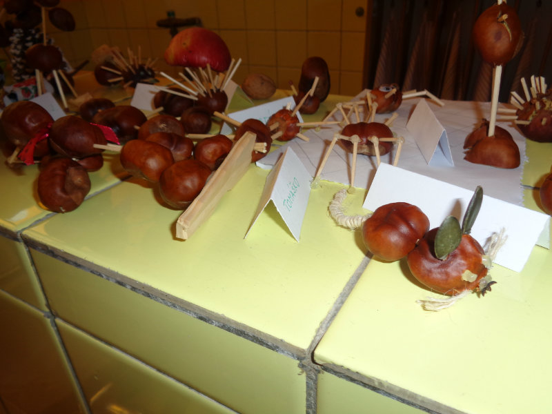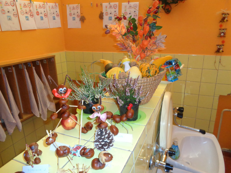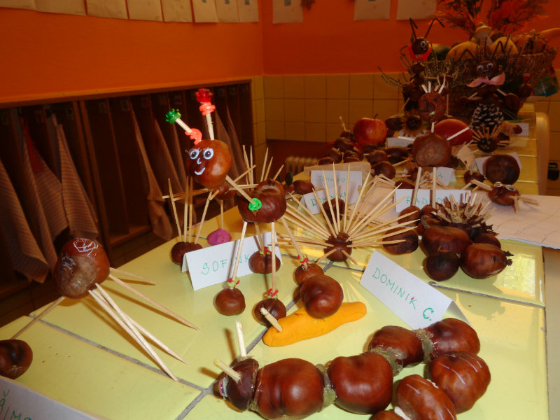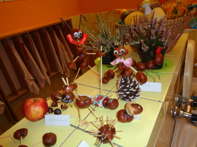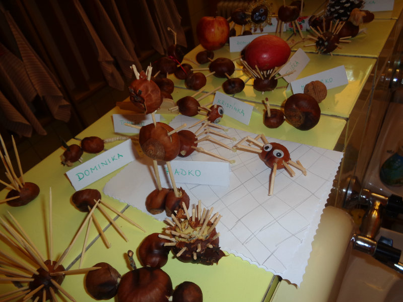 Rodičia so svojimi ratolesťami vyrábali doma z gaštanov rôzne zvieratká a postavičky. Priniesli ich do škôlky, a tak vznikla naša krásna výstavka, ktorá nám skrášľuje priestory umyvárne.