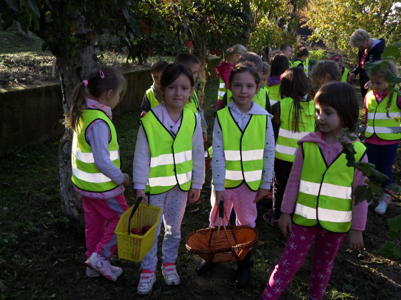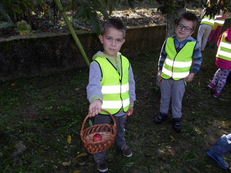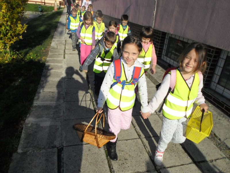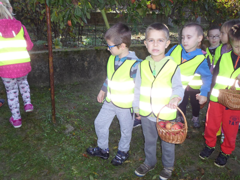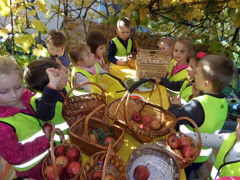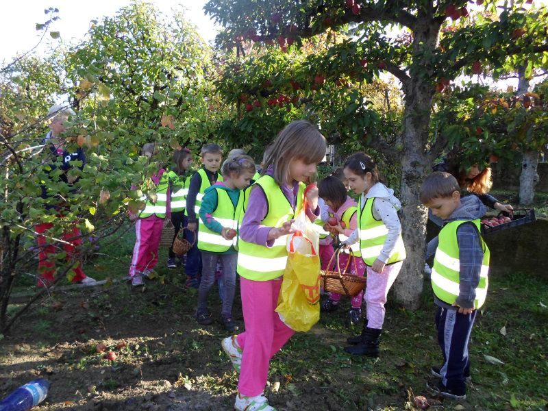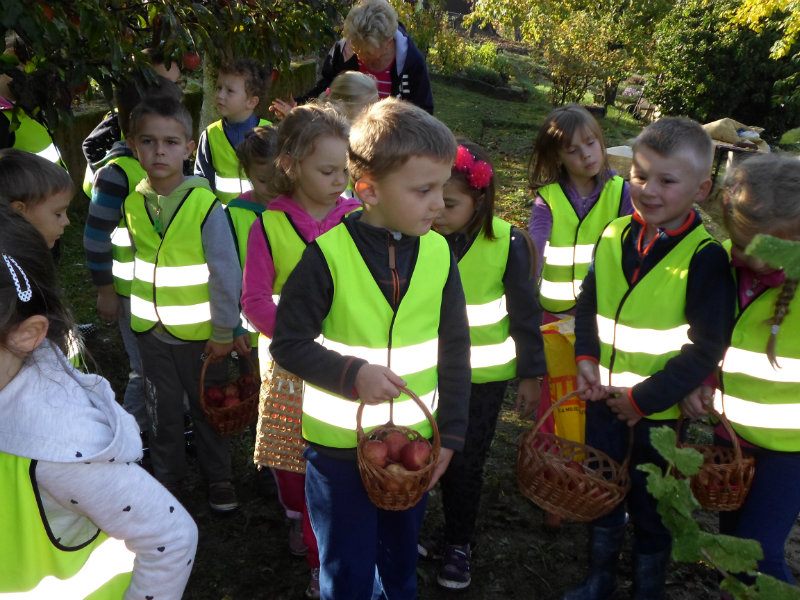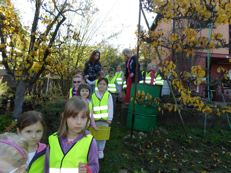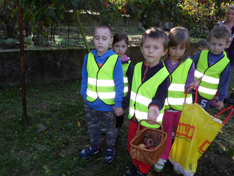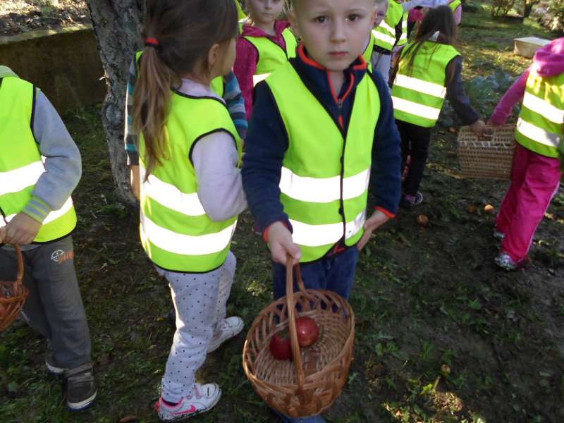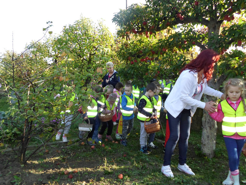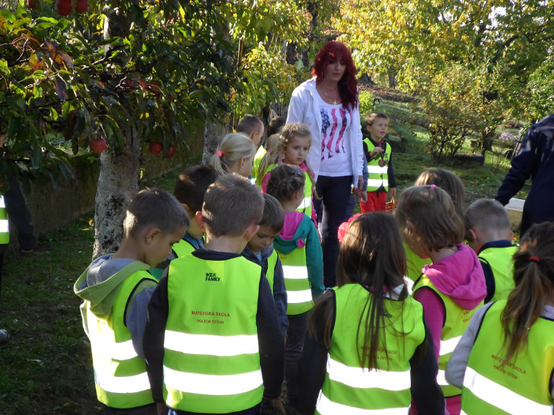 Oberačka jabĺk v sade u babičky. Deti sa zoznámili s jesennými prácami, zberom úrody a jej uskladnením. S košíkmi rukách sme sa vybrali do záhradkárskej oblasti nad Starou Turou, k babičke našej Sari Nor, k pani Vičíkovej. Pozvala nás, aby sme jej pomohli obrať v sade jabĺčka. Po príchode sme sa pustili do práce. Po dvojiciach sme zbierali úrodu a opatrne sypali jabĺčka do pripravenej debničky. Keď sme boli s prácou hotoví, pozvali nás domáci ku stolu na ,,oldomáš". Pohostili nás nakrájanými jabĺčkami, hroznom, čokoládkami. Po občerstvení, sme si spravili veselicu, na ktorej sme si zaspievali známe piesne: Bolo raz jabĺčko krásne, Červené jabĺčko vo vrecku mám, Jeseň pani bohatá, Jeseň už prilieta po chotári, zarecitovali básne Spadla hruška zelená, Ja som slivka slivôčka...Zo susednej záhrady nás pán záhradkár pozval na výstavu kaktusov. Obdivovali sme rôzne tvary, veľkosti, pichliače, kvety. V ďalšej záhrade nám ujo ukázal, ako sa rýľuje, a pripravuje pôda na zimu. Rozlúčili sme sa, poďakovali a s príjemnými zážitkami sme sa vrátili do MŠ.