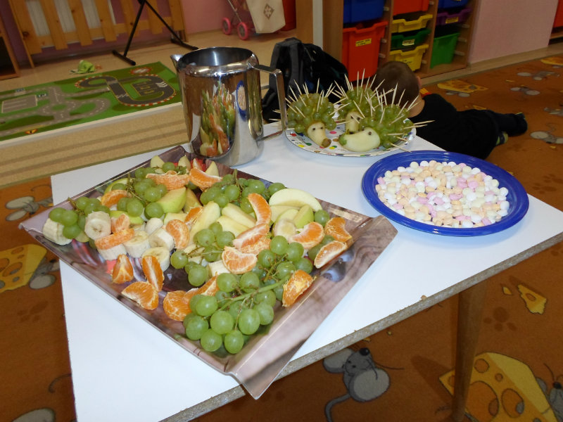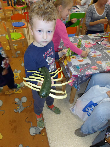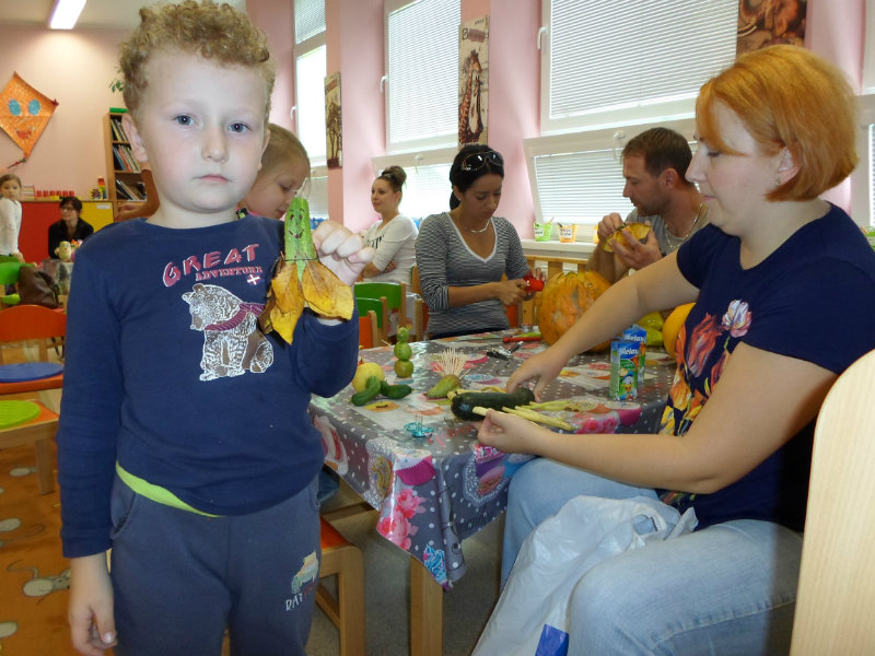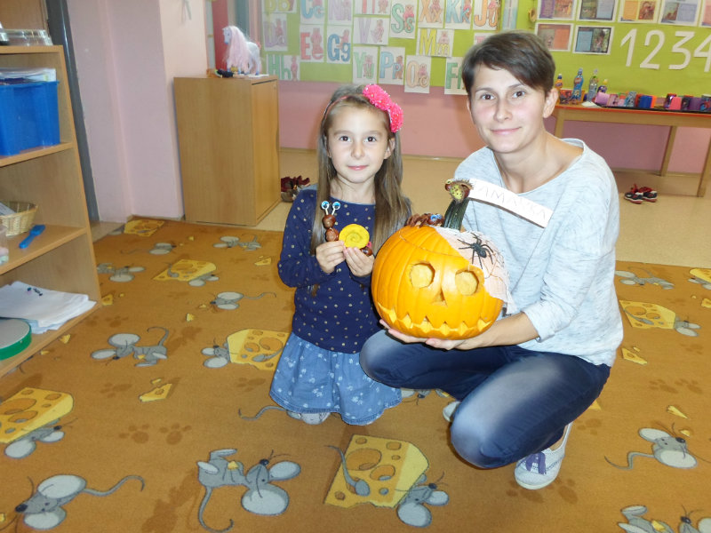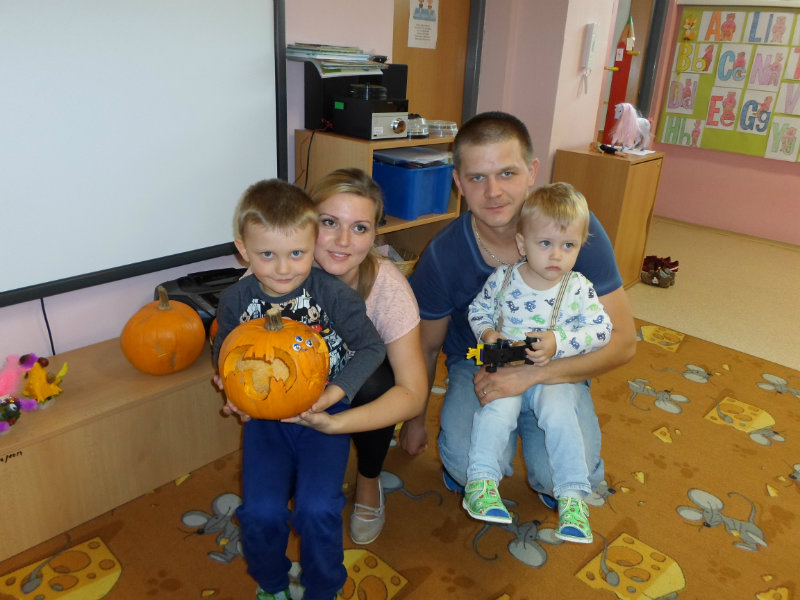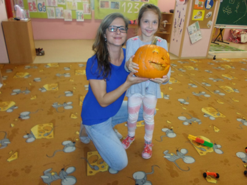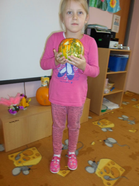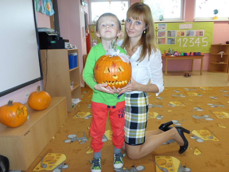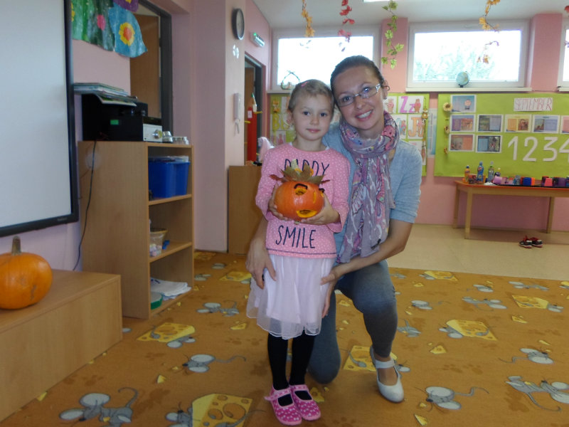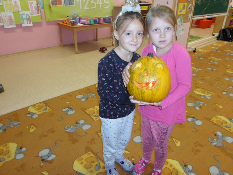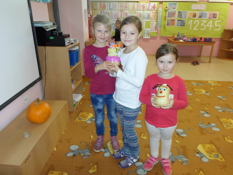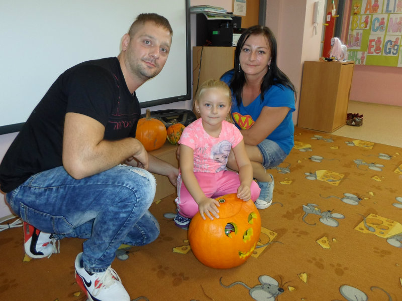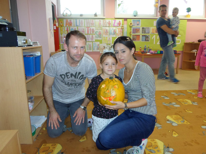 Výroba svetlonosov z dýň popoludní s rodičmi. Rodičia priniesli popoludní do MŠ dyne a rôznu zeleninu. Podľa tradície vyrezávali svetlonosov, do vnútra dali sviečku, aby svietil. Pred pracovnou aktivitou si deti pripravili pre rodičov kultúrny program s básničkami a pesničkami o jeseni a zahrali sa pohybové hry. Ako odmenu deti dostali nakrájané ovocie, aby sme podporovali zdravý životný štýl. Deti mali radosť, že môžu vystupovať pred rodičmi i zo spoločnej práce s rodičmi. Z hotových prác sme si urobili výstavku na chodbe a každé dieťa nám predstavilo svojho svetlonosa.
