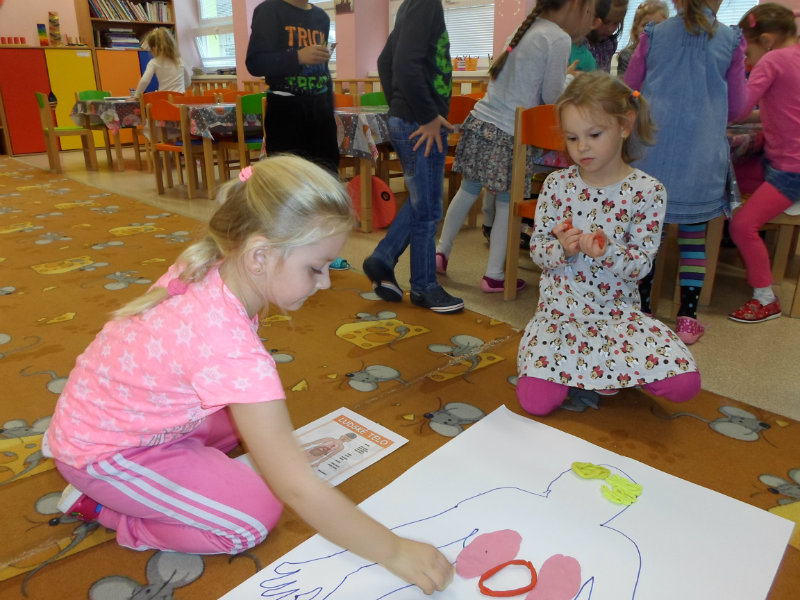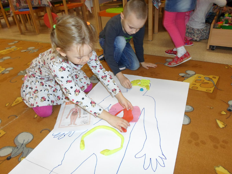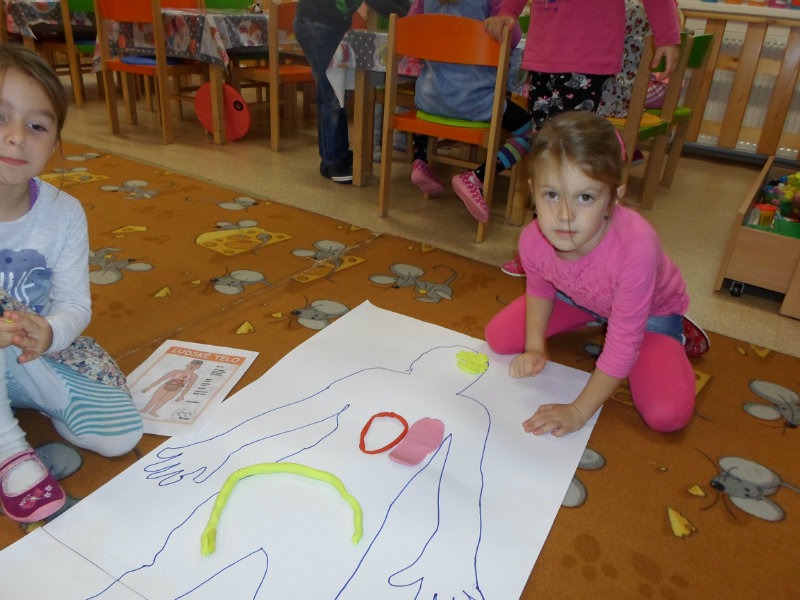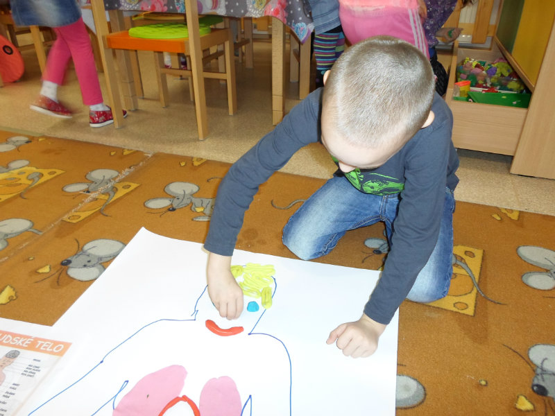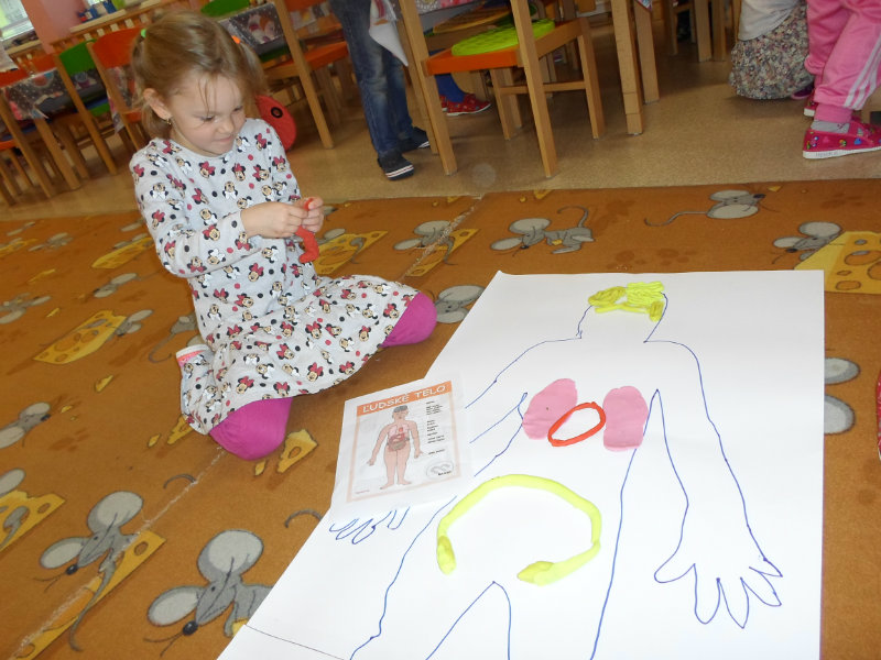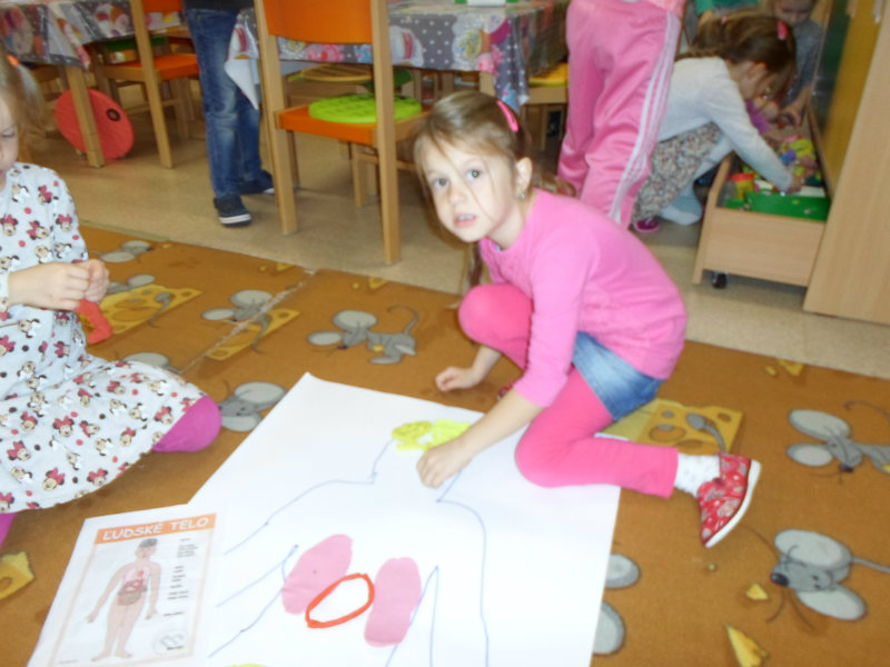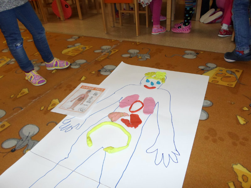 Deti si utvrdzovali poznatky o ľudskom tele. Pozerali prezentáciu, čítali encyklopédie, rozprávali sa o vnútorných orgánoch, ich činnosti a dôležitosti, spoznávali zmysly a príslušné orgány. Tvorili ľudské telo zo skladačiek a z plastelíny, vkladali doň srdce, pľúca, obličky, pečeň, žalúdok, hrubé a tenké črevo a popisovali ich činnosť. Učili sa chápať význam zdravého životného štýlu pre zdravie človeka.