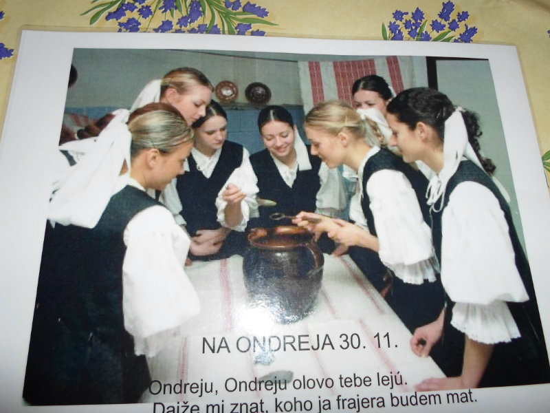 Na Ondreja : Ak chceli dievčatá vedieť, za koho sa vydajú, čarovali s olovom /voskom/. Liali ho do vody a pri tom odriekali magické slová: .... Rukou ho zhŕňali dokopy, do jedného tvaru. Keď stuhlo, hľadali v ňom podobu svojho, budúceho ženícha. Keď sa tvar podobal na rybu, dievča sa vydá za rybára.