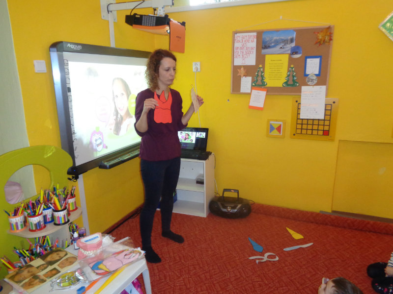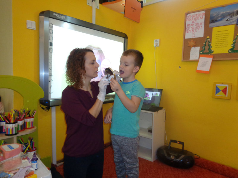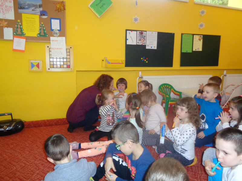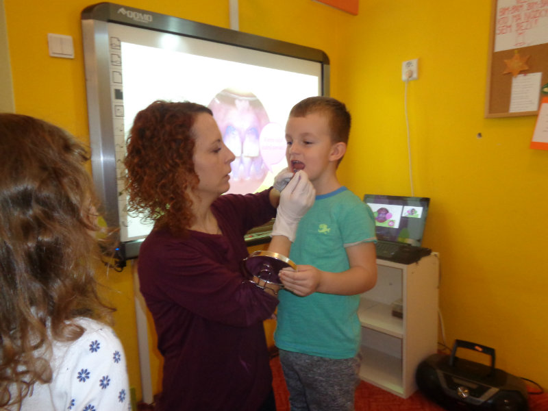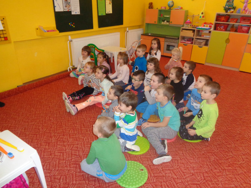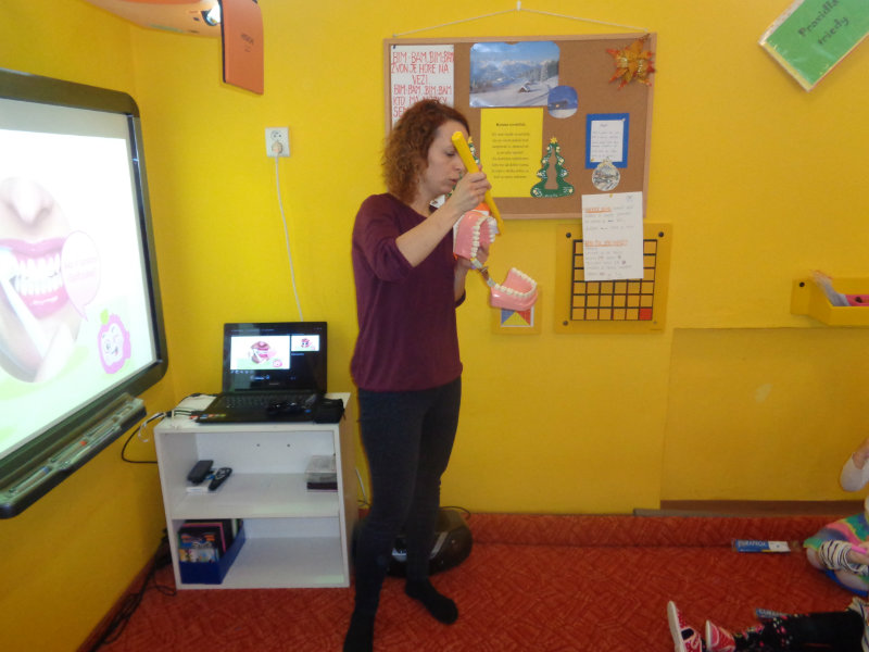 Posledný novembrový týždeň v našej triede bol zameraný na starostlivosť o zúbky. Deti si priniesli z domu svoje zubné kefky a rozprávanie o dentálnej hygiene sa mohlo začať. Teta dentálna hygienička, p. Izakovičová, nám ukázala ako sa starať o ústnu dutinu, ako správnym čistením zúbkov predchádzať vzniku zubných kazov a čo robiť, aby boli detské zúbky biele ako perličky. Deti sa okrem správnej techniky čistenia zúbkov zaujímavou a pútavou formou dozvedeli o zložení zúbkov a o mliečnom a trvalom chrupe. Dentálna hygienička deťom vysvetlila, aké je dôležité starať sa o svoje zúbky pravidelne, a aby na svoje zúbky nezabúdali, na záver dostali darček v podobe detskej zubnej kefky.
