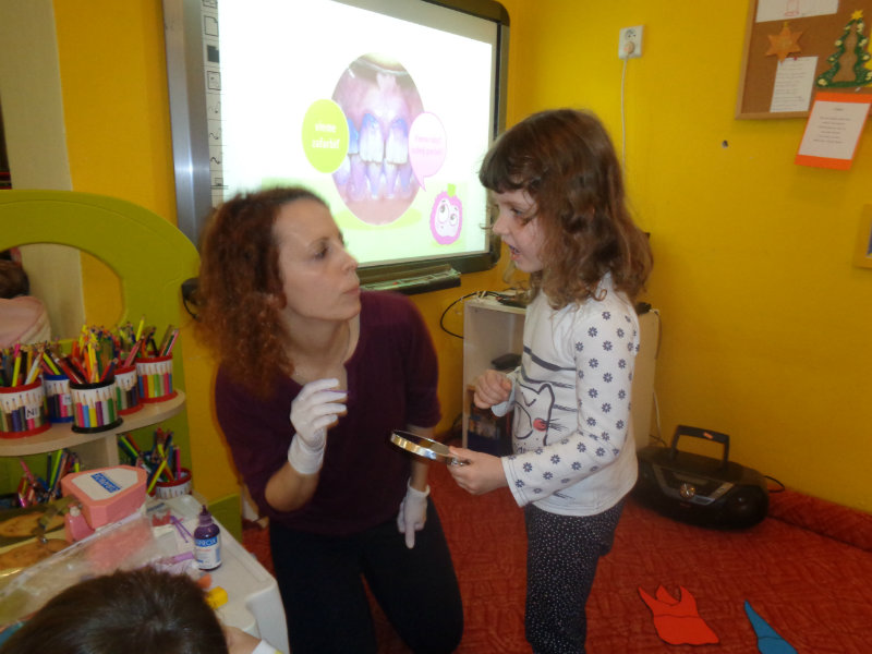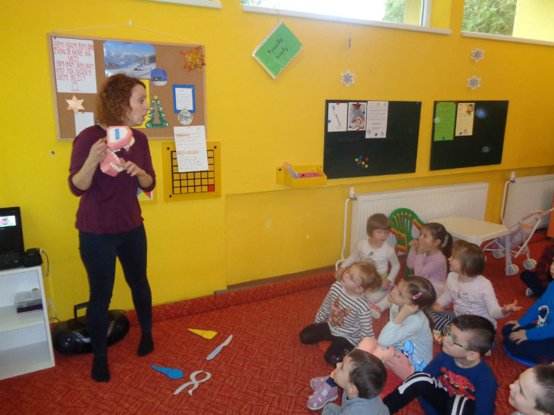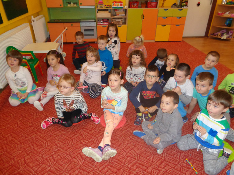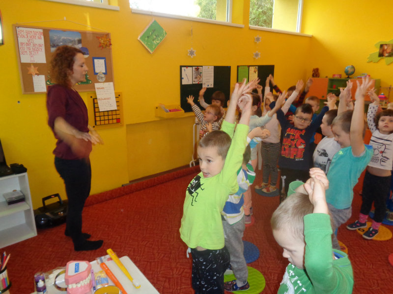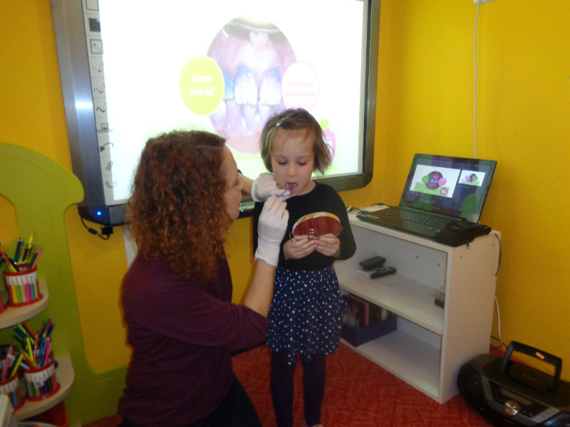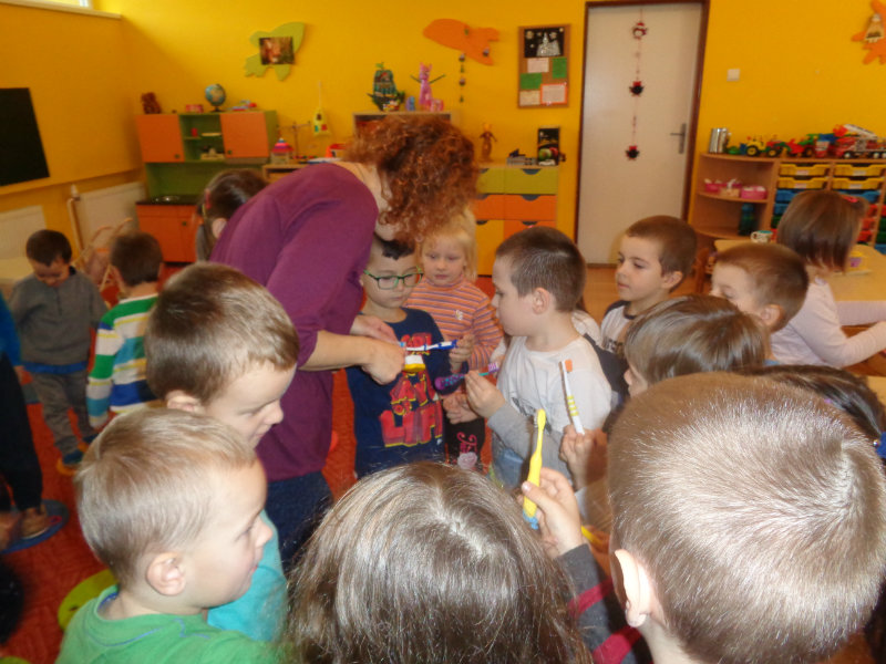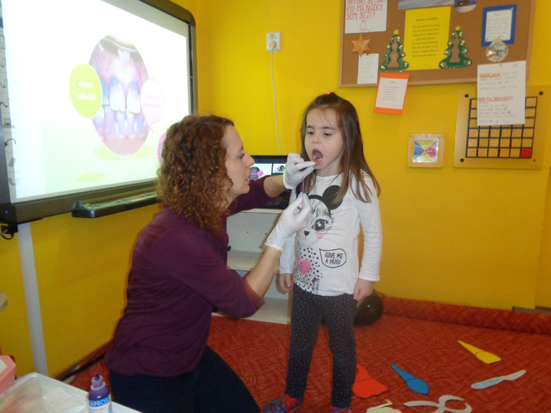 Posledný novembrový týždeň v našej triede bol zameraný na starostlivosť o zúbky. Deti si priniesli z domu svoje zubné kefky a rozprávanie o dentálnej hygiene sa mohlo začať. Teta dentálna hygienička, p. Izakovičová, nám ukázala ako sa starať o ústnu dutinu, ako správnym čistením zúbkov predchádzať vzniku zubných kazov a čo robiť, aby boli detské zúbky biele ako perličky. Deti sa okrem správnej techniky čistenia zúbkov zaujímavou a pútavou formou dozvedeli o zložení zúbkov a o mliečnom a trvalom chrupe. Dentálna hygienička deťom vysvetlila, aké je dôležité starať sa o svoje zúbky pravidelne, a aby na svoje zúbky nezabúdali, na záver dostali darček v podobe detskej zubnej kefky.