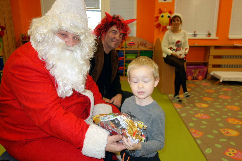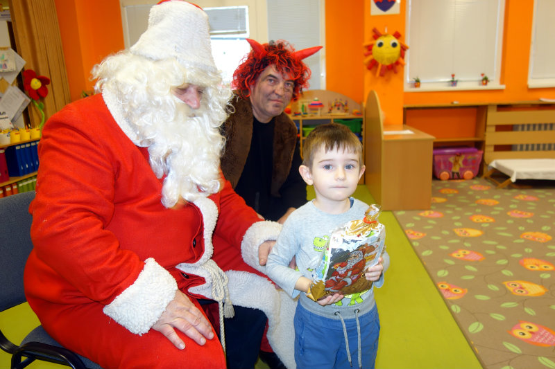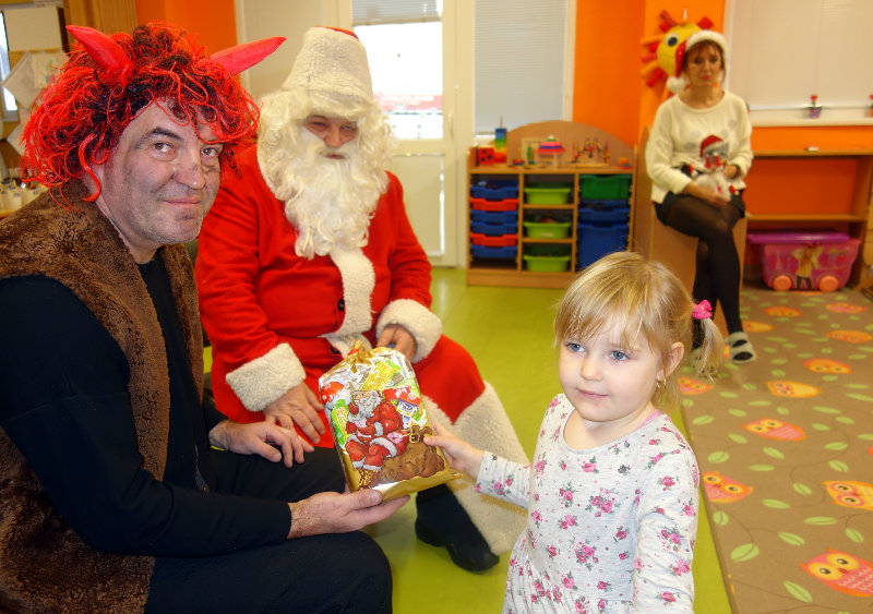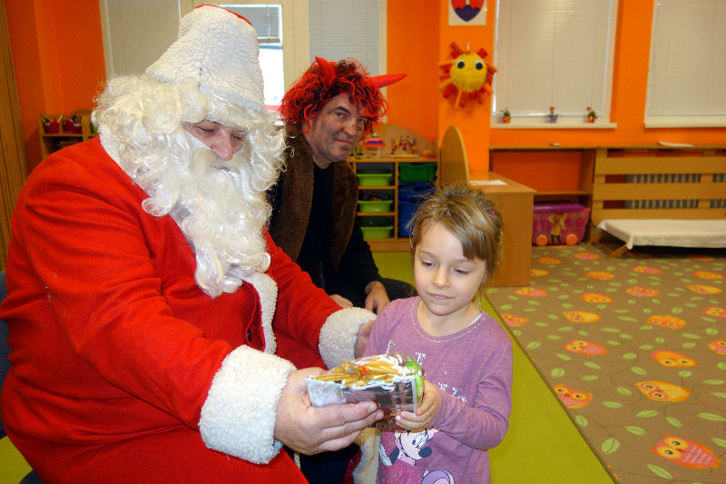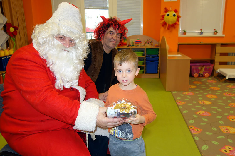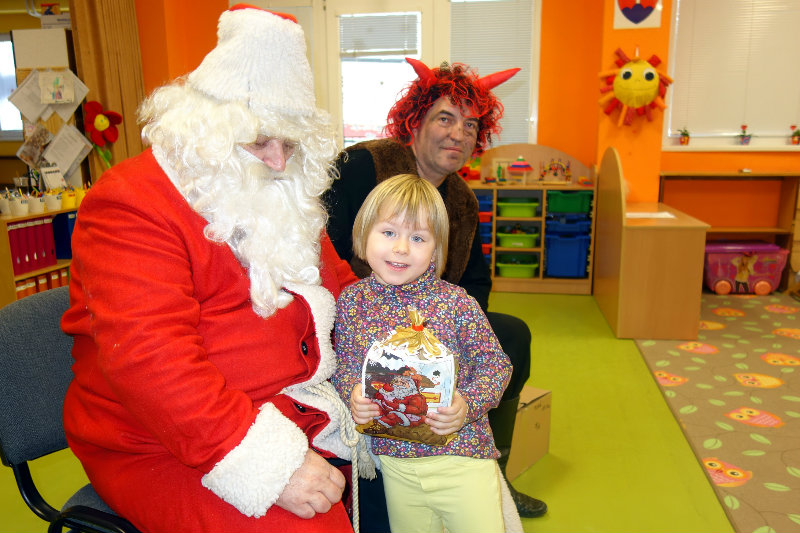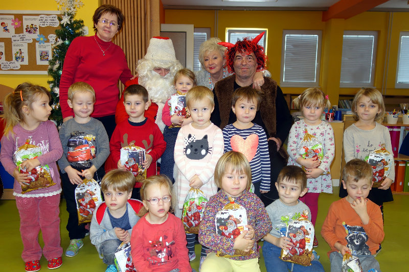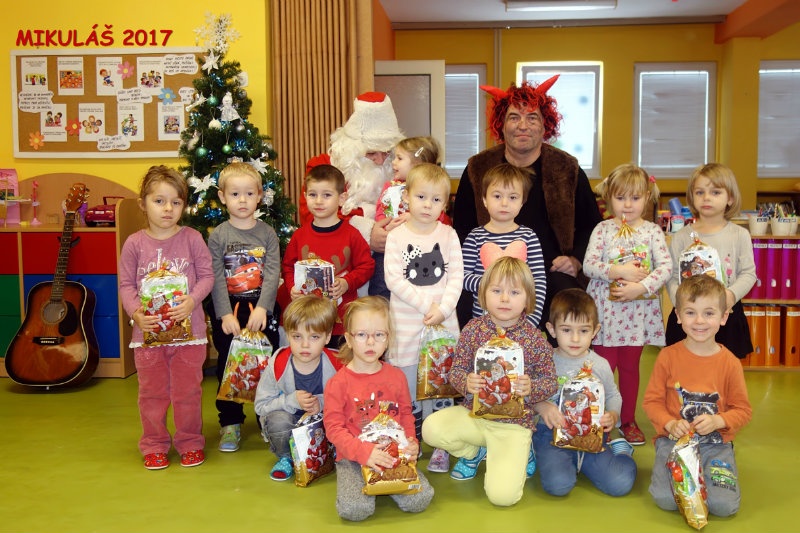Keď je vonku sneh a mráz, navštívi nás Mikuláš. Príde len raz v každom roku, čerta má po svojom boku. Našu škôlku navštívili, všetky deti obdarili. Ďakujeme, Mikuláš, tešíme sa o rok zas.