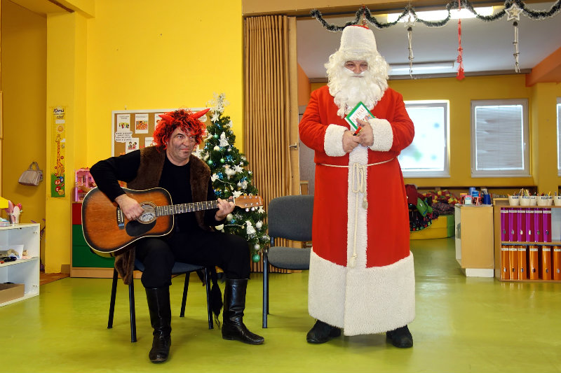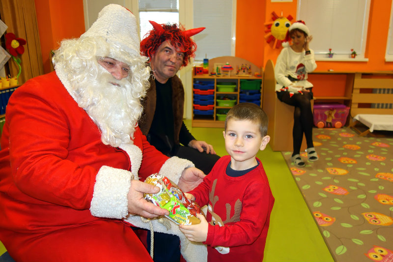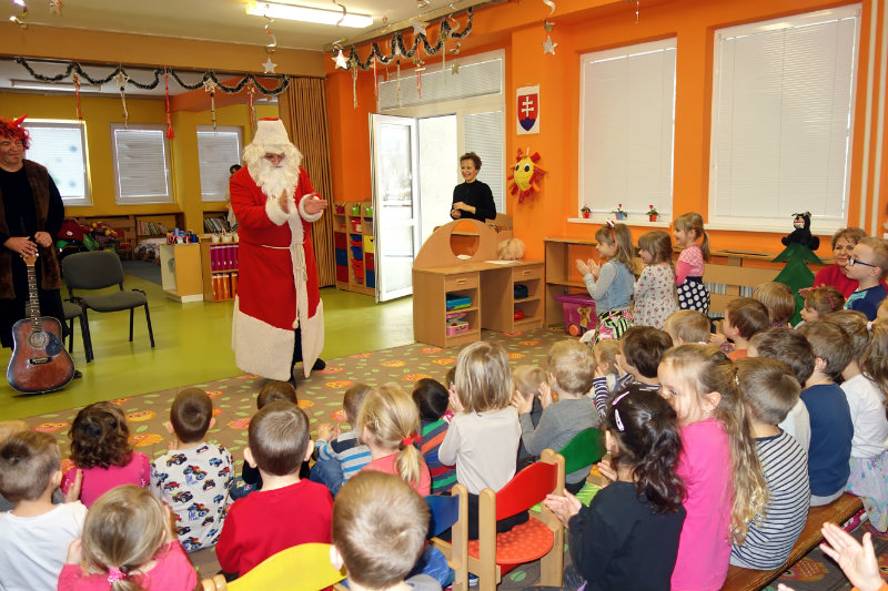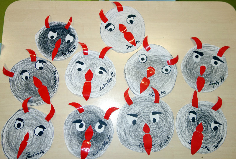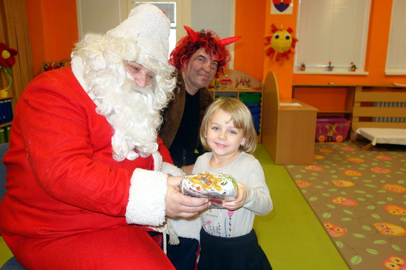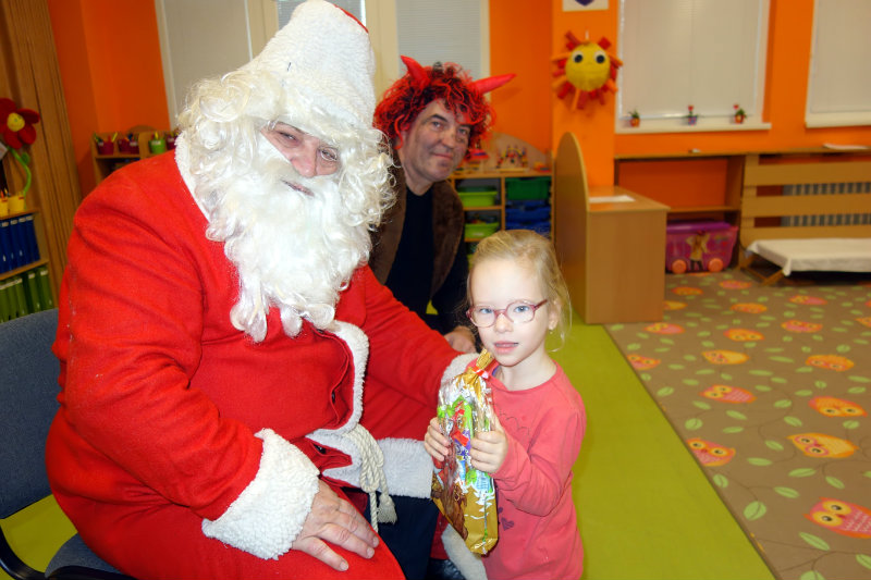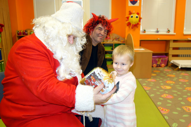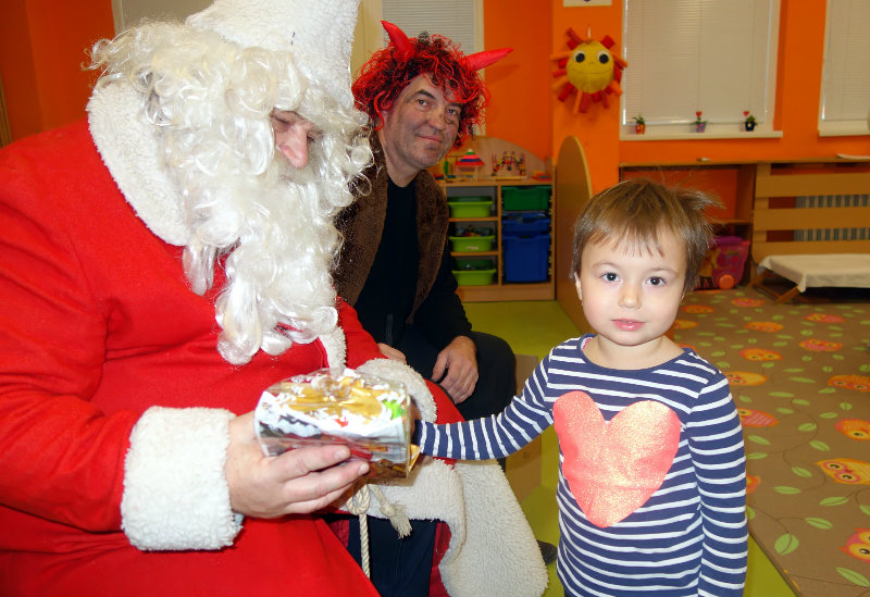 Keď je vonku sneh a mráz, navštívi nás Mikuláš. Príde len raz v každom roku, čerta má po svojom boku. Našu škôlku navštívili, všetky deti obdarili. Ďakujeme, Mikuláš, tešíme sa o rok zas.