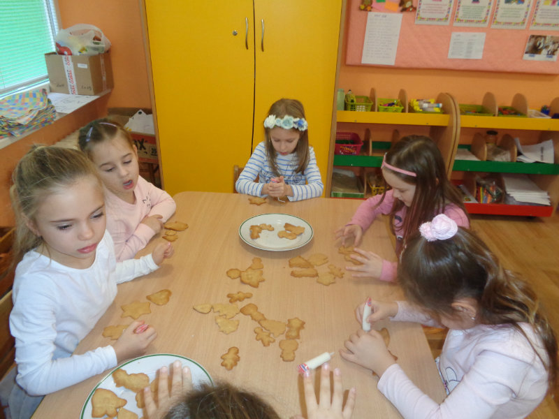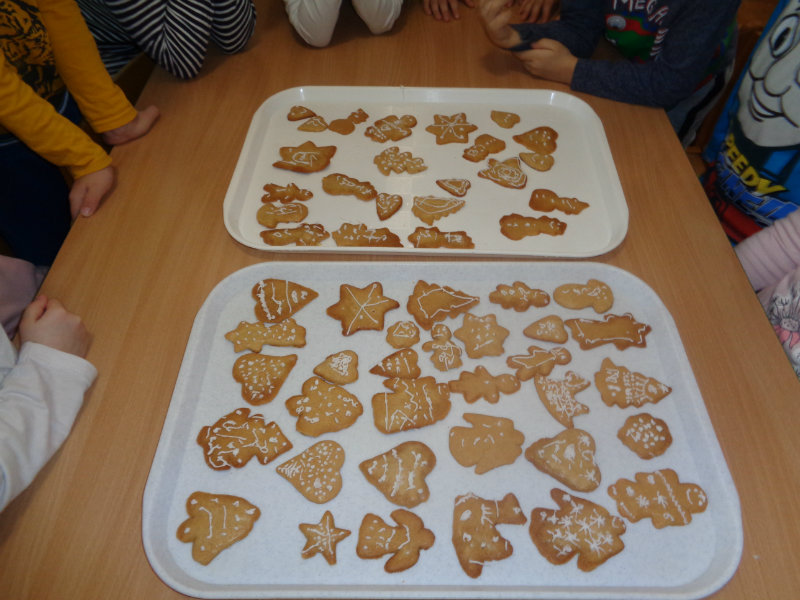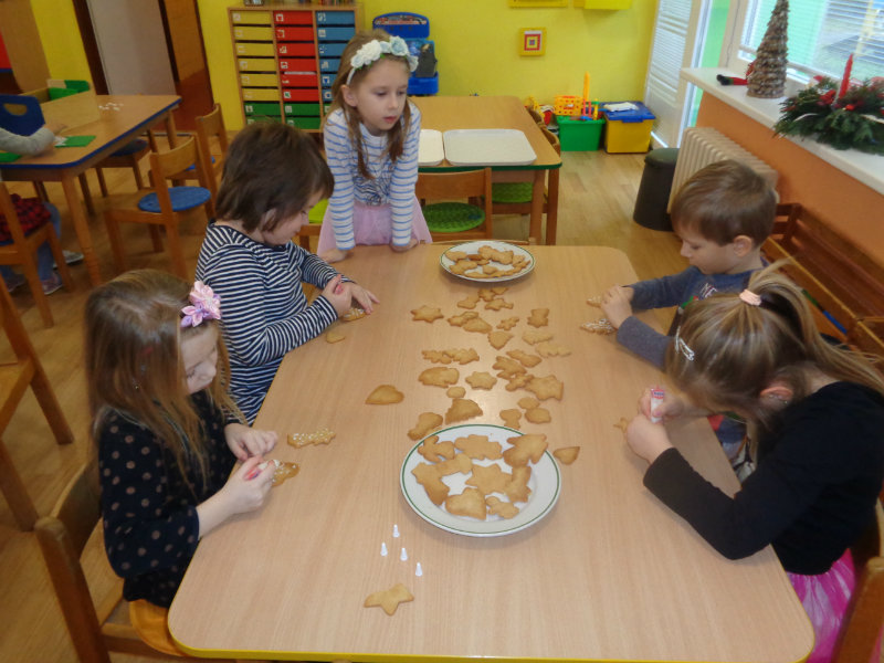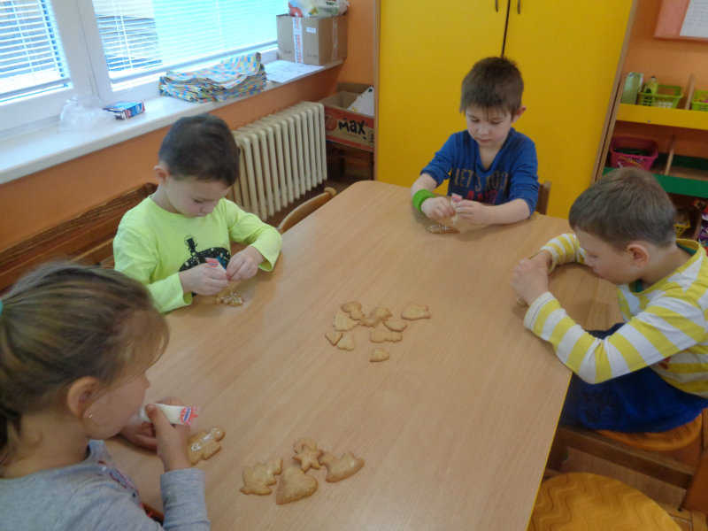 Aj v MŠ sa tešíme na Vianoce. Zdobili sme si stromček, aranžovali sme svietniky, košíky, piekli a zdobili sme medovníky, vyrábali vianočné pozdravy. Pri práci nás prišli povzbudiť aj deti z iných tried.