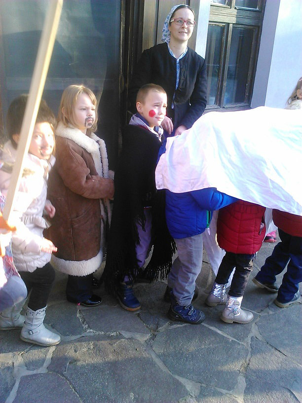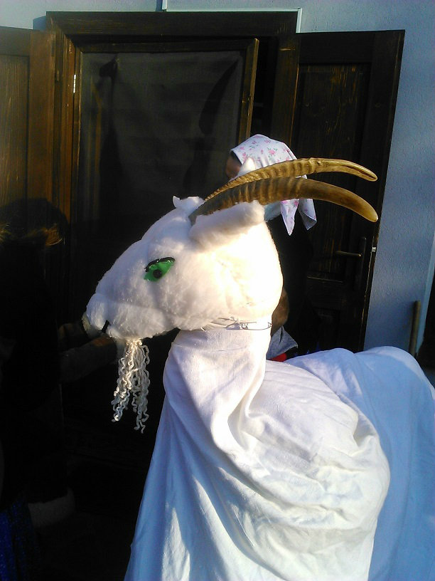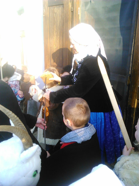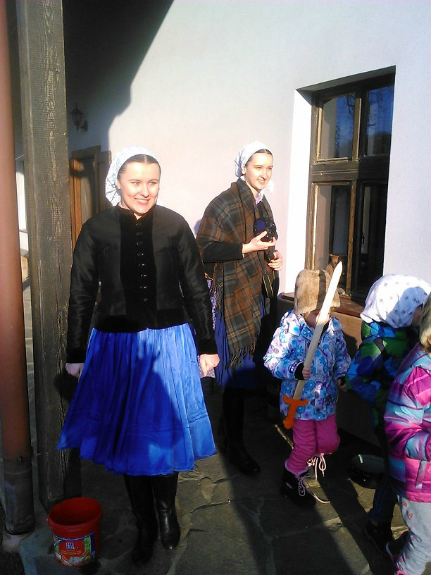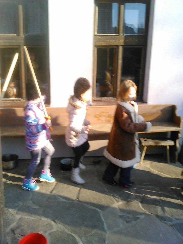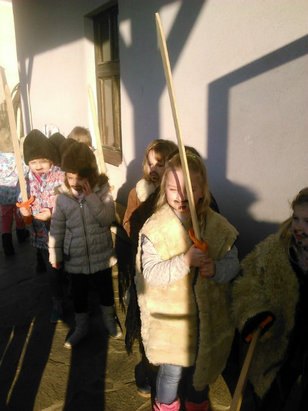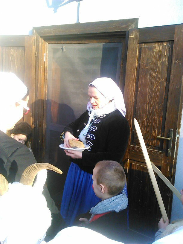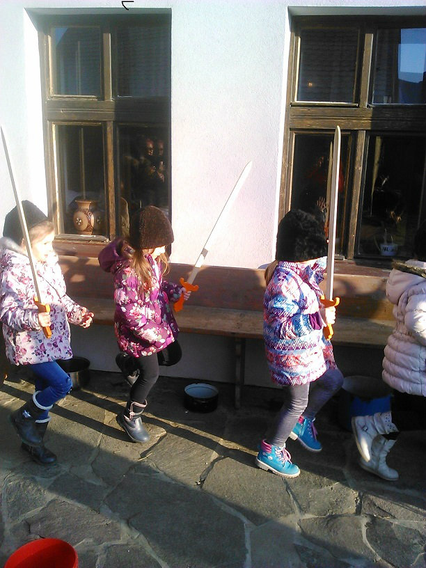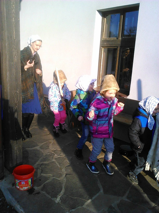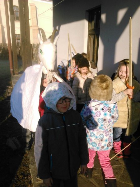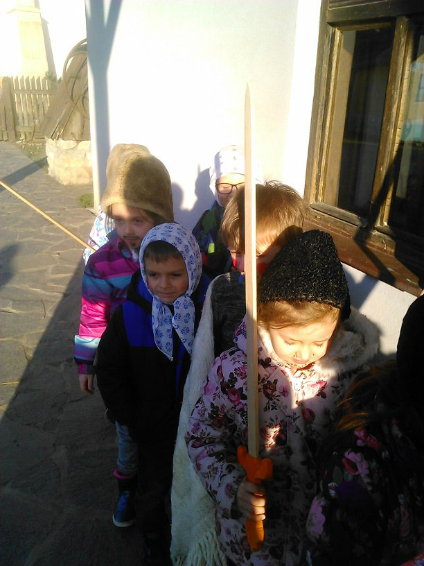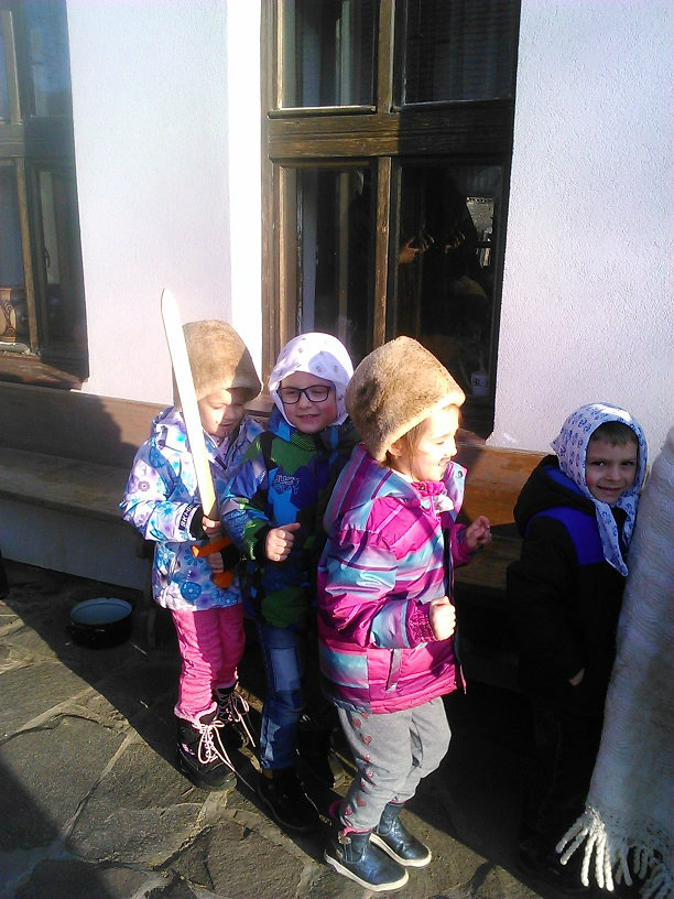 /chlapci sa prezliekli za dievčatá, dievčatá si namaľovali fúzy a stali sa chlapcami. Tri deti tvorili capka. Jeden držal hlavu capka na palici a dvaja boli pod plachtou a tvorili telo./ V maskách sme znovu tancovali a spievali sme tak, ako to bolo kedysi na veselici. Po tanci sme sa v sprievode, so spevom, vybrali koledovať pred dom za gazdinou. Tancom, spevom sme si vykoledovali klobásu a slaninu, ktorú nám gazdiná napichla na šable a pozvala nás ku stolu kde nám pripravila tradičné šišky a čaj. S novými poznatkami a zážitkami sme sa vrátili autobusom do MŠ.