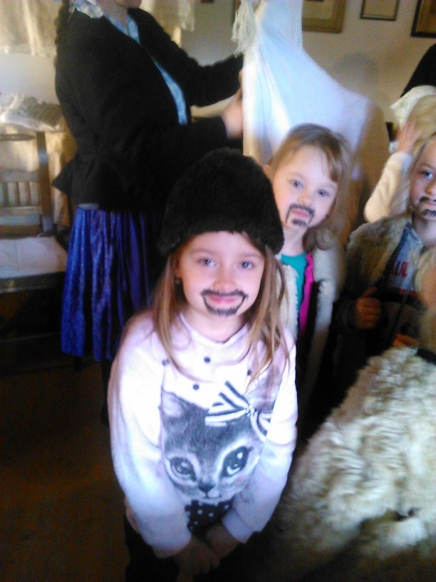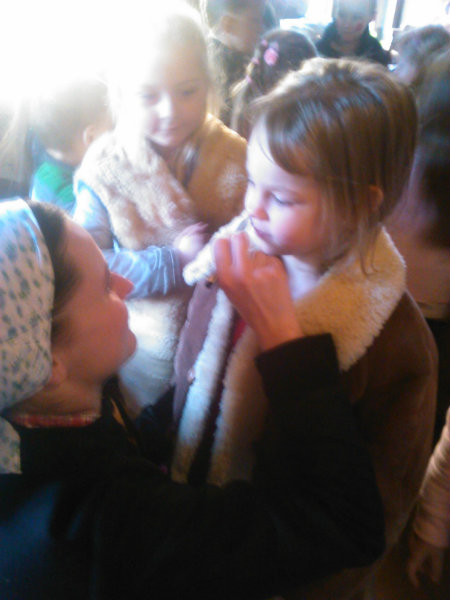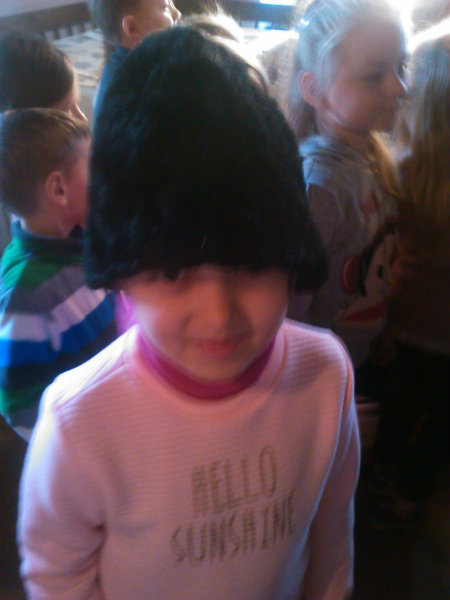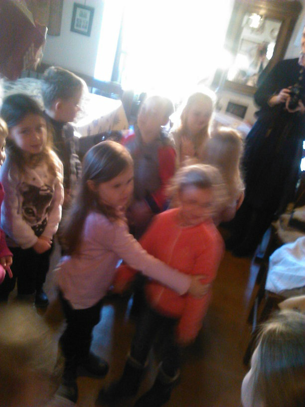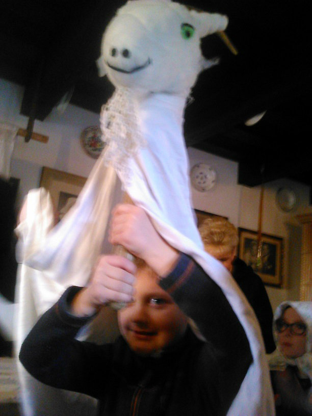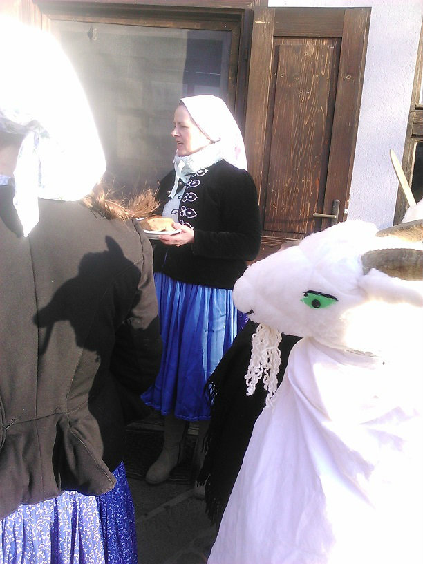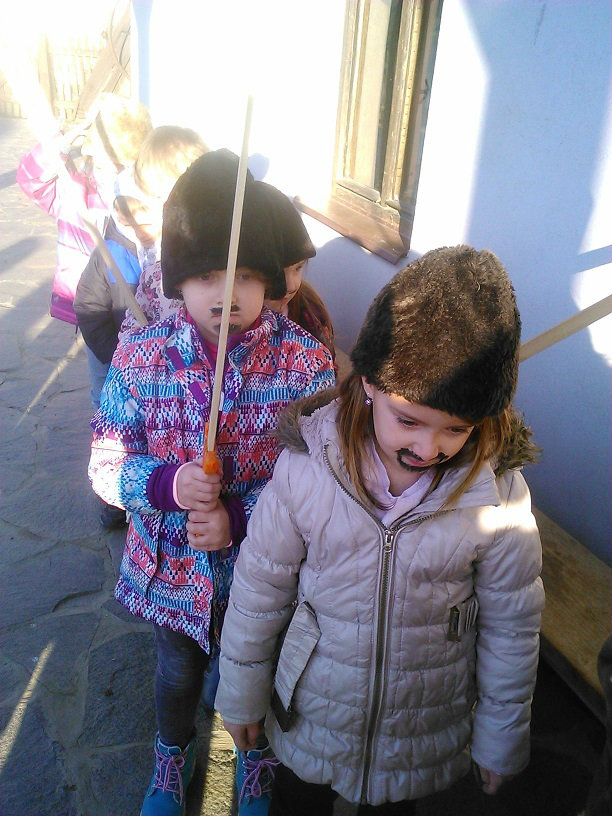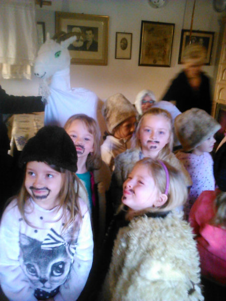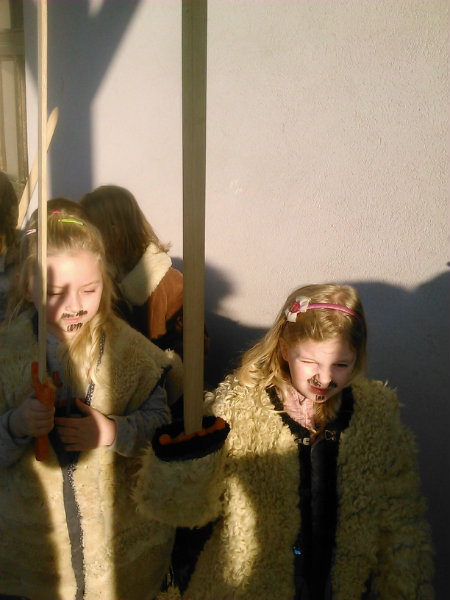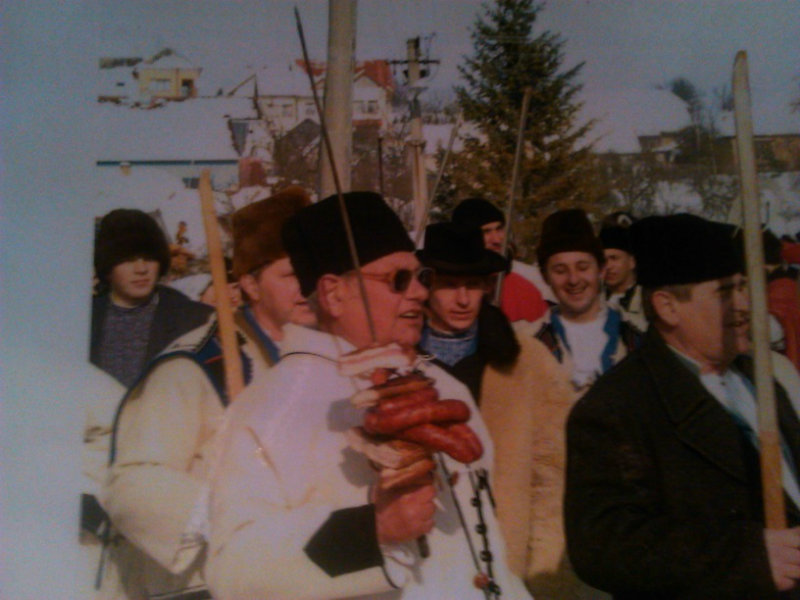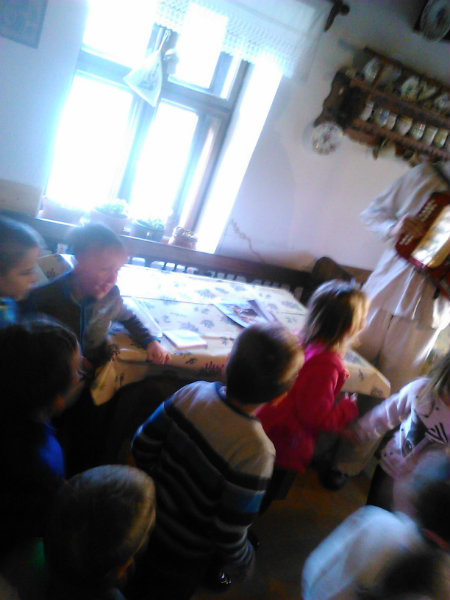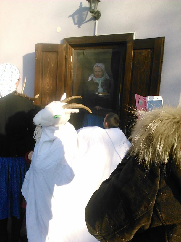 /chlapci sa prezliekli za dievčatá, dievčatá si namaľovali fúzy a stali sa chlapcami. Tri deti tvorili capka. Jeden držal hlavu capka na palici a dvaja boli pod plachtou a tvorili telo./ V maskách sme znovu tancovali a spievali sme tak, ako to bolo kedysi na veselici. Po tanci sme sa v sprievode, so spevom, vybrali koledovať pred dom za gazdinou. Tancom, spevom sme si vykoledovali klobásu a slaninu, ktorú nám gazdiná napichla na šable a pozvala nás ku stolu kde nám pripravila tradičné šišky a čaj. S novými poznatkami a zážitkami sme sa vrátili autobusom do MŠ.