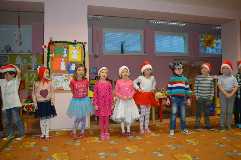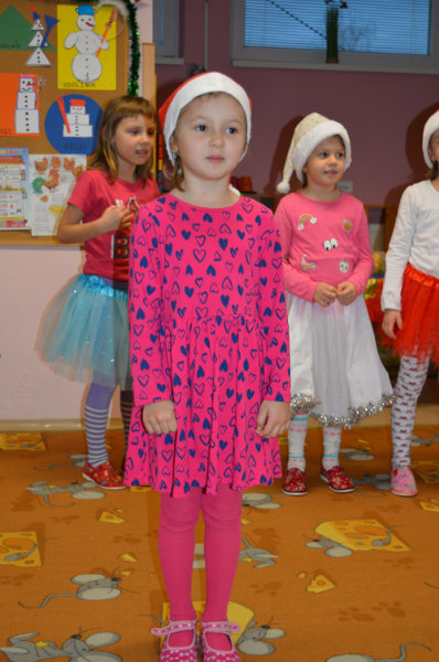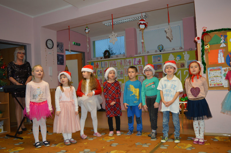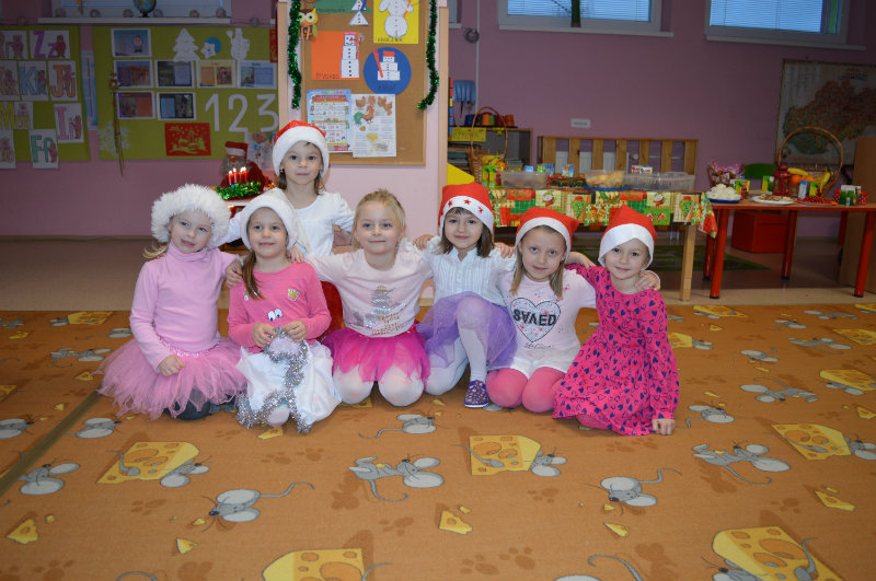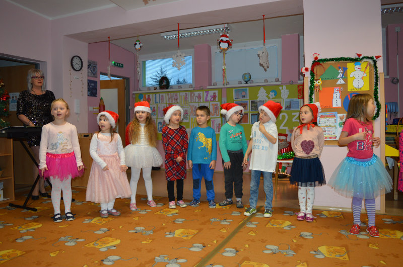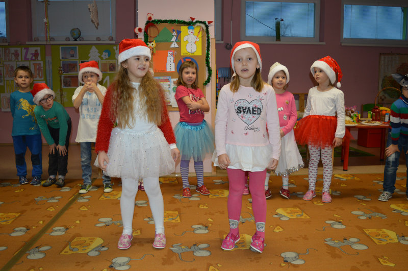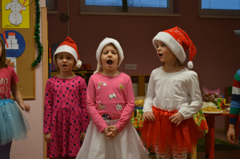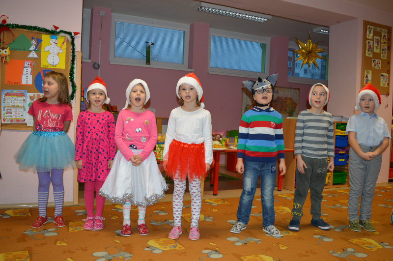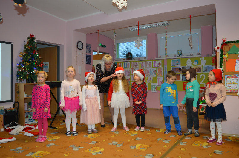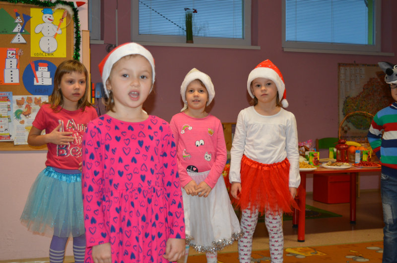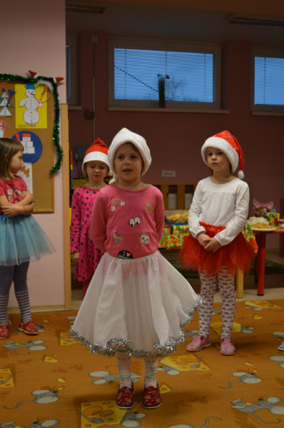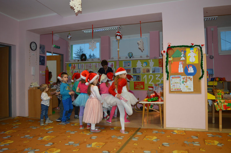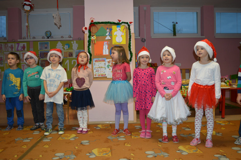 S deťmi sme si pripravili vianočný program, zimné básne a piesne o snehuliakoch, vtáčikoch, sánkovačke a guľovačke, divadielka o zvieratkách i o Červenej čiapočke, koledy i tanec. Rodičom sme vyrobili vianočné pozdravy s kaprom na vrchnej strane, blahoželaním a zvončekom vo vnútri, lepením a strihaním. Spoločne sme vyzdobili triedu, ozdobili stromček, rozsvietili sviečky, vyparádili sme sa a tešili sa na rodičov. Starostlivé mamičky nám pripravili vianočné pohostenie. Medovníčky rôznych tvarov, linecké koláčiky s lekvárom, buchtičky, piškóty s banánom v čokoláde, slané tyčinky a najrozličnejšie voňavé dobroty. Keď prišli rodičia, s radosťou a odvážne sme im zaspievali, zatancovali, zarecitovali a vytvorili príjemnú vianočnú náladu. Po vystúpení sme rozdali pozdravy a pobozkali rodičov. Potom sme spoločne zdobili medovníky a zároveň aj ochutnávali. Zábava pokračovala tancovaním, hodovaním, hrami a rozhovormi. Na záver sme si popriali krásne, veselé a šťastné Vianoce.