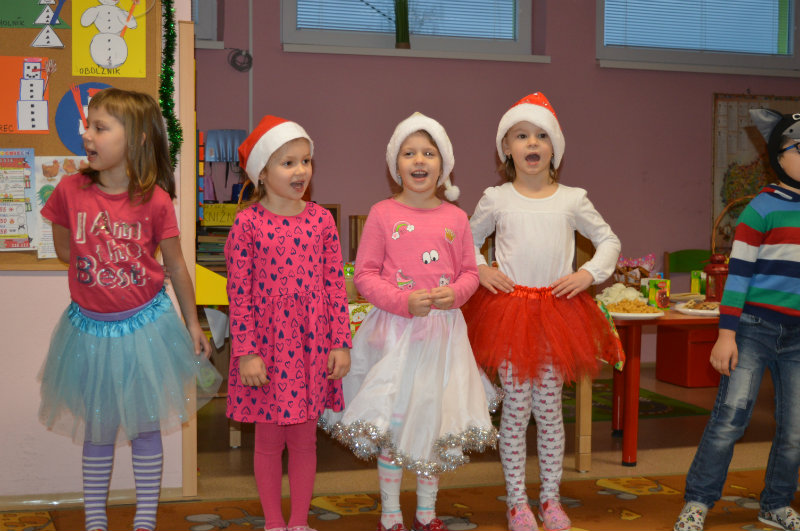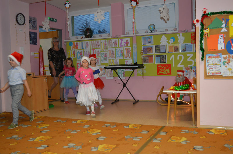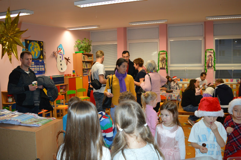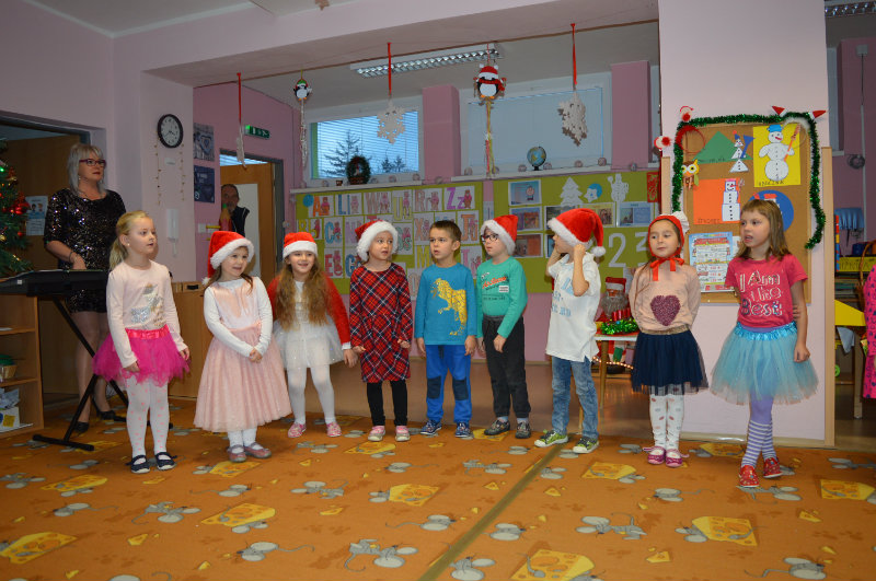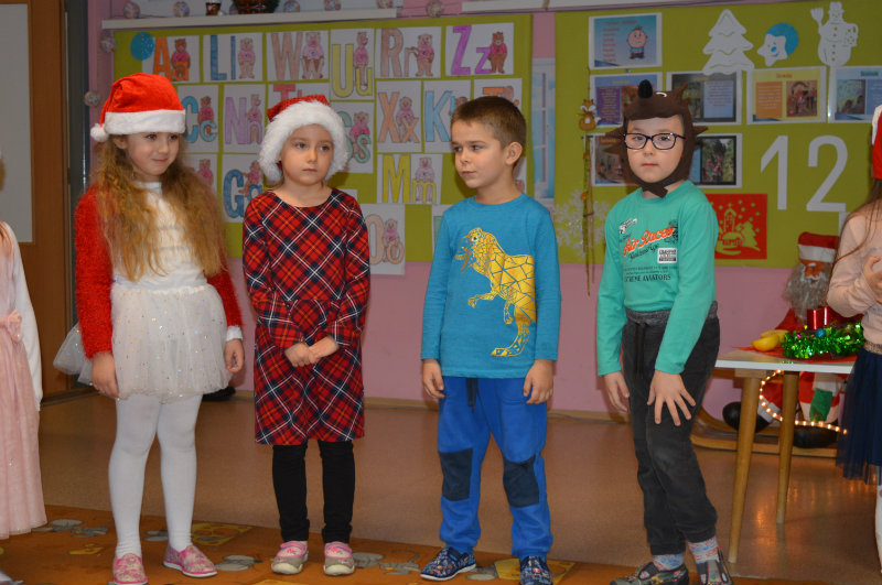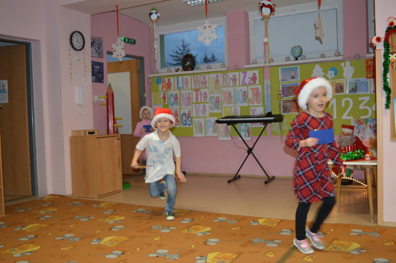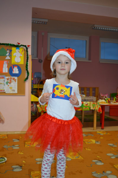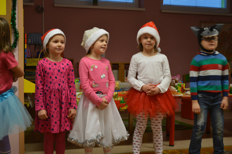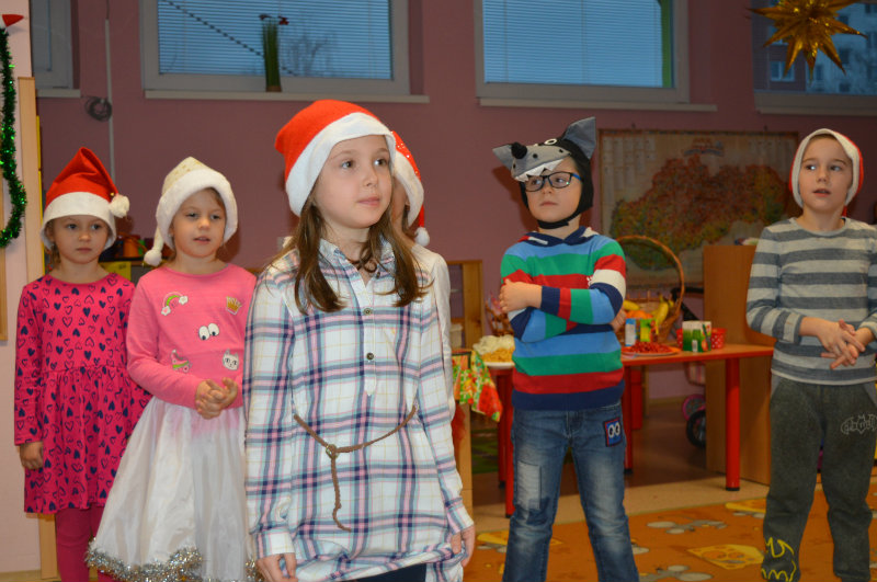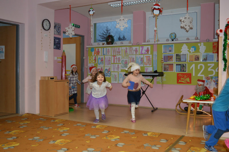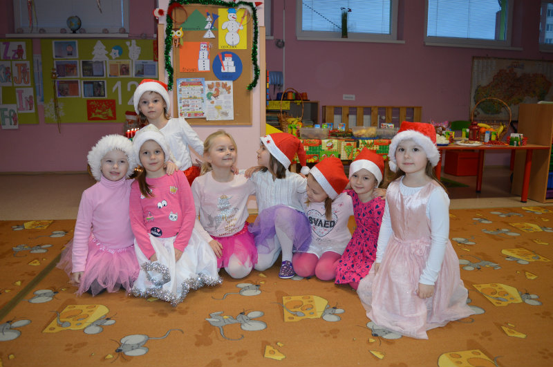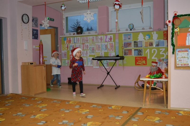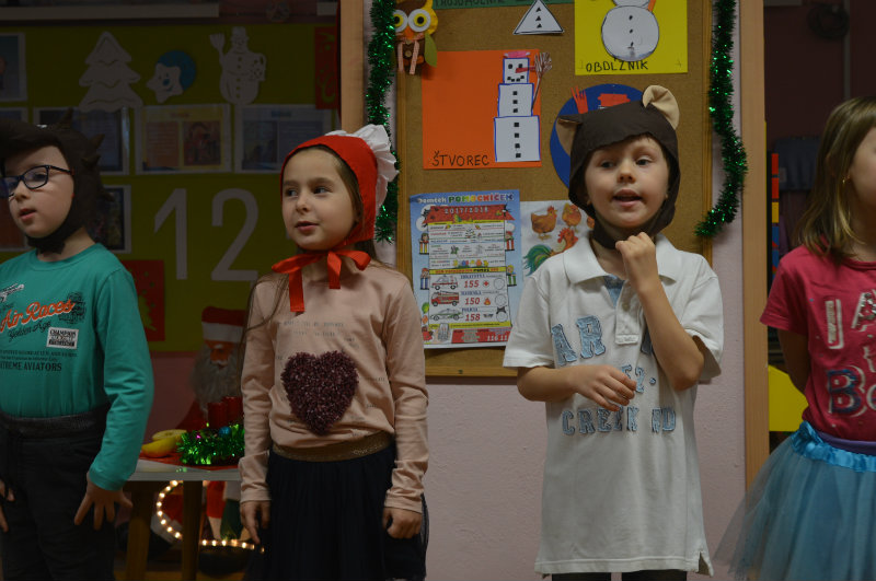 S deťmi sme si pripravili vianočný program, zimné básne a piesne o snehuliakoch, vtáčikoch, sánkovačke a guľovačke, divadielka o zvieratkách i o Červenej čiapočke, koledy i tanec. Rodičom sme vyrobili vianočné pozdravy s kaprom na vrchnej strane, blahoželaním a zvončekom vo vnútri, lepením a strihaním. Spoločne sme vyzdobili triedu, ozdobili stromček, rozsvietili sviečky, vyparádili sme sa a tešili sa na rodičov. Starostlivé mamičky nám pripravili vianočné pohostenie. Medovníčky rôznych tvarov, linecké koláčiky s lekvárom, buchtičky, piškóty s banánom v čokoláde, slané tyčinky a najrozličnejšie voňavé dobroty. Keď prišli rodičia, s radosťou a odvážne sme im zaspievali, zatancovali, zarecitovali a vytvorili príjemnú vianočnú náladu. Po vystúpení sme rozdali pozdravy a pobozkali rodičov. Potom sme spoločne zdobili medovníky a zároveň aj ochutnávali. Zábava pokračovala tancovaním, hodovaním, hrami a rozhovormi. Na záver sme si popriali krásne, veselé a šťastné Vianoce.