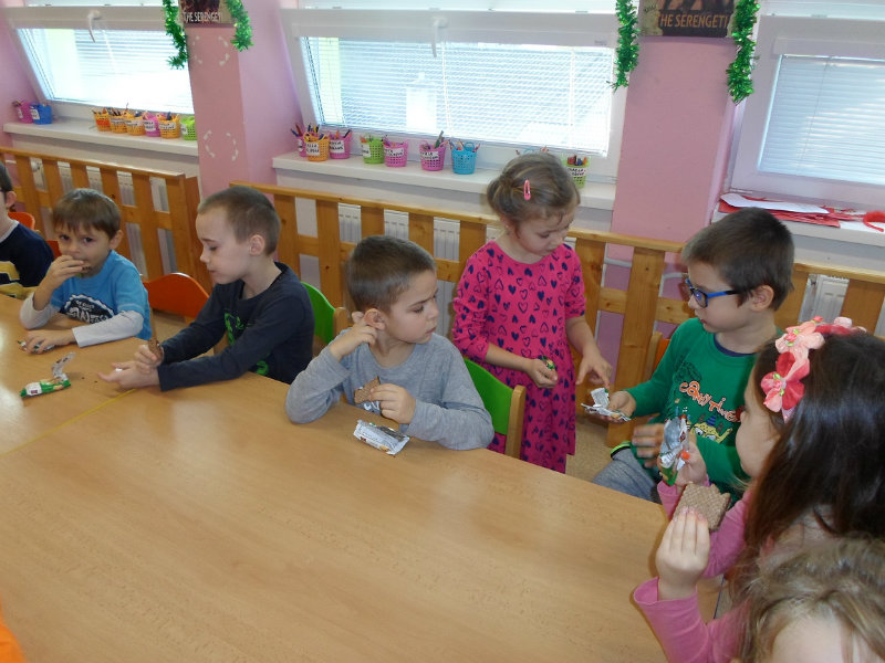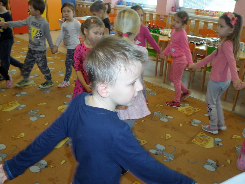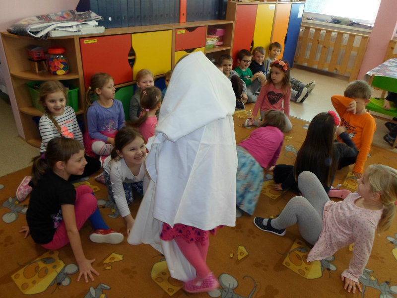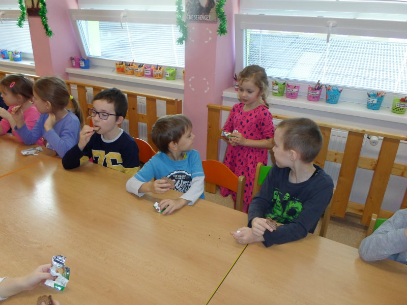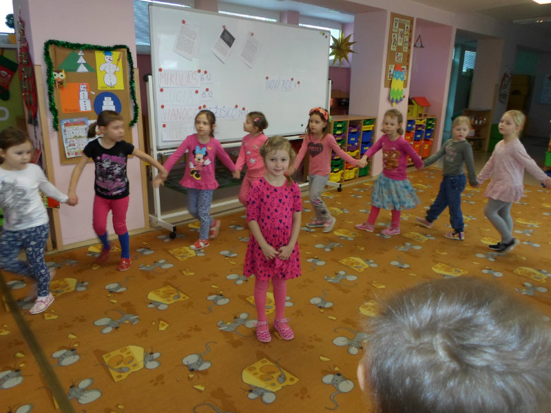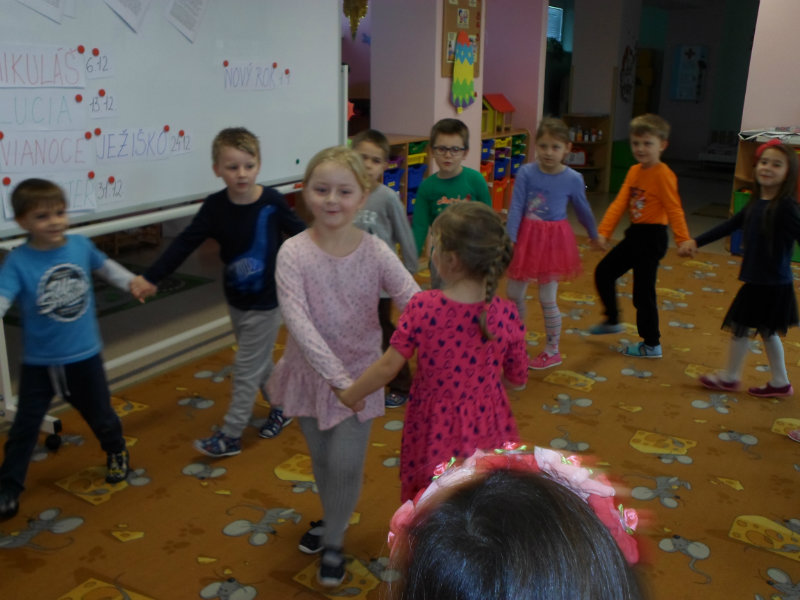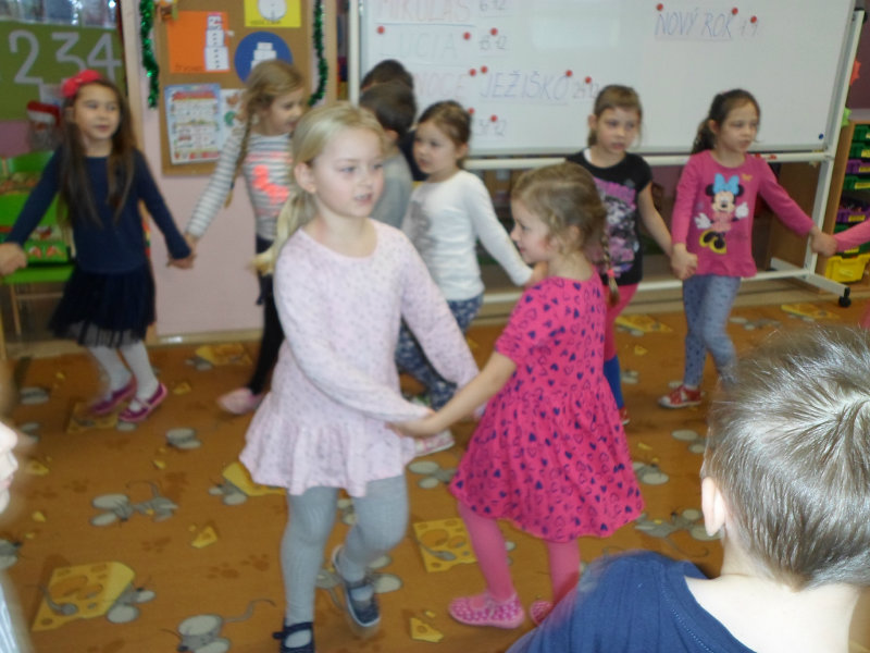 Tradíciu, ktorú ľudia dodržiavali na Luciu a s ktorou sme sa zoznámili na Gazdovskom dvore na Turej Lúke, sme si vyskúšali v MŠ, nakoľko máme v triede jednu Luciu. Zaspievali sme jej pieseň od Mira Jaroša Narodeniny, zagratulovali, zatancovali sme si s ňou. Spoločne sme si pripravili nepečený koláč. Na plech sme ukladali piškóty, na ne sme natierali jablkovú plnku a vrstvili. Vrch koláča sme ozdobili smotanou a horkou čokoládou. Potom sme spoločne hodovali a oslavovali Luckine meniny. Ona nám za odmenu, podľa tradície, zahalená do bielej plachty, povymetala všetky kúty v triede husím pierkom, aby vyhnala od nás zlé sily.