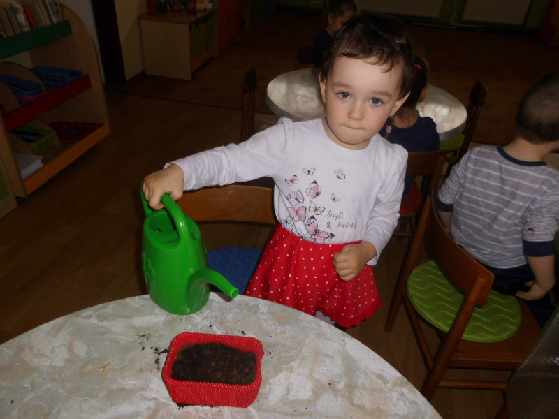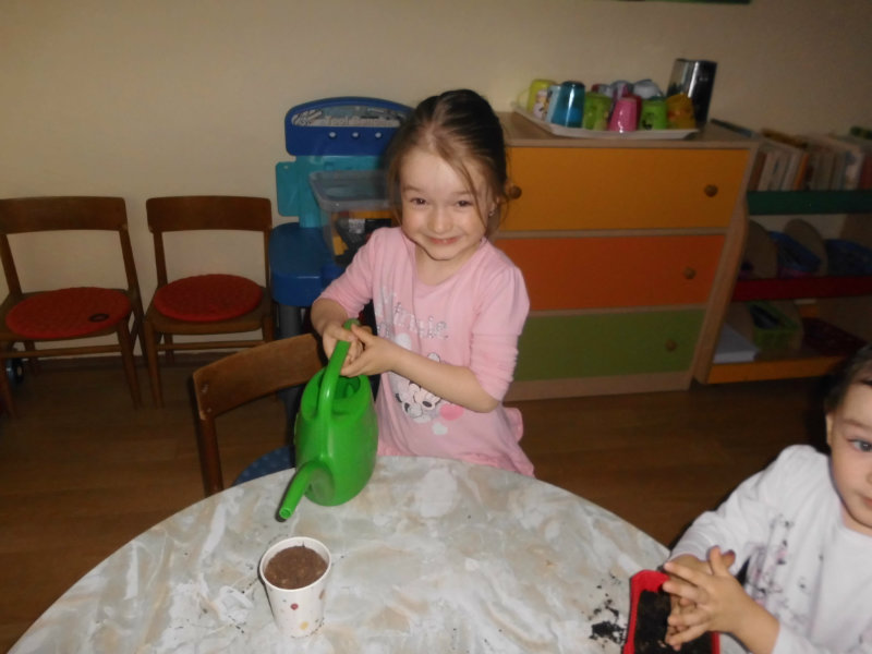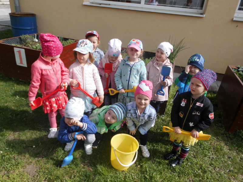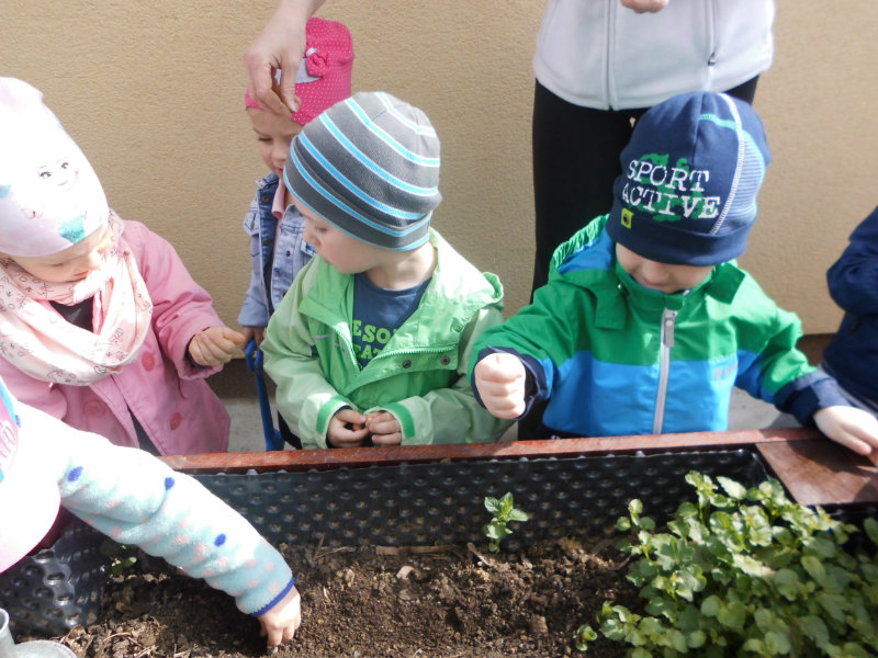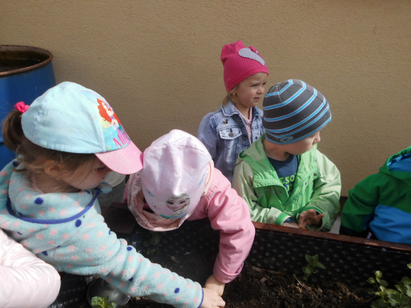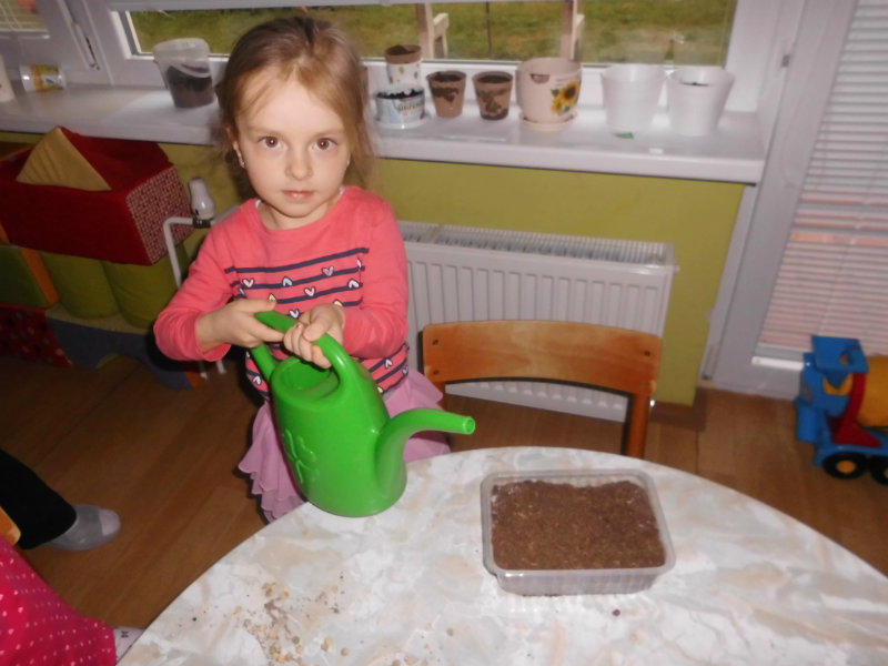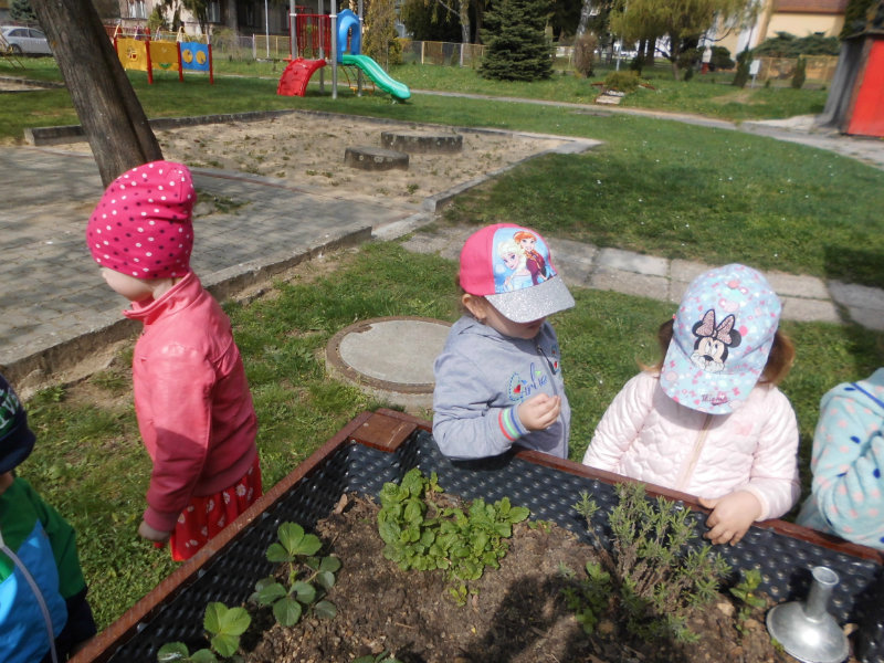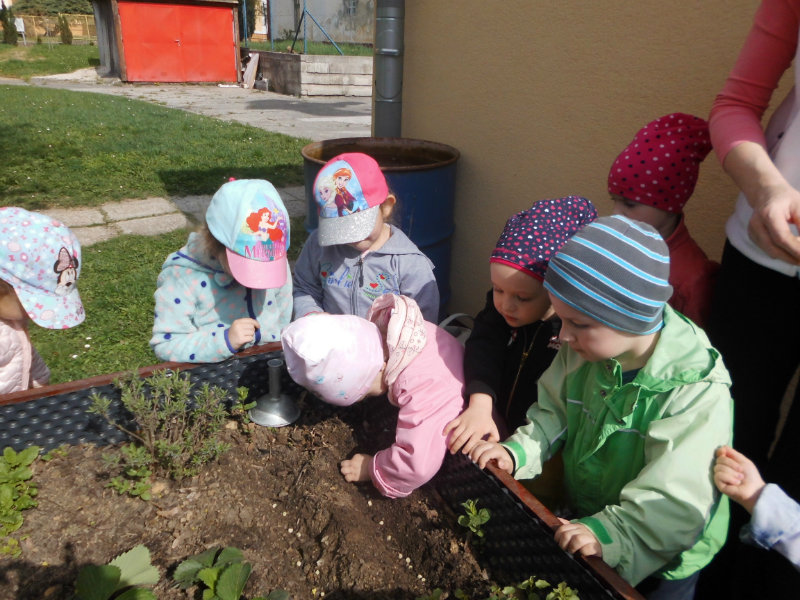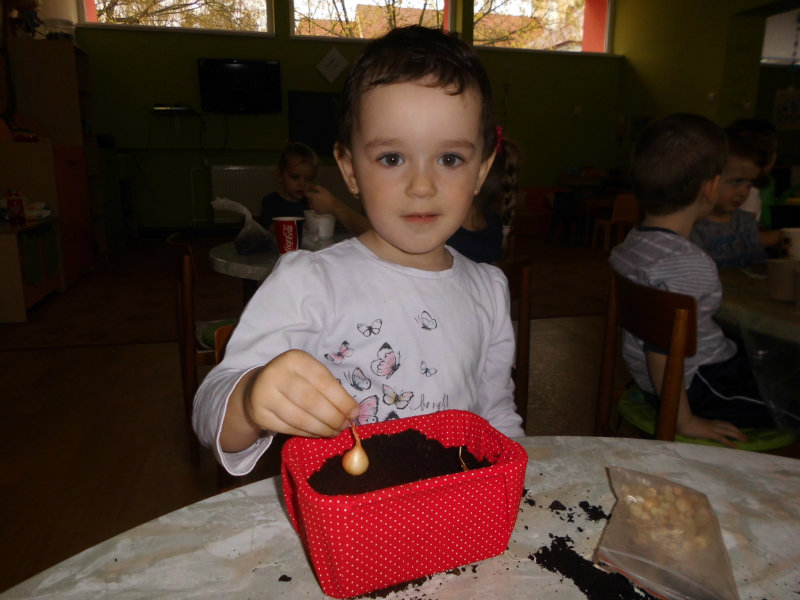 Prostredníctvom zážitkového učenia sme pôsobili na emocionálnu stránku detí pri sadení semienok a cibuliek prinesených z domova. Vyhrnuli sme si rukávy a stali sa na chvíľu malými záhradníkmi. Rastlinky denne sledujeme, polievame a tešíme sa ako nám rastú. Očistili sme si svoje políčko a zasadili samé zdravé dobroty : cibuľku, hrášok, pažítku a na potešenie sú pestrofarebné kvetinky. Už sa tešíme na úrodu.