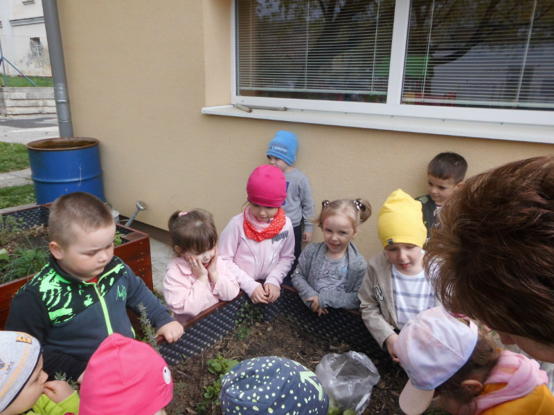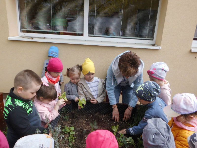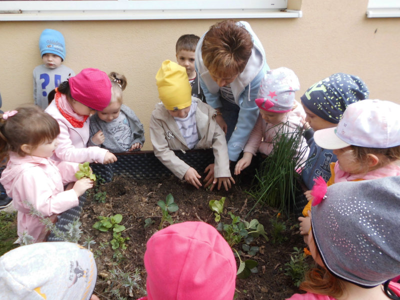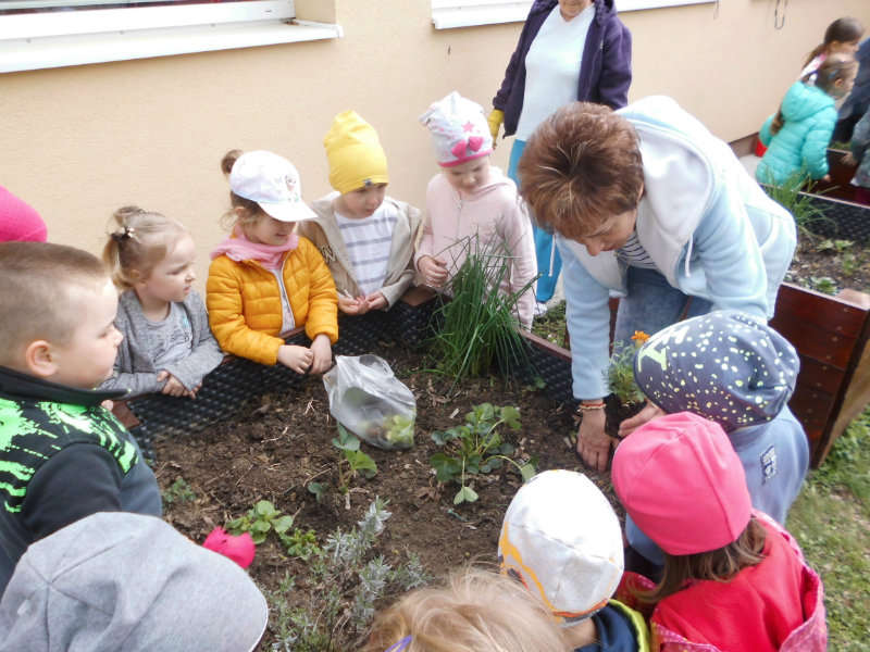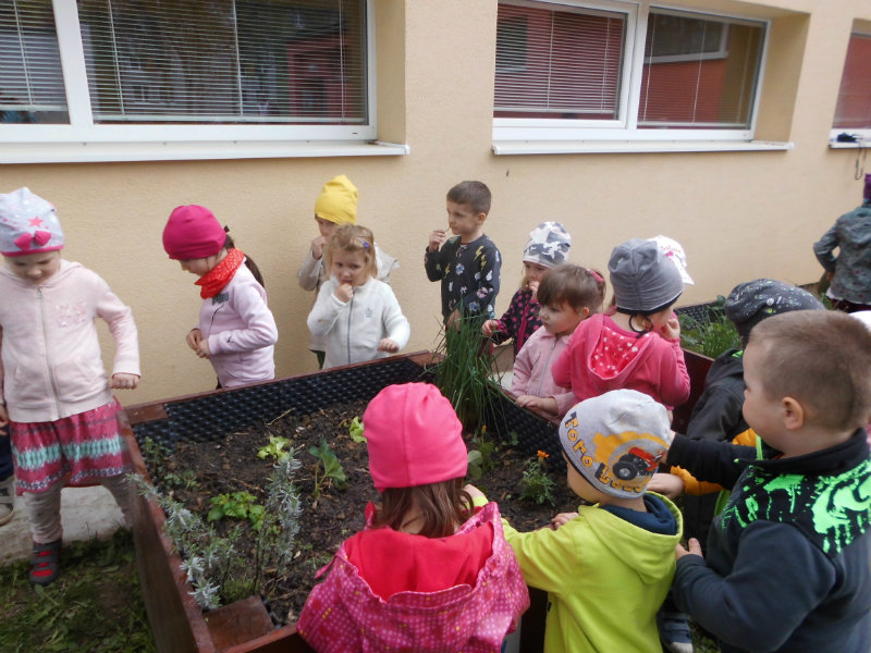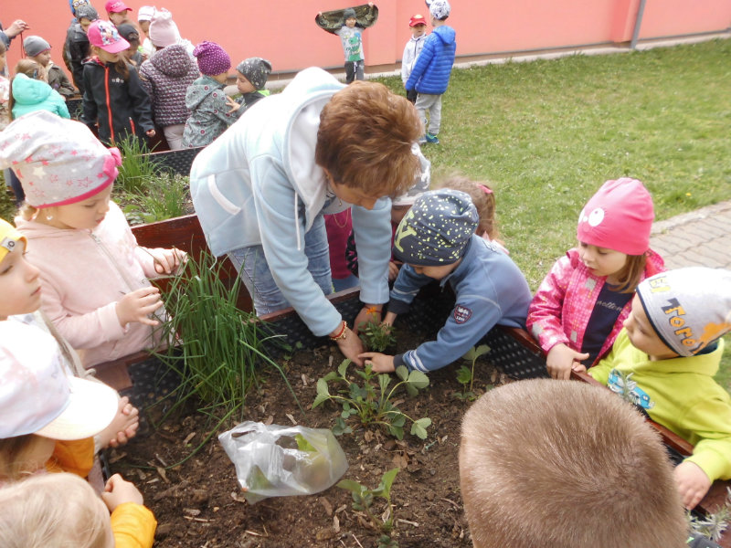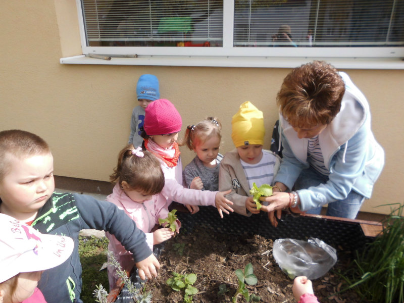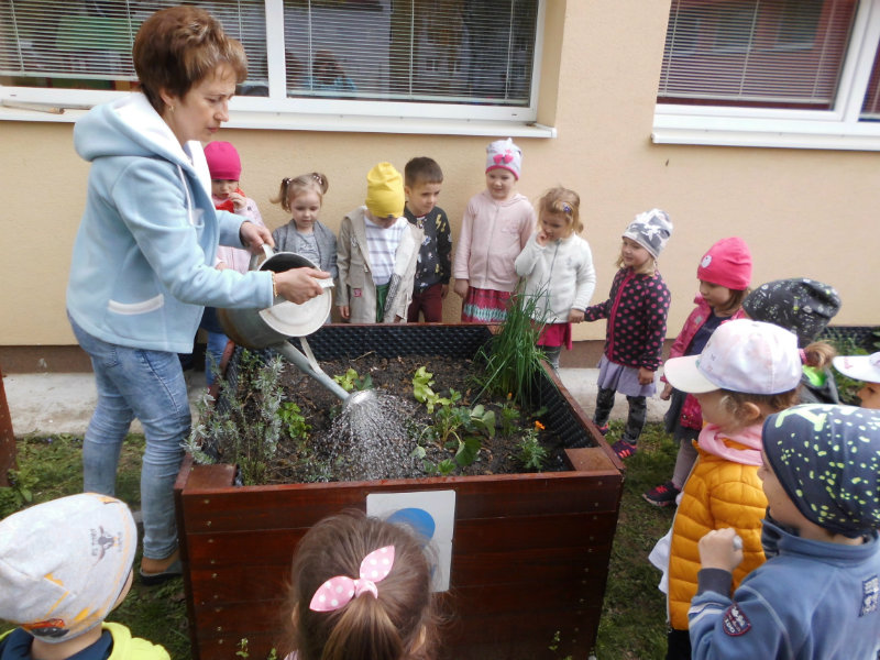 Slniečko už viacej hreje, na nás dolu sa viac smeje, kúpili sme planty malé, o ktoré sa postaráme. Do hriadky ich zasadíme a vodičkou polejeme.