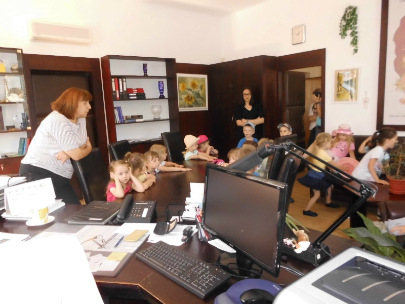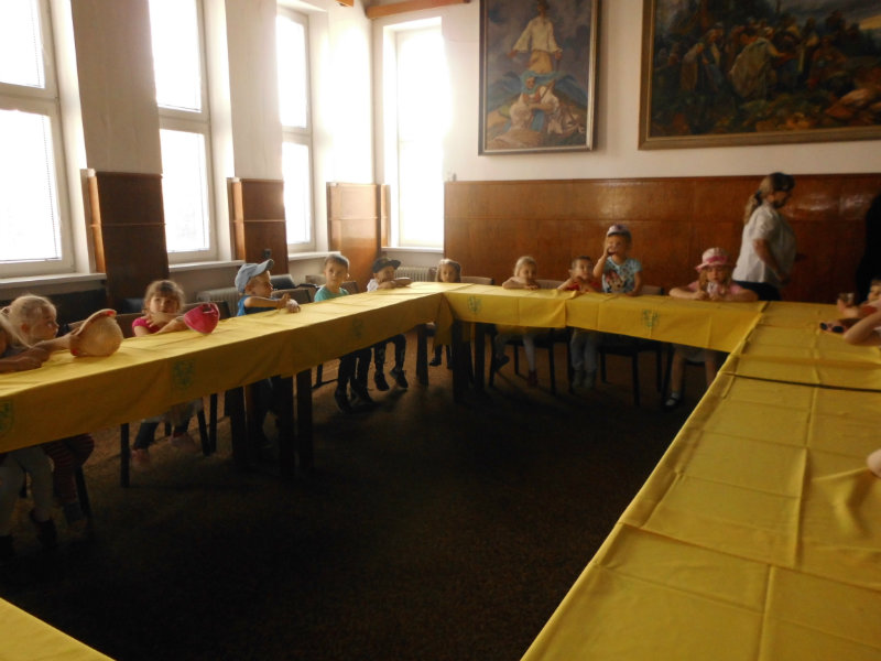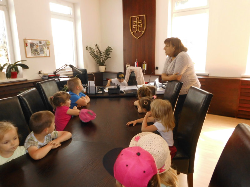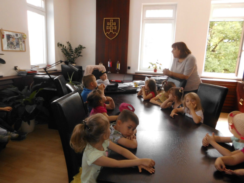 23.5.2018 sme v rámci témy "Slovensko moja vlasť" navštívili Mestský úrad v našom meste. Hostiteľkou nám bola pani primátorka Ing. Anna Halinárová. Nakuknúť sme mohli do jej kancelárie i do zasadacej miestnosti. V obradnej sále sme si mohli skúsiť, ako sa nosí štátny znak a poťažkať si kroniku mesta. Ďakujeme za milé prijatie a nevšedný zážitok.