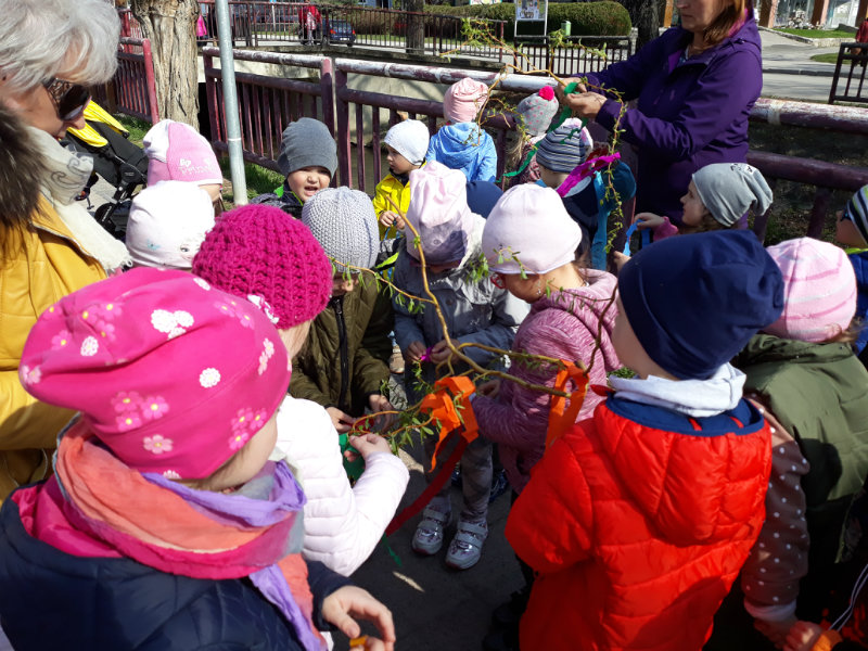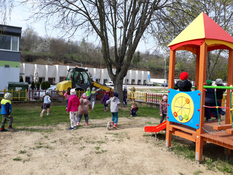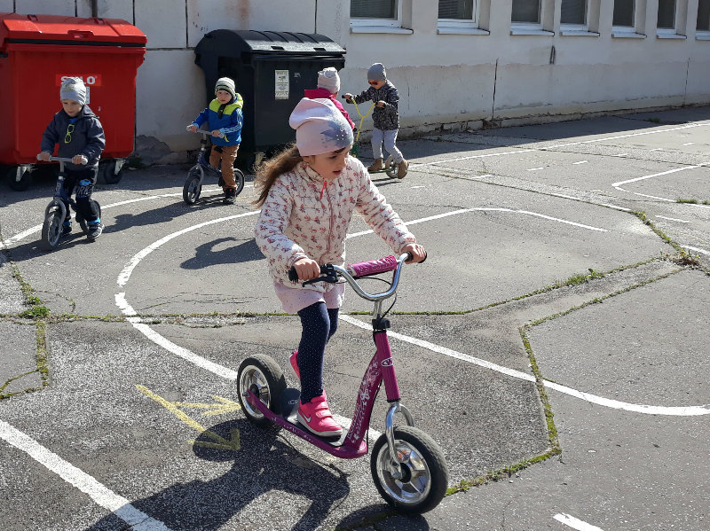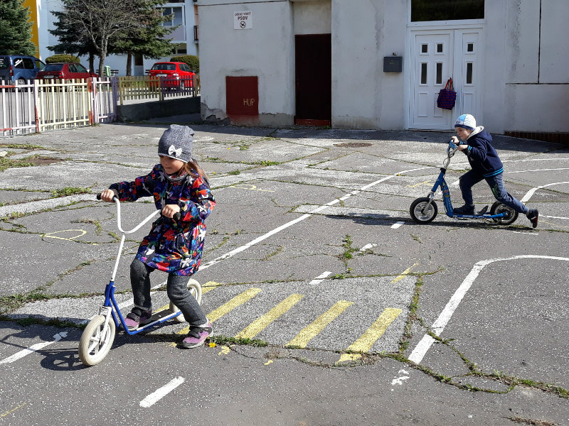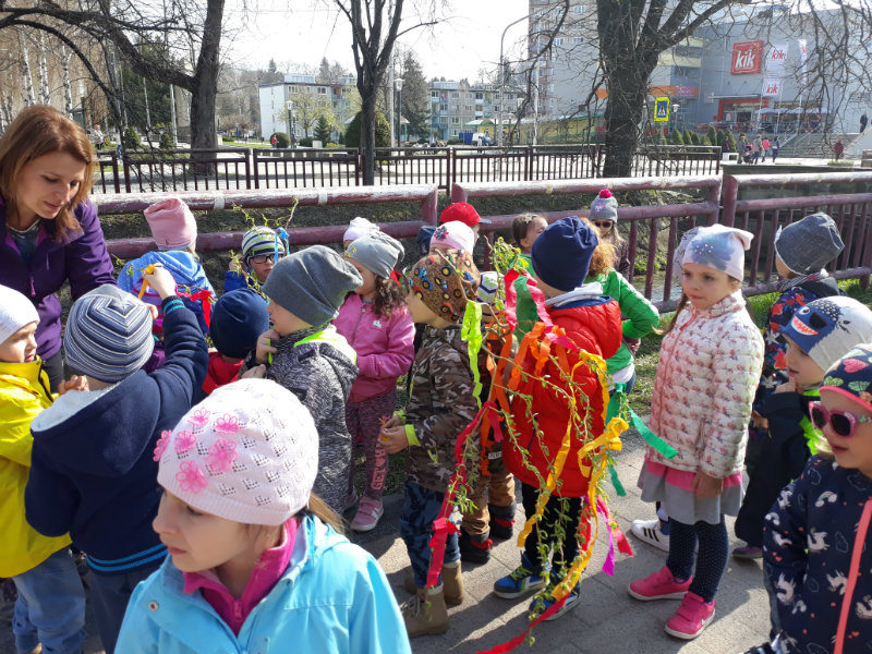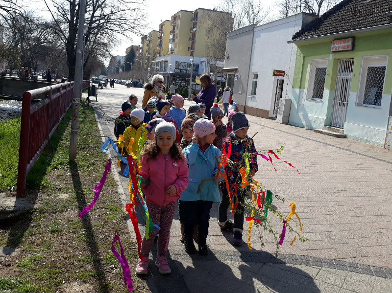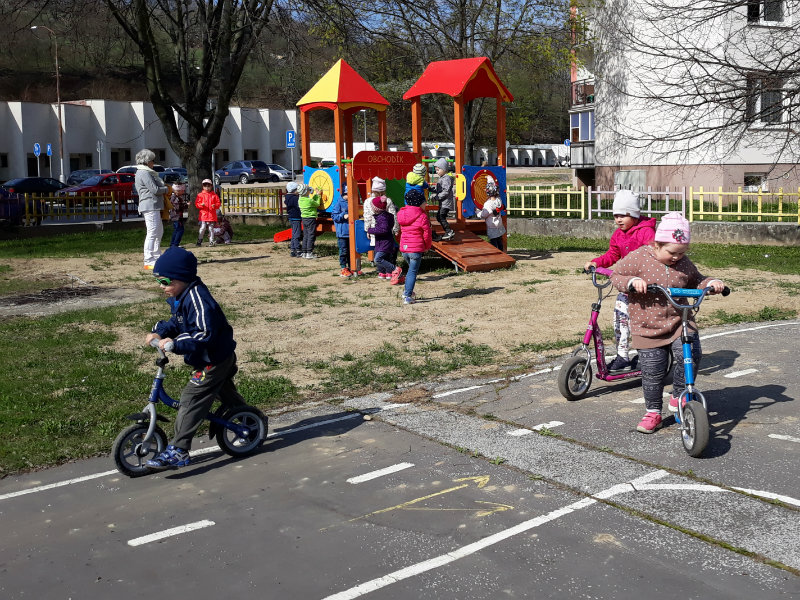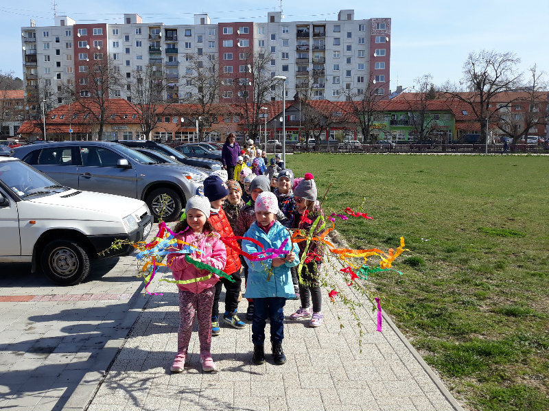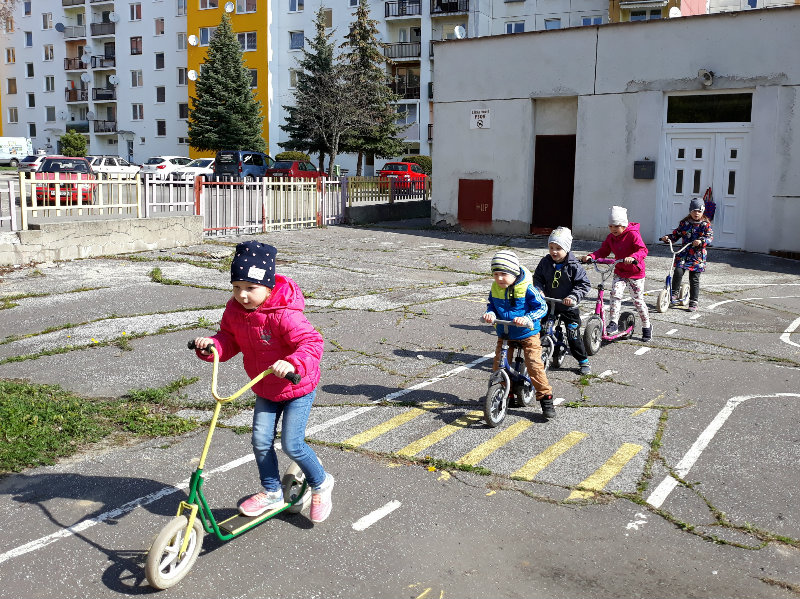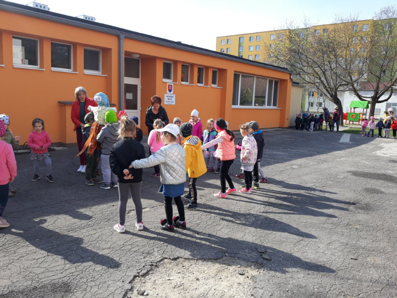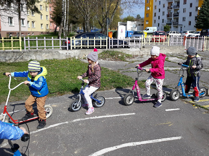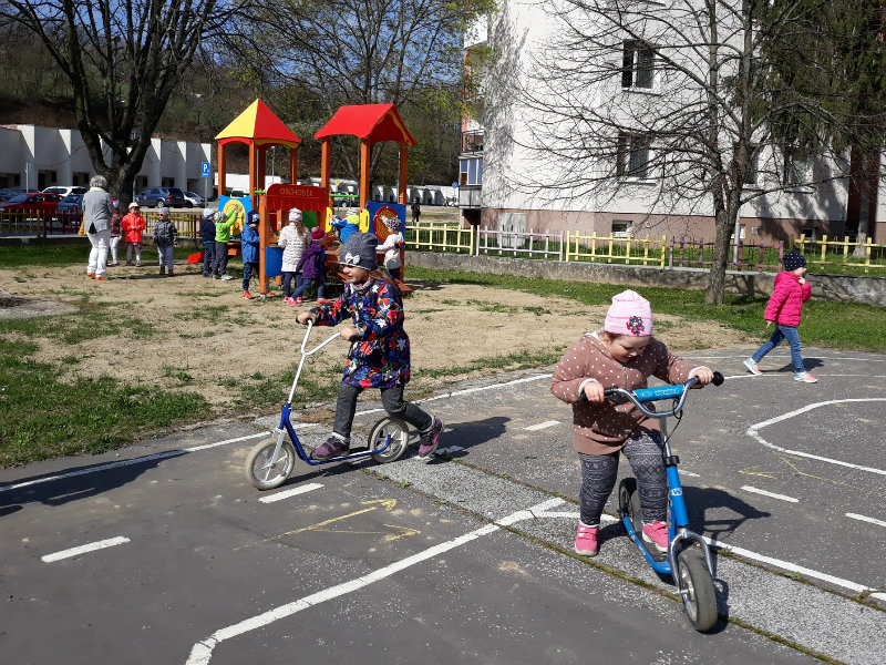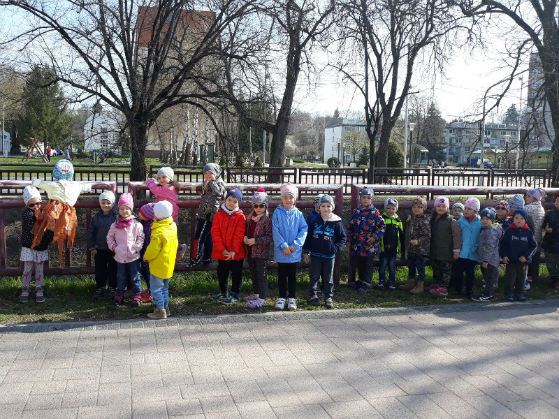 V mesiaci APRÍL sme sa s prichádzajúcou jarou zamerali na jej charakteristické znaky, na Veľkonočné zvyky - účasťou na pálení Moreny, výrobou letečka, výrobou veľkonočných vajíčok. Pri príležitosti Dňa Zeme sa hravou formou deti učili správne zaradiť odpad do kontajnerov, čo patrí a naopak nepatrí do zbernej nádoby, čo vieme z odpadov vyrobiť, na čo nám vlastne slúžia, čím sme sa usilovali viesť deti k poznaniu, že recyklácia odpadkov je dôležitým krokom ku zmenšovaniu hory odpadov okolo nás. Počas vychádzok po meste sme pozorovali krásne jarné kvety, zmeny na stromoch, život v potoku - divú kačku s malými káčatkami. Pri sadení rôznych semienok sme sa zahrali na záhradníkov. Keďže v apríli boli aj pekné slnečné dni, tie sme využili na kolobežkovanie.