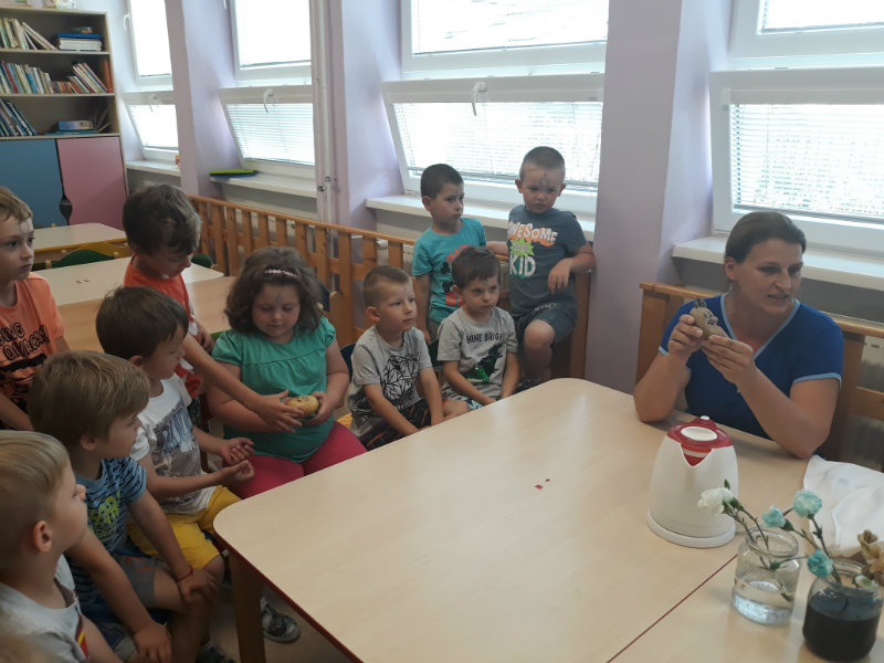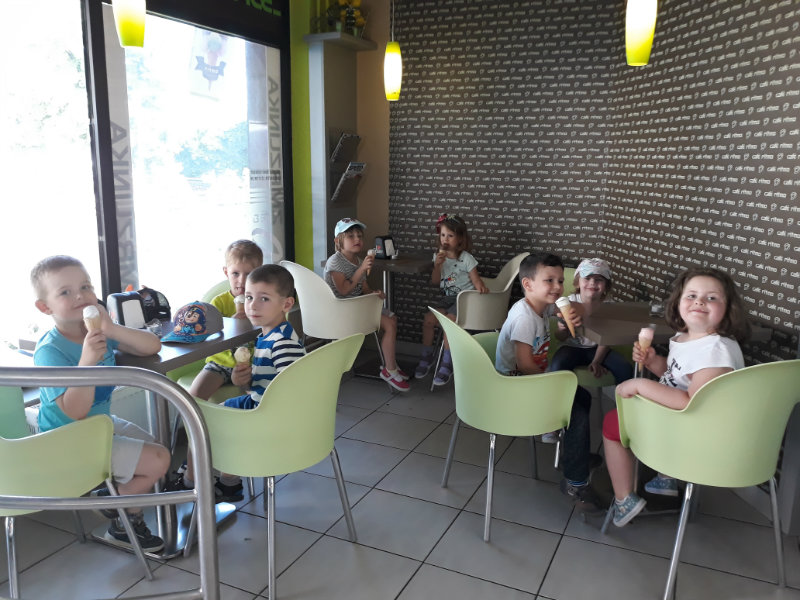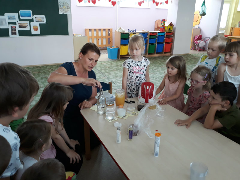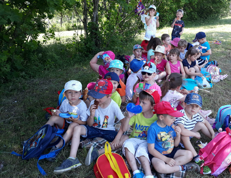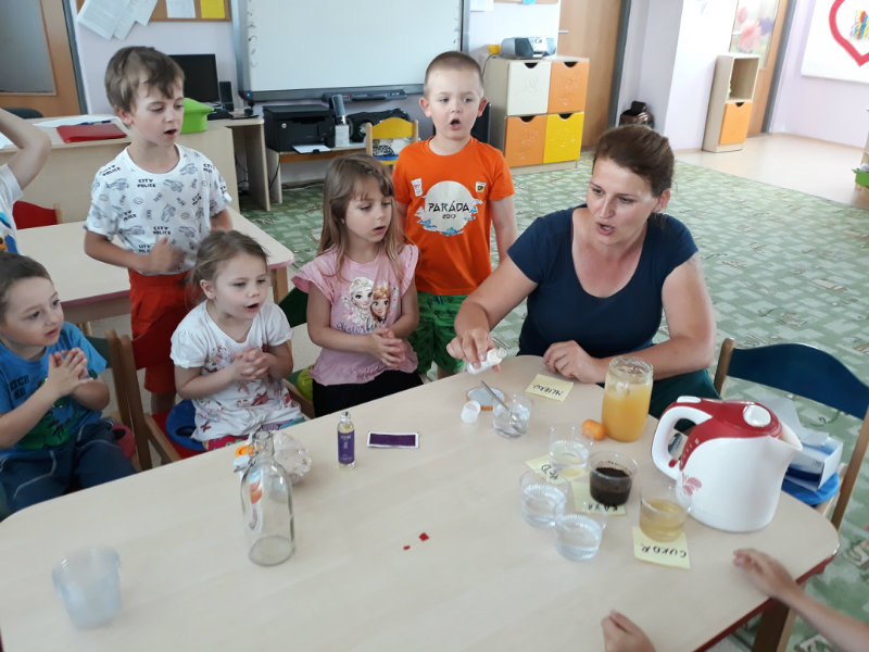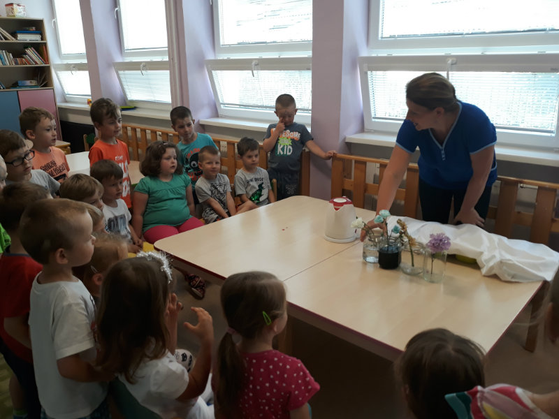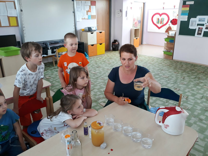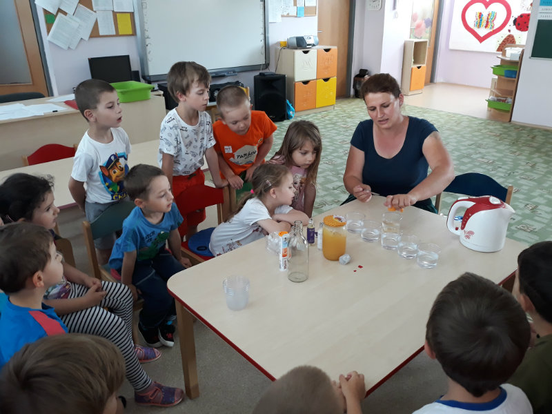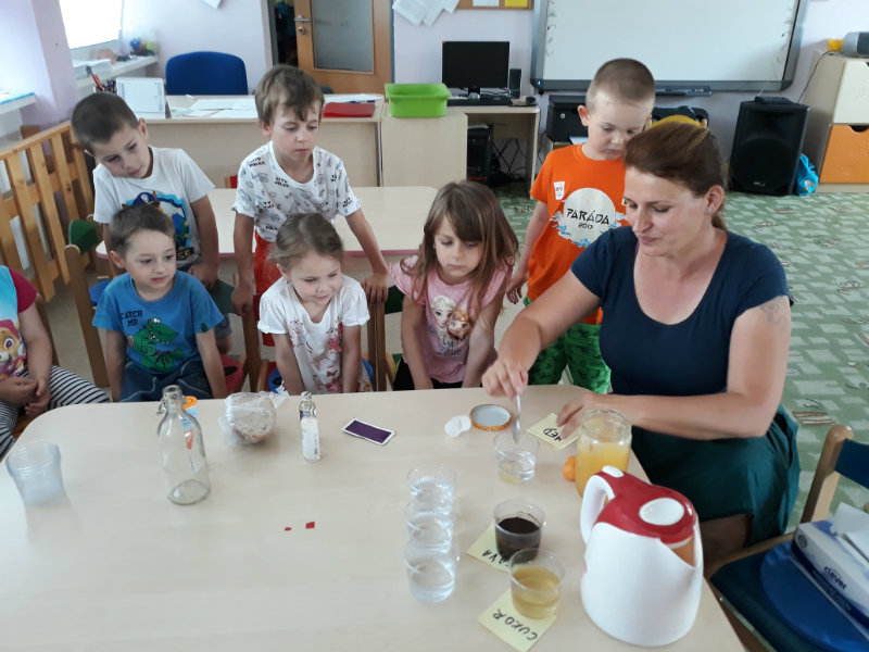 Posledný školský mesiac v roku JÚN sme začali sladkou pochúťkou. Vďaka p. J. Breštenskému si deti pri príležitosti Dňa detí vychutnali osviežujúcu zmrzlinu podľa vlastného výberu v príjemnom prostredí cukrárne. V tomto mesiaci sa počasie skutočne "predviedlo", a na zmrzlinu by sa dalo chodiť každý deň, takže téma O vode prišla práve vhod. Deti sa oboznámili o potrebe a spotrebe vody pre človeka, ako aj pre ostatnú prírodu. Prostredníctvom motivovaného príbehu "O Aničke Priesvitnej", pokusom s vyparovaním vody a piesňou Ako vznikajú mraky deti pochopili podstatu kolobehu vody, že voda je v oblakoch a v podobe dažďa padá na zem. Rozprávali sme si o premenách a úžitku vody. Skúmali a overovali, čo sa vode rozpustí, že rastliny pijú - nasávajú vodu korienkami, čím sme túto tému uzavreli myšlienkou - VODU POTREBUJÚ VŠETCI. Na turistickej vychádzke v blízkej prírode sme sa tiež museli osviežiť vodičkou, pretože nám slniečko doprialo pekné teplé počasie.