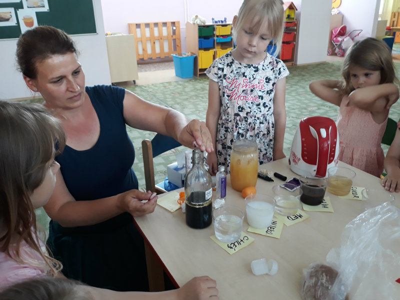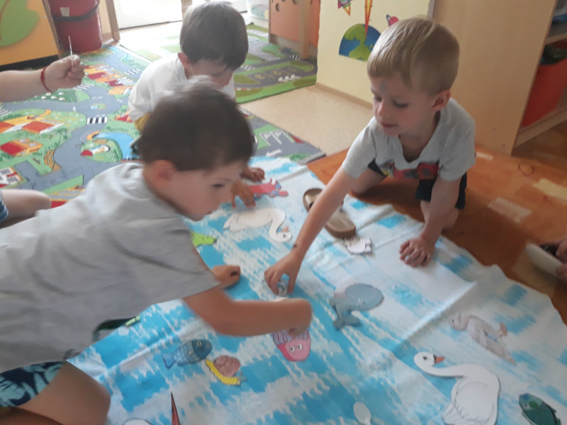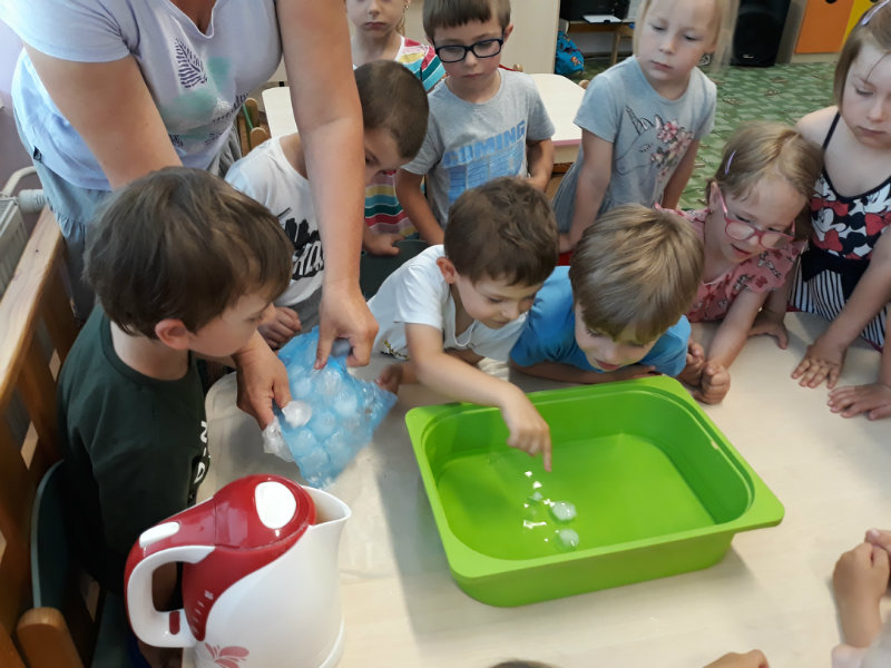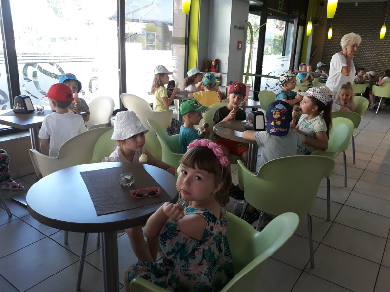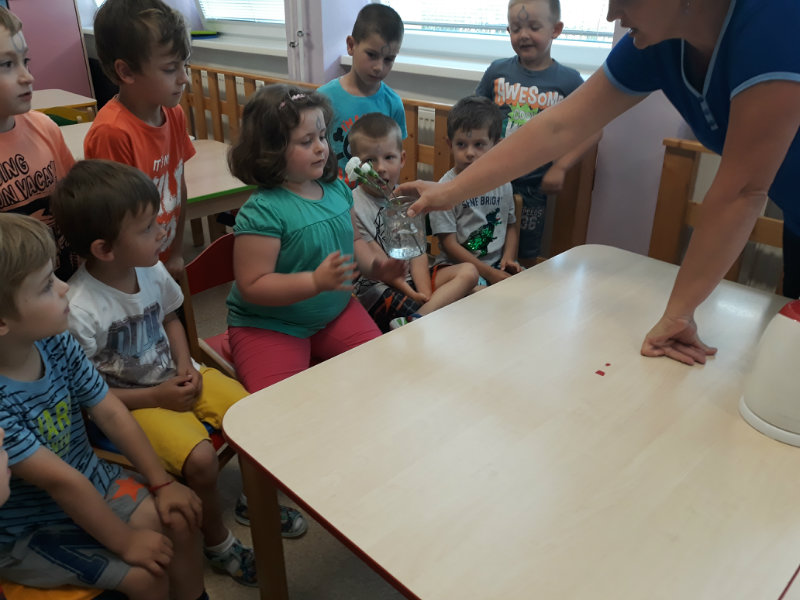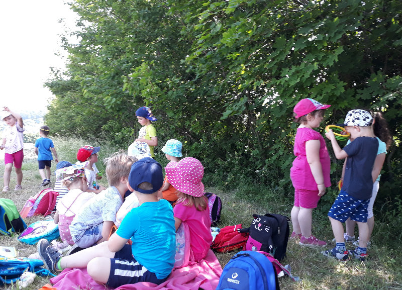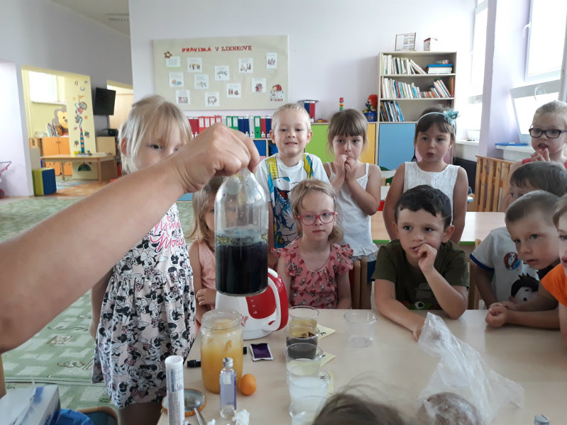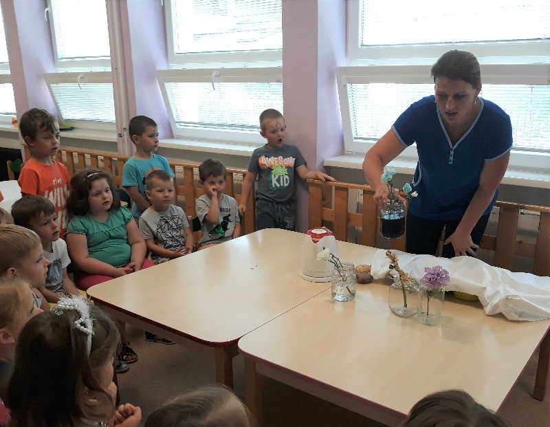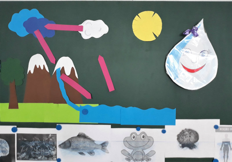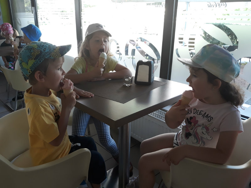 Posledný školský mesiac v roku JÚN sme začali sladkou pochúťkou. Vďaka p. J. Breštenskému si deti pri príležitosti Dňa detí vychutnali osviežujúcu zmrzlinu podľa vlastného výberu v príjemnom prostredí cukrárne. V tomto mesiaci sa počasie skutočne "predviedlo", a na zmrzlinu by sa dalo chodiť každý deň, takže téma O vode prišla práve vhod. Deti sa oboznámili o potrebe a spotrebe vody pre človeka, ako aj pre ostatnú prírodu. Prostredníctvom motivovaného príbehu "O Aničke Priesvitnej", pokusom s vyparovaním vody a piesňou Ako vznikajú mraky deti pochopili podstatu kolobehu vody, že voda je v oblakoch a v podobe dažďa padá na zem. Rozprávali sme si o premenách a úžitku vody. Skúmali a overovali, čo sa vode rozpustí, že rastliny pijú - nasávajú vodu korienkami, čím sme túto tému uzavreli myšlienkou - VODU POTREBUJÚ VŠETCI. Na turistickej vychádzke v blízkej prírode sme sa tiež museli osviežiť vodičkou, pretože nám slniečko doprialo pekné teplé počasie.
