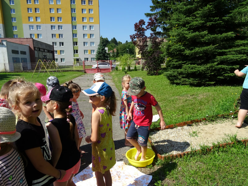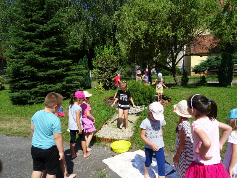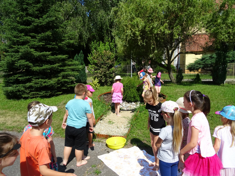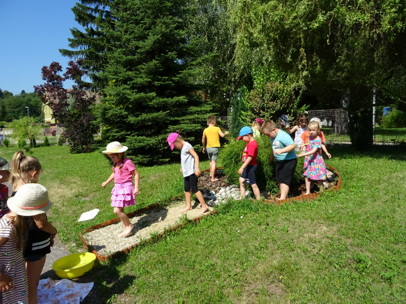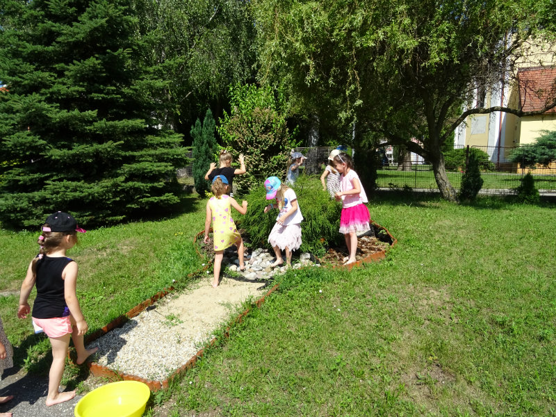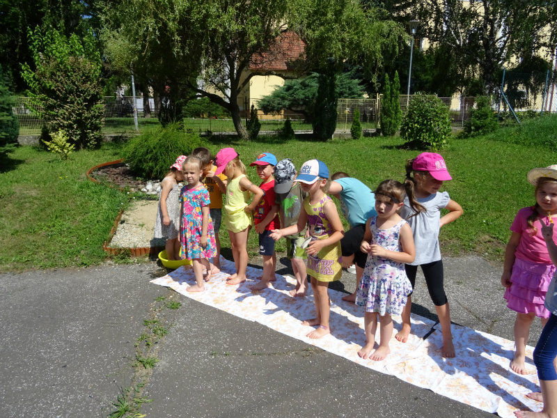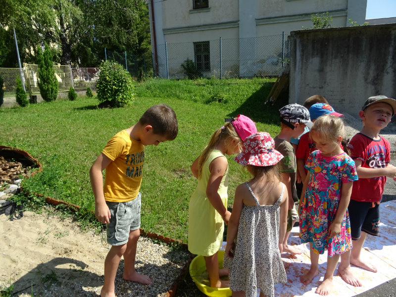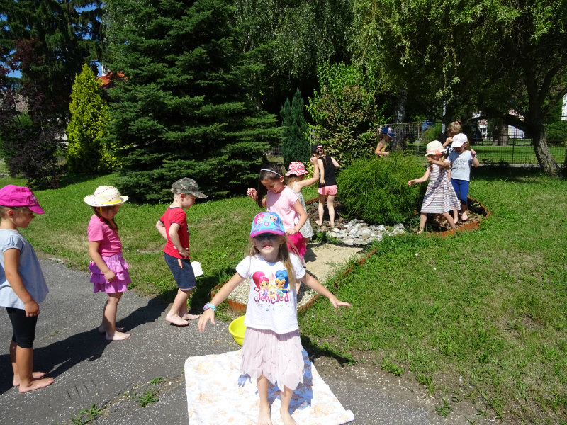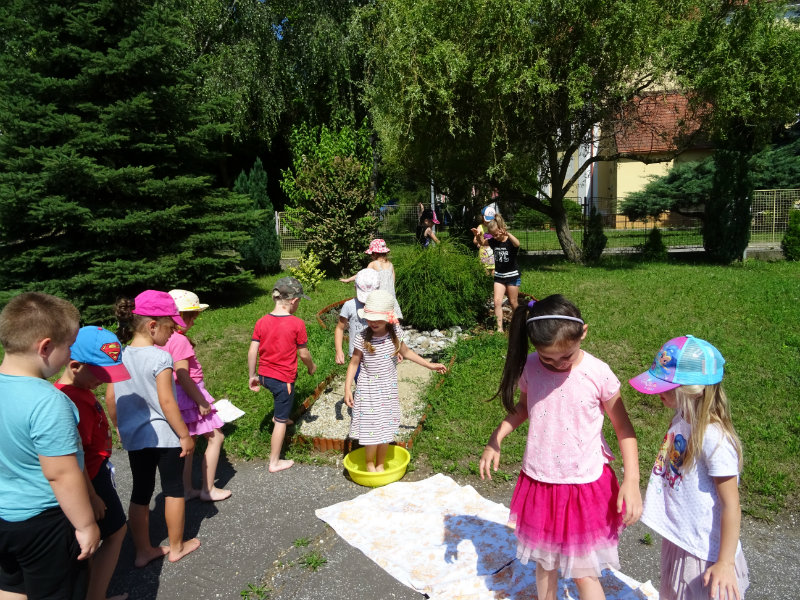 V utorok, 25.6., sme vyskúšali pocitový chodník v našej materskej škole. V tomto horúcom počasí sme sa veľmi tešili najmä na vedro s vodou, čo nás po pichľavých kamienkoch a šuškách dokonale osviežilo.