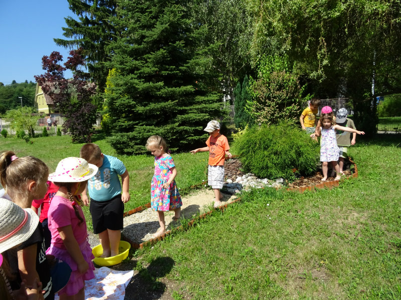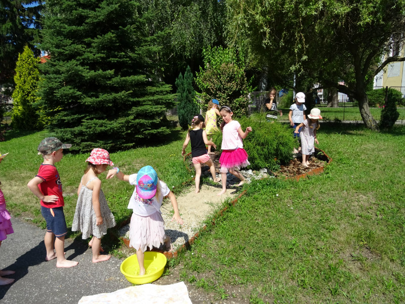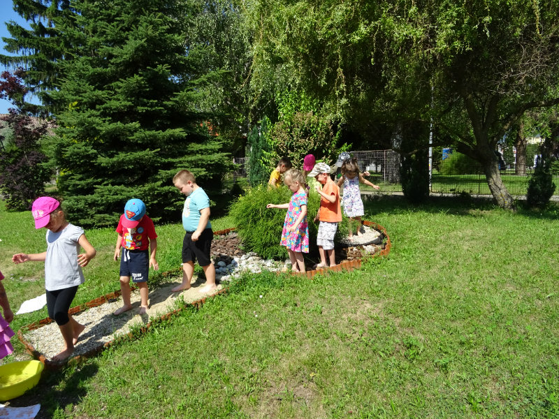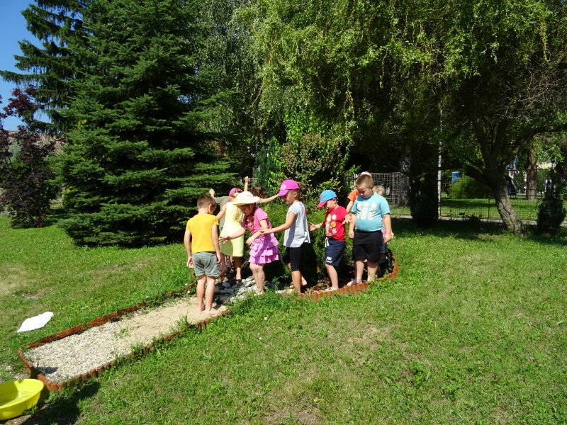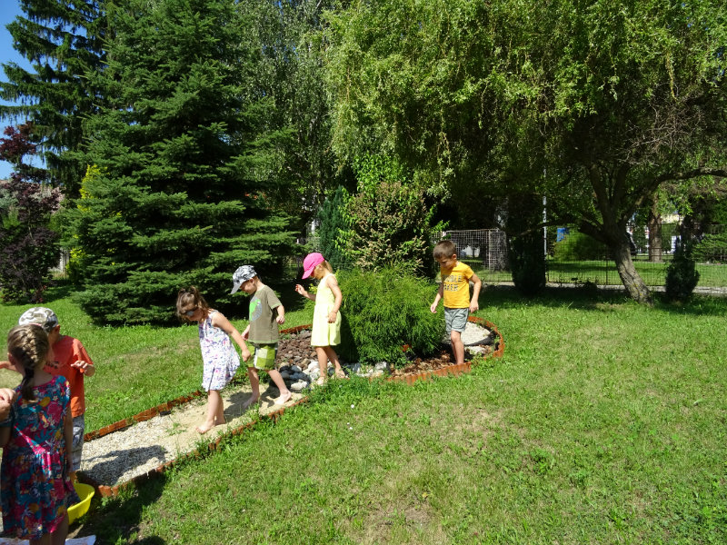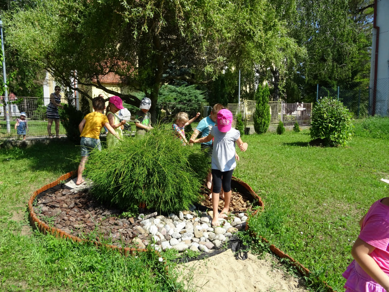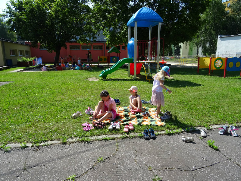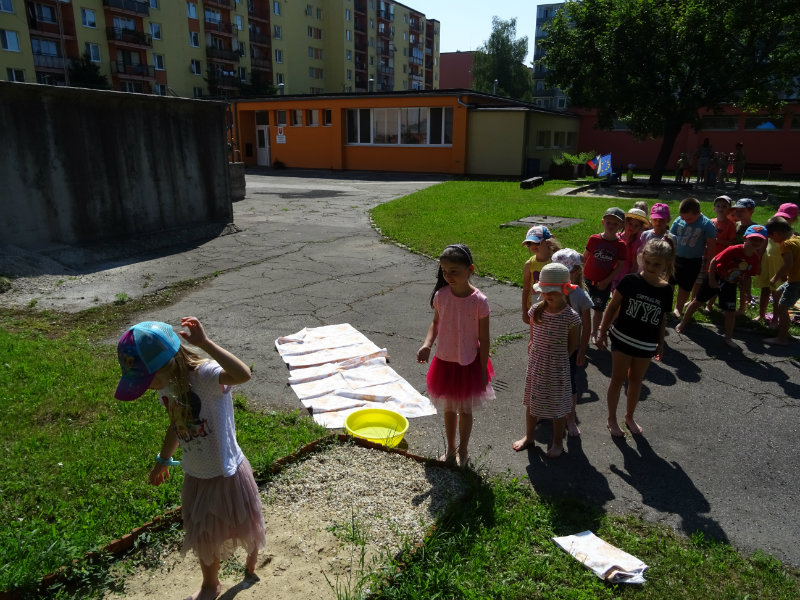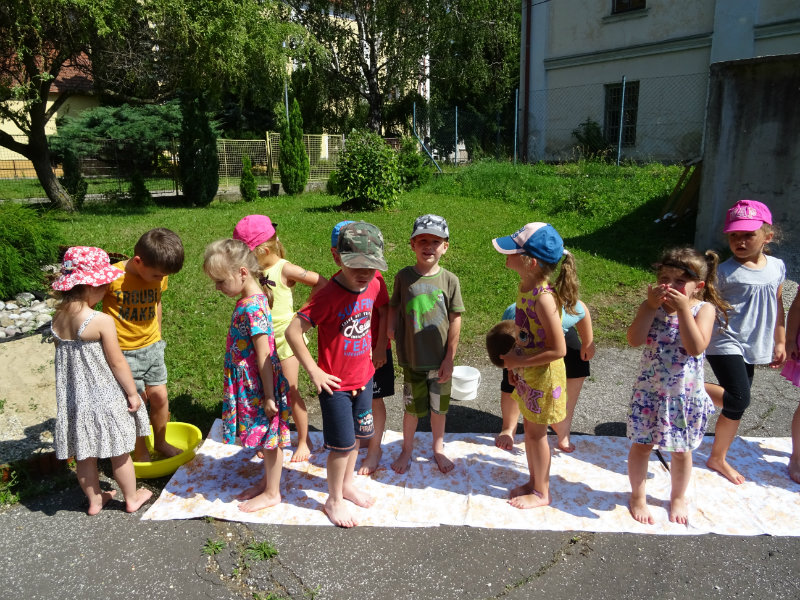 V utorok, 25.6., sme vyskúšali pocitový chodník v našej materskej škole. V tomto horúcom počasí sme sa veľmi tešili najmä na vedro s vodou, čo nás po pichľavých kamienkoch a šuškách dokonale osviežilo.