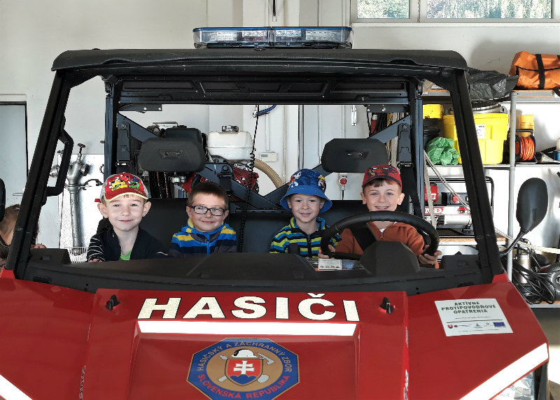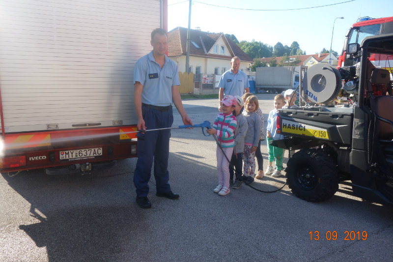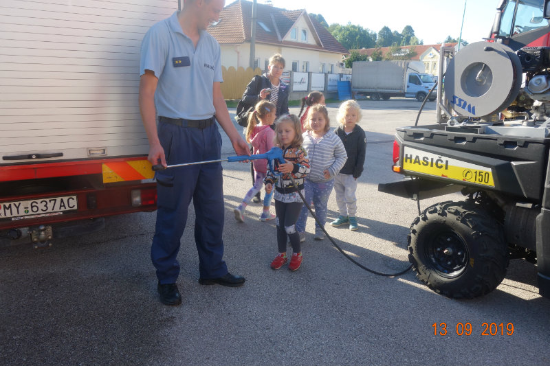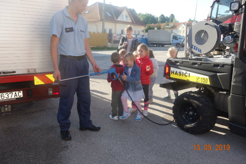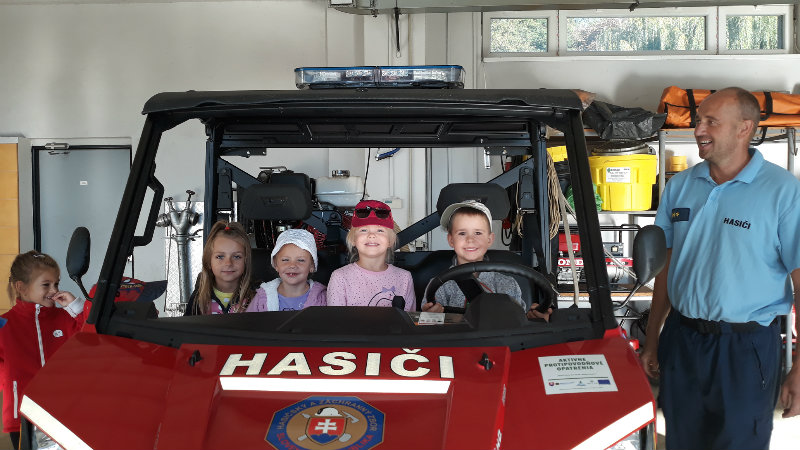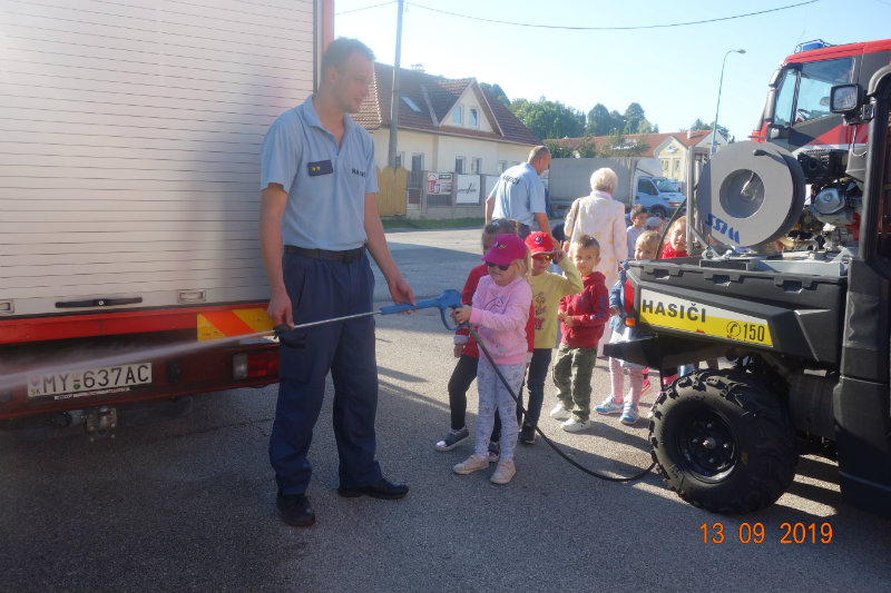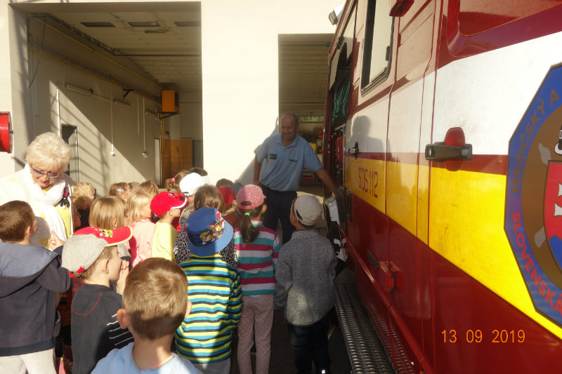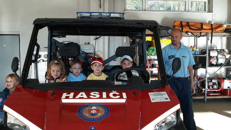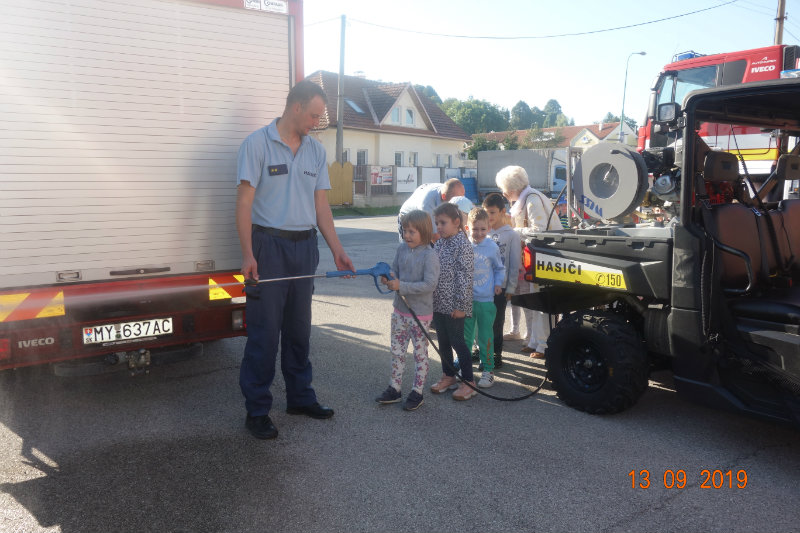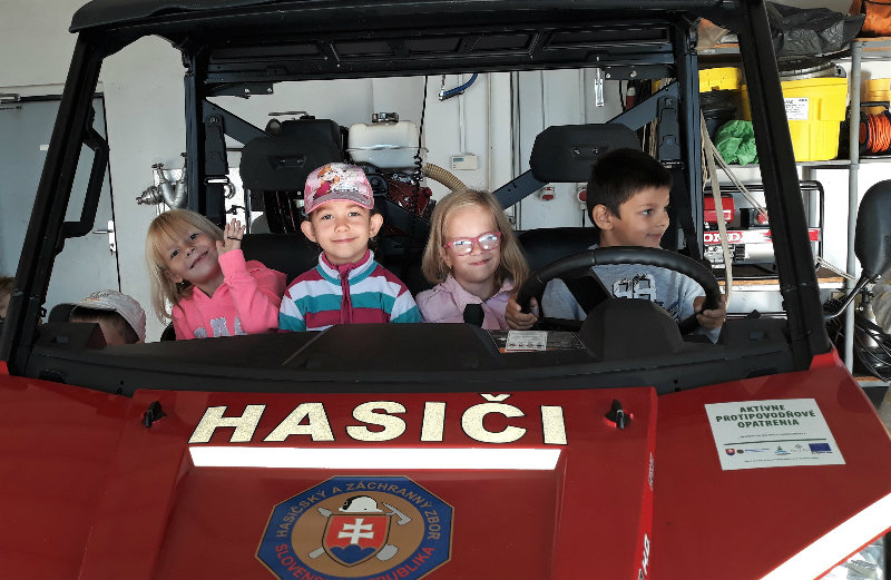 Deti z predškolských tried na exkurzii Hasičského a záchranného zboru na Myjave mali možnosť zblízka si pozrieť hasičskú techniku, výstroj hasičov, plynové masky, či vyskúšať hasičskú prilbu a odev. Obdivovali ako vysoko sa dá vysunúť rebrík na hasičskom aute. Posedeli si v hasičskom džípe, videli ako fungujú pneumatické nožnice určené na strihanie plechu. Zážitkom pre deti bolo vyskúšať si nožnicami strihanie plechu i striekanie z hadice. Za túto možnosť ďakujeme pánovi S. Zigovi a jeho kolegom.
