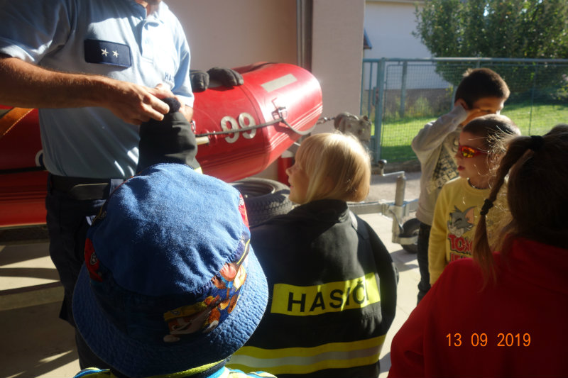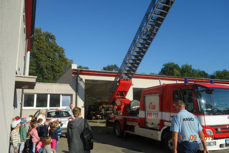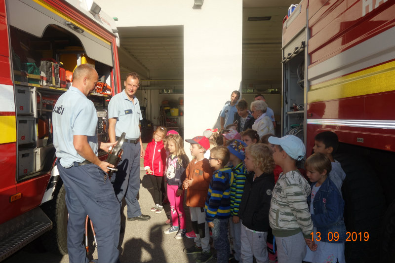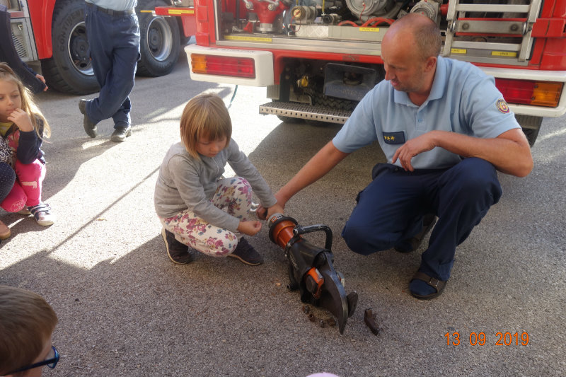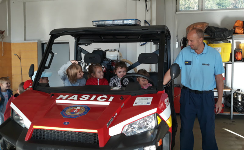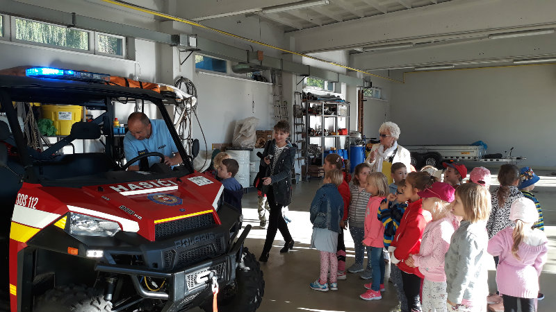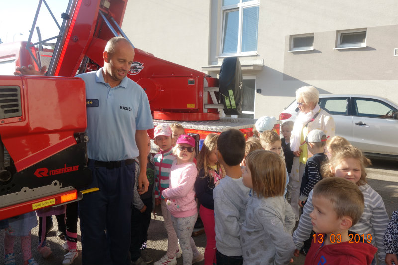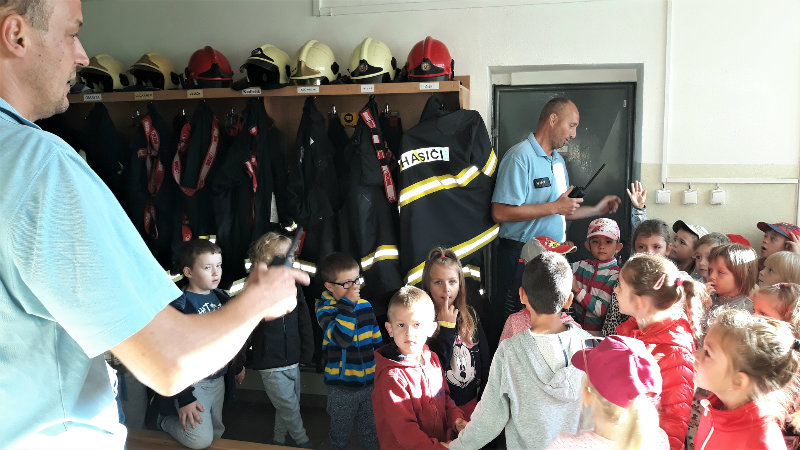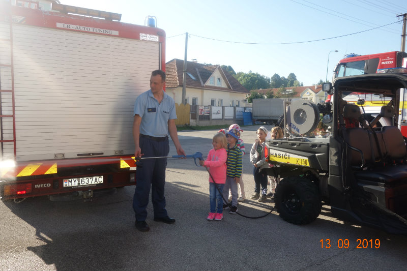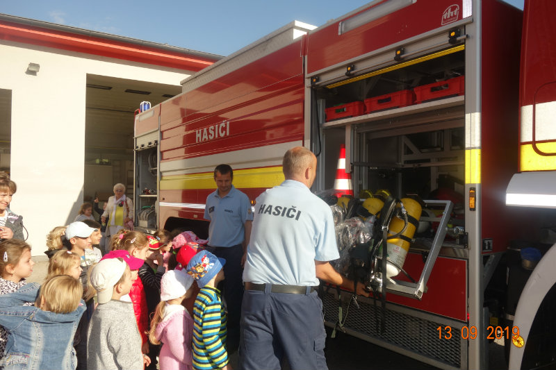 Deti z predškolských tried na exkurzii Hasičského a záchranného zboru na Myjave mali možnosť zblízka si pozrieť hasičskú techniku, výstroj hasičov, plynové masky, či vyskúšať hasičskú prilbu a odev. Obdivovali ako vysoko sa dá vysunúť rebrík na hasičskom aute. Posedeli si v hasičskom džípe, videli ako fungujú pneumatické nožnice určené na strihanie plechu. Zážitkom pre deti bolo vyskúšať si nožnicami strihanie plechu i striekanie z hadice. Za túto možnosť ďakujeme pánovi S. Zigovi a jeho kolegom.