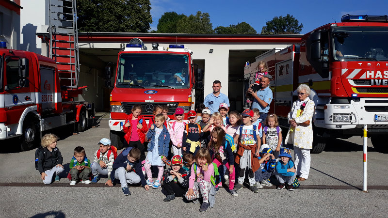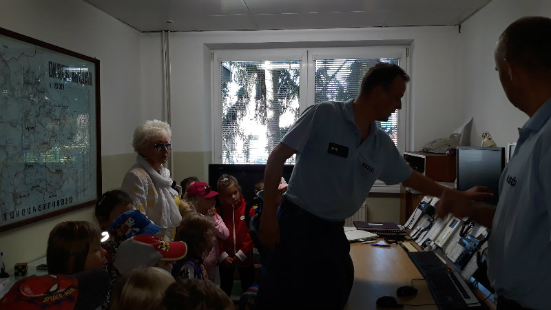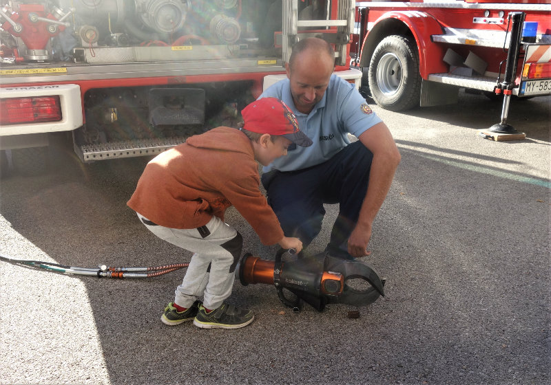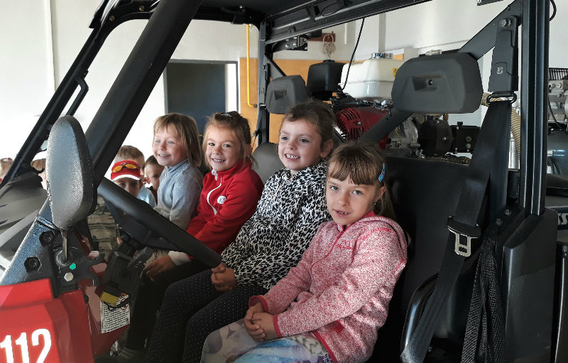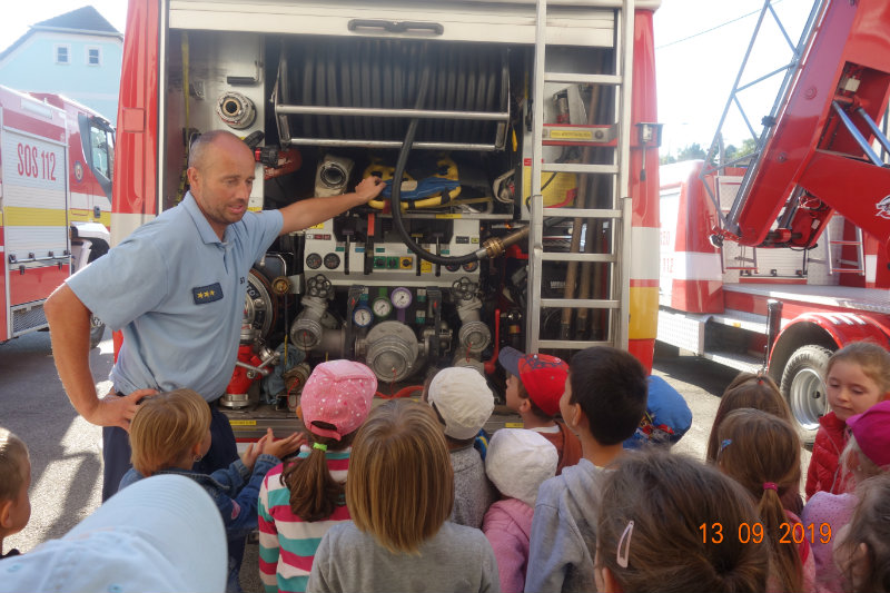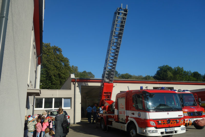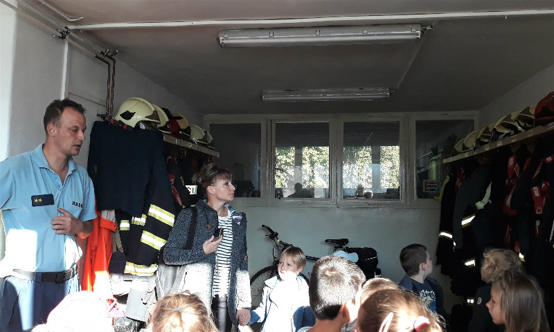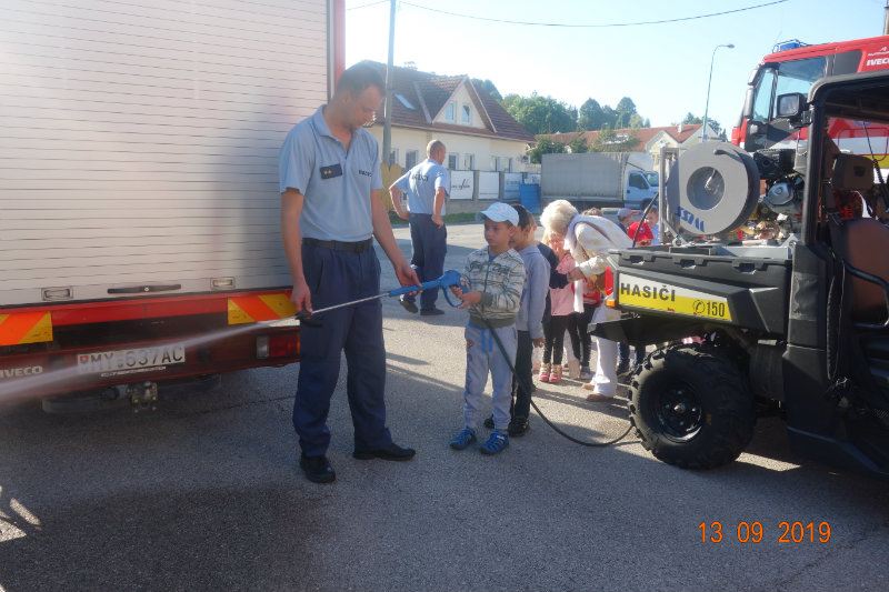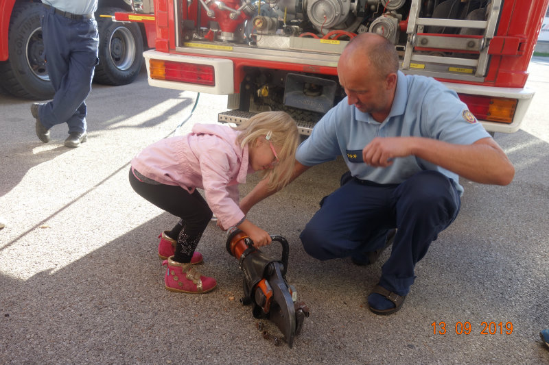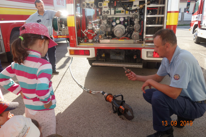 Deti z predškolských tried na exkurzii Hasičského a záchranného zboru na Myjave mali možnosť zblízka si pozrieť hasičskú techniku, výstroj hasičov, plynové masky, či vyskúšať hasičskú prilbu a odev. Obdivovali ako vysoko sa dá vysunúť rebrík na hasičskom aute. Posedeli si v hasičskom džípe, videli ako fungujú pneumatické nožnice určené na strihanie plechu. Zážitkom pre deti bolo vyskúšať si nožnicami strihanie plechu i striekanie z hadice. Za túto možnosť ďakujeme pánovi S. Zigovi a jeho kolegom.