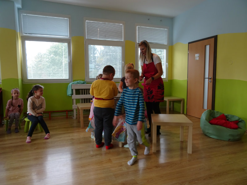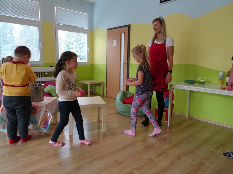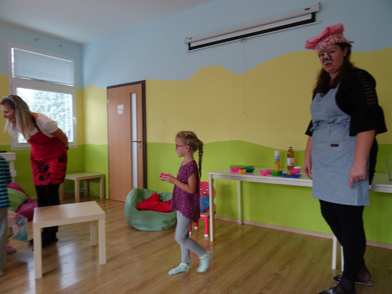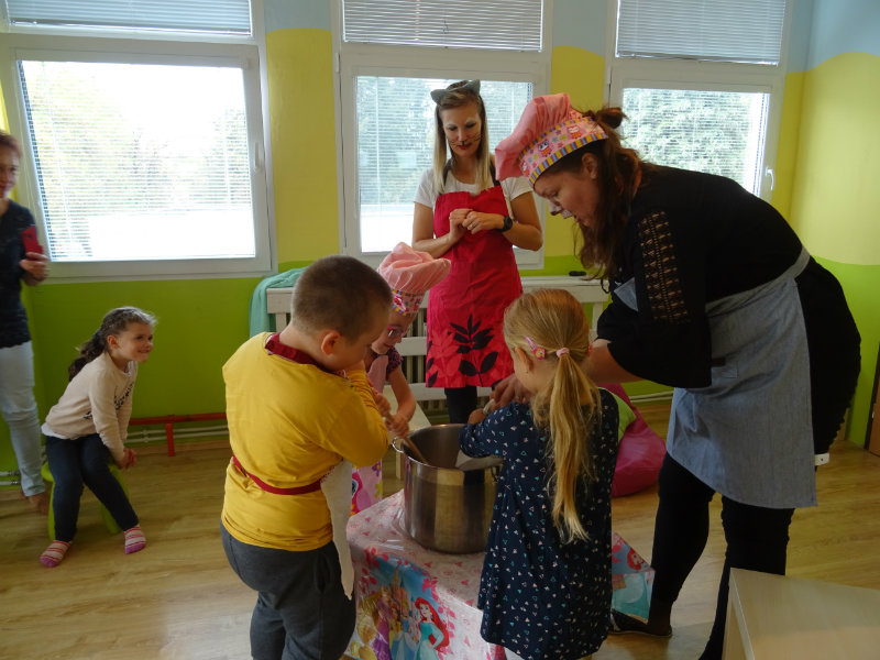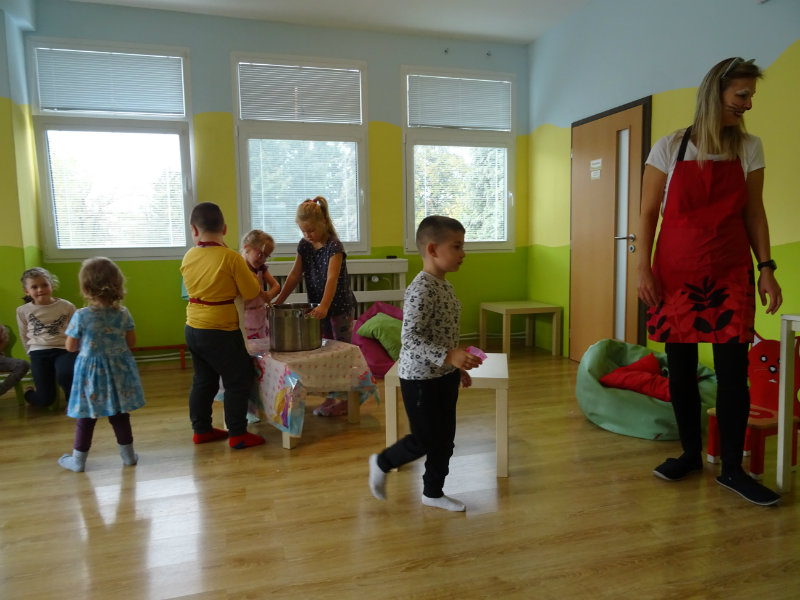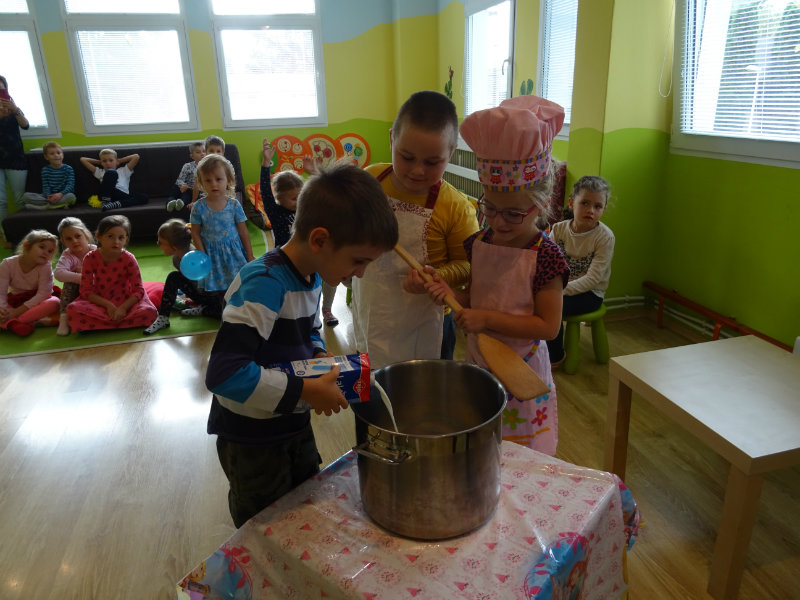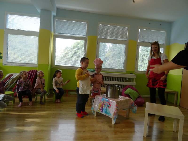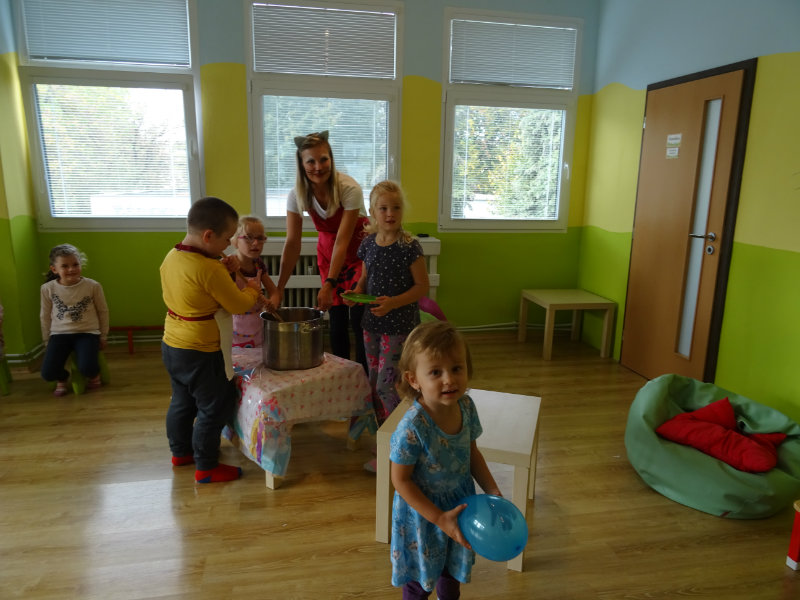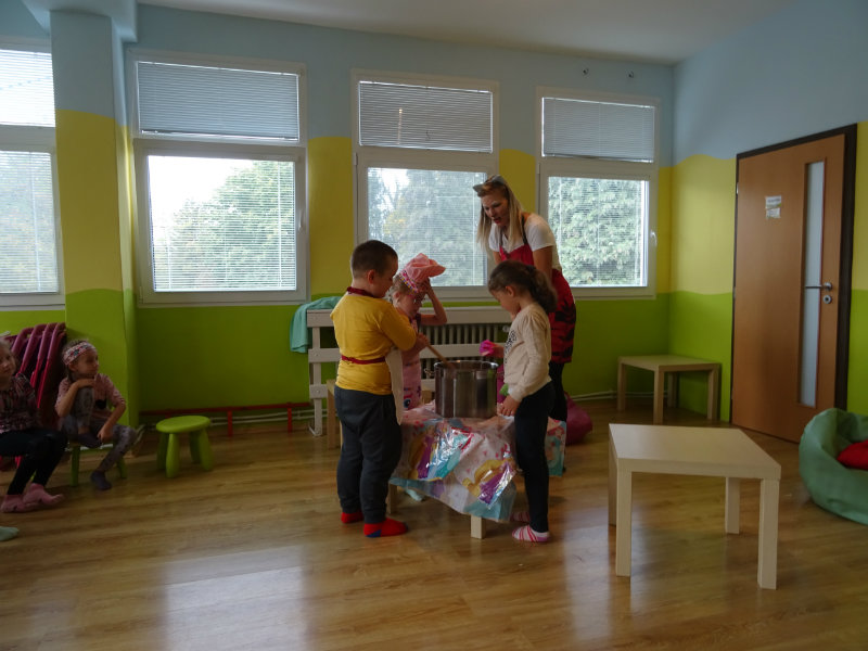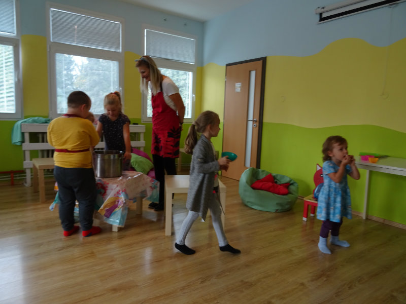 Vo štvrtok, 3.septembra, nás pozvali mamičky do materského centra Žabka. Pripravili si pre nás zaujímavé divadielko o psíčkovi a mačičke, v ktorom sme vystupovali i my. Spoznávali sme suroviny na výrobu torty a varili smeju pre psíčka a mačičku. Potom sme tvorili svietniky s jesennou tematikou a ježkov z listov. Ďakujeme p. Kandríkovej a Kýškovej za prekrásne dopoludnie.