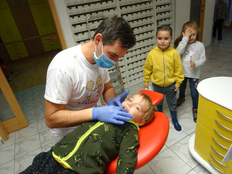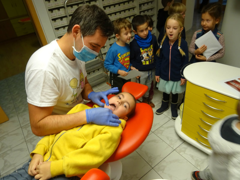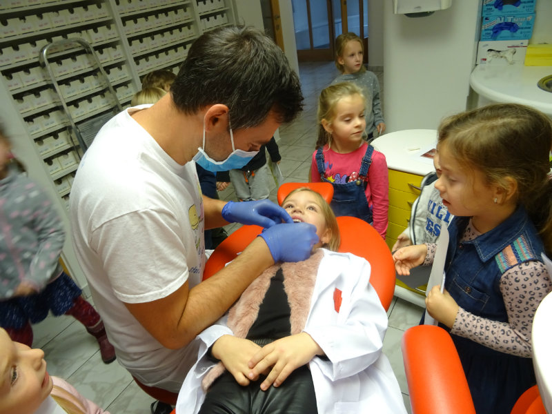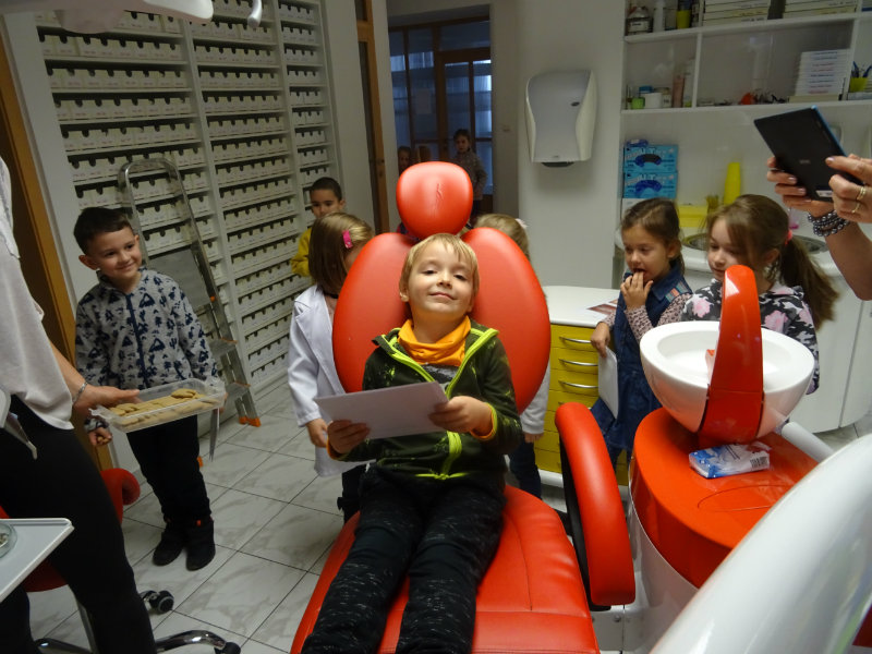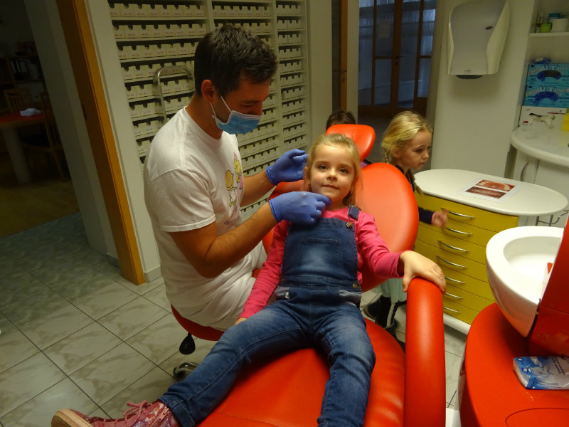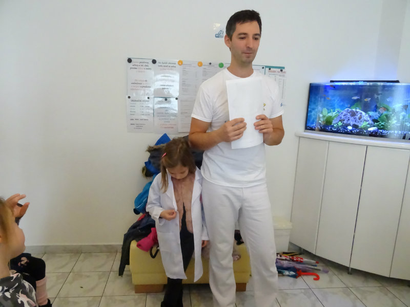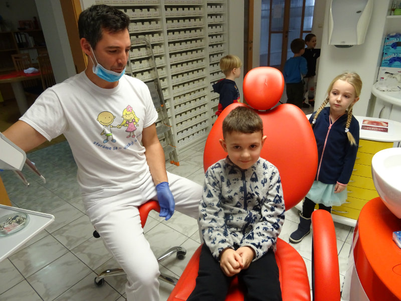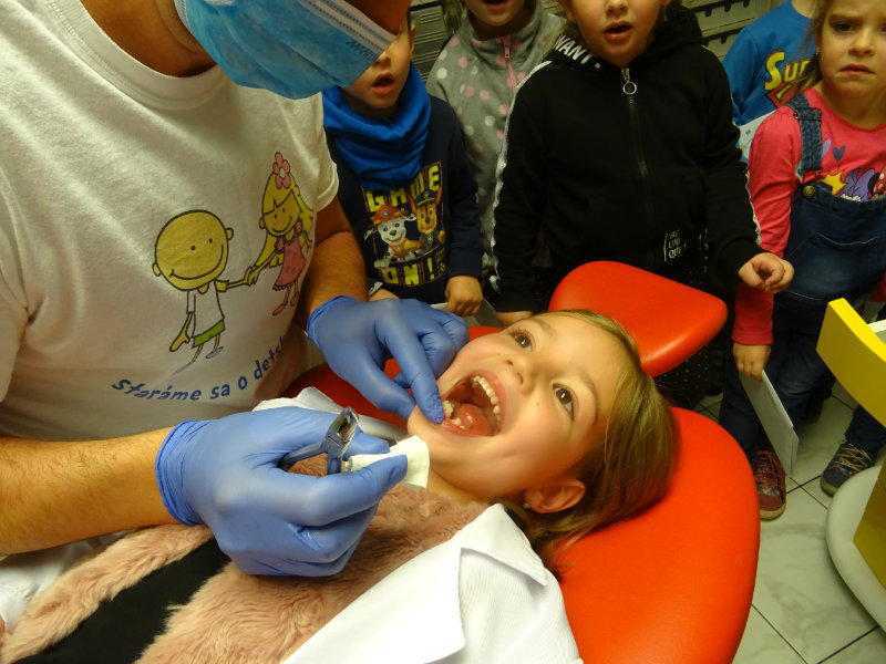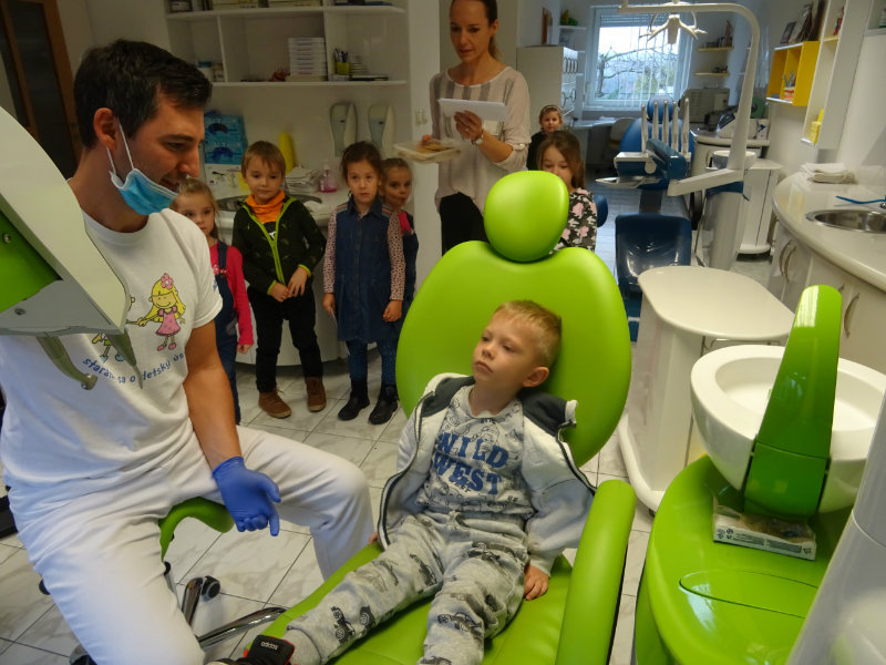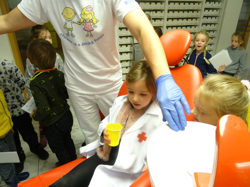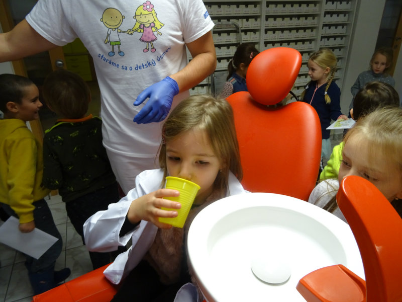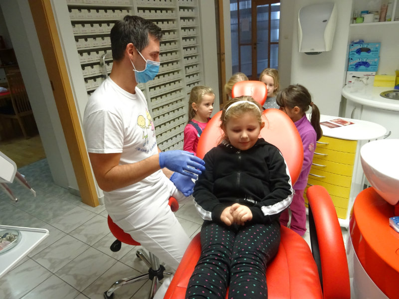 Ani upršaný deň nás neodradil od návštevy zubného lekára, pána Galbavého. Dňa 13.11. nás pozval do svojej ambulancie a za asistencie svojej dcérky Elišky, "zubnej sestričky", a pani manželky, oboznámili deti s prevenciou zubného kazu. Každému pán doktor skontroloval zúbky, povozil na kresle a za odvahu a statočnosť daroval diplom. Ďakujeme celej rodine Galbavej za čas a získané skúsenosti.