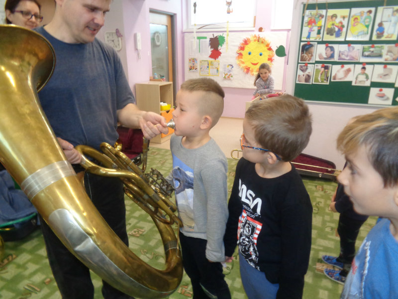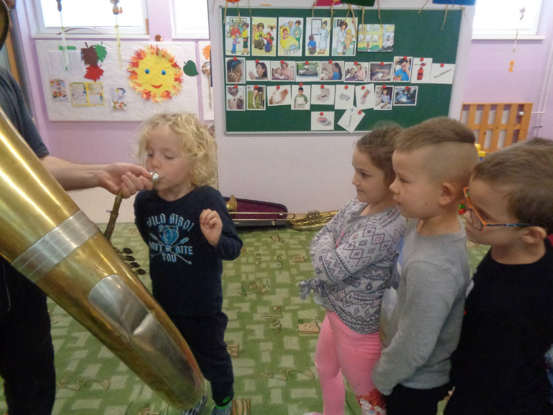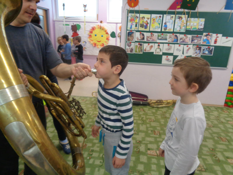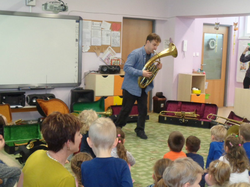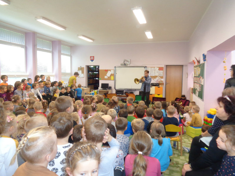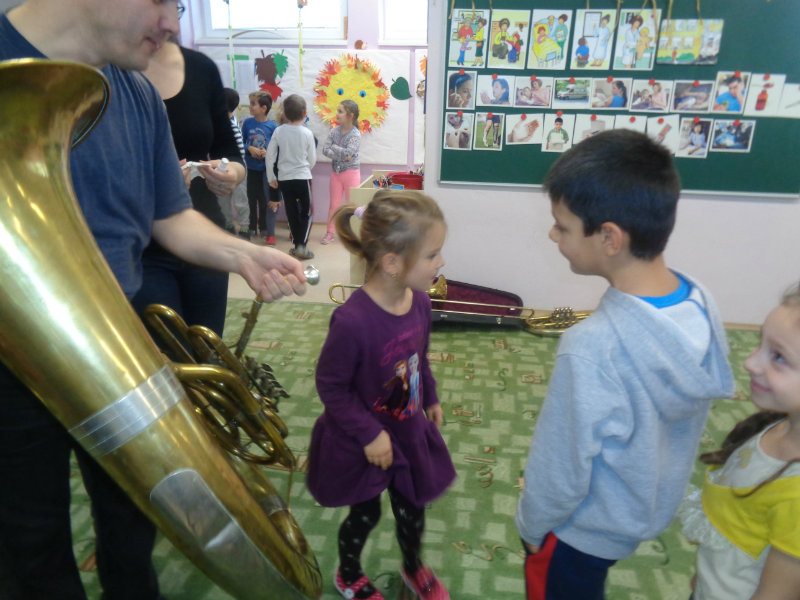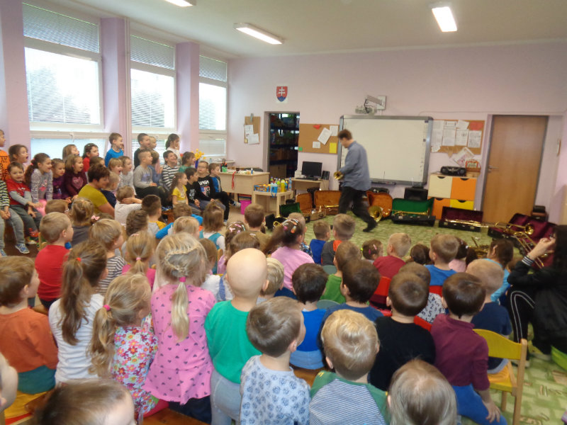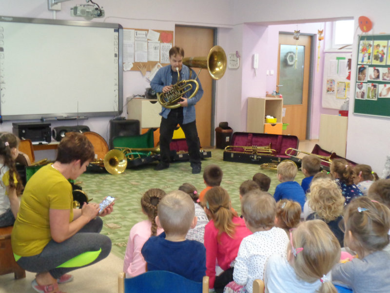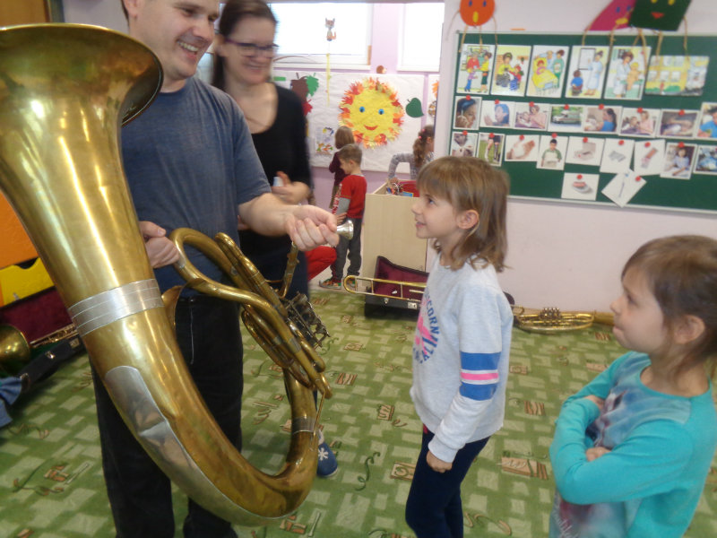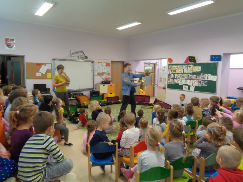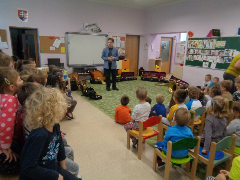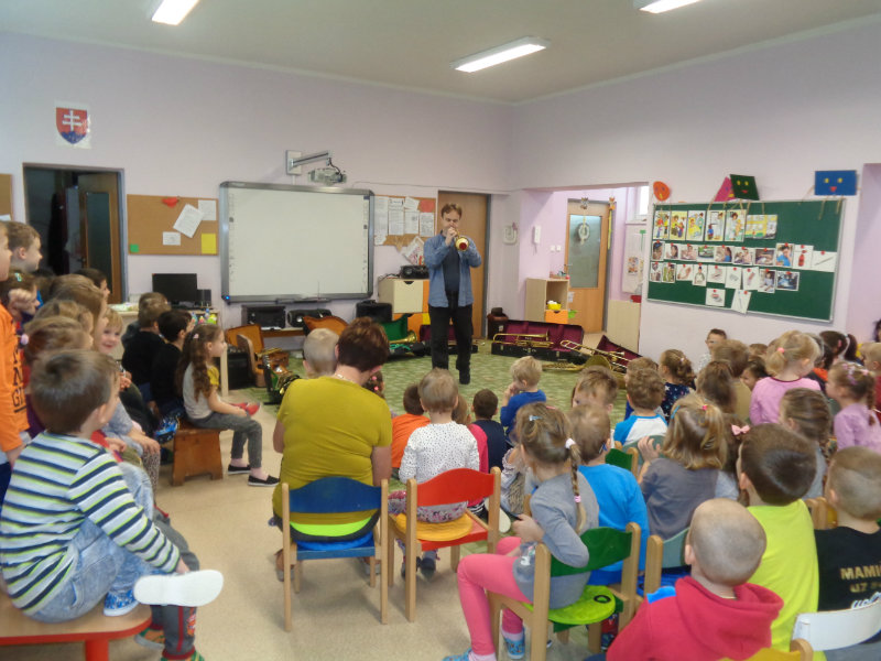 V utorok dopoludnia zavítal do MŠ pán Roman Ondrejka, ktorý pricestoval s mnohými zázračnými kuframi - plnými dychových plechových nástrojov. Pomocou pekného príbehu nás zoznámil s jednotlivými nástrojmi, ich názvami, dávnou minulosťou a z každého vylúdil známu pieseň a melódiu. Deti mali možnosť zaspievať si i fúknuť do toho najväčšieho, čo bolo pre nich naozajstným zážitkom. Ďakujeme.