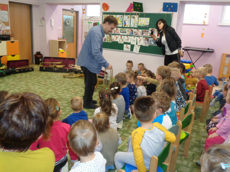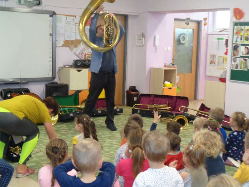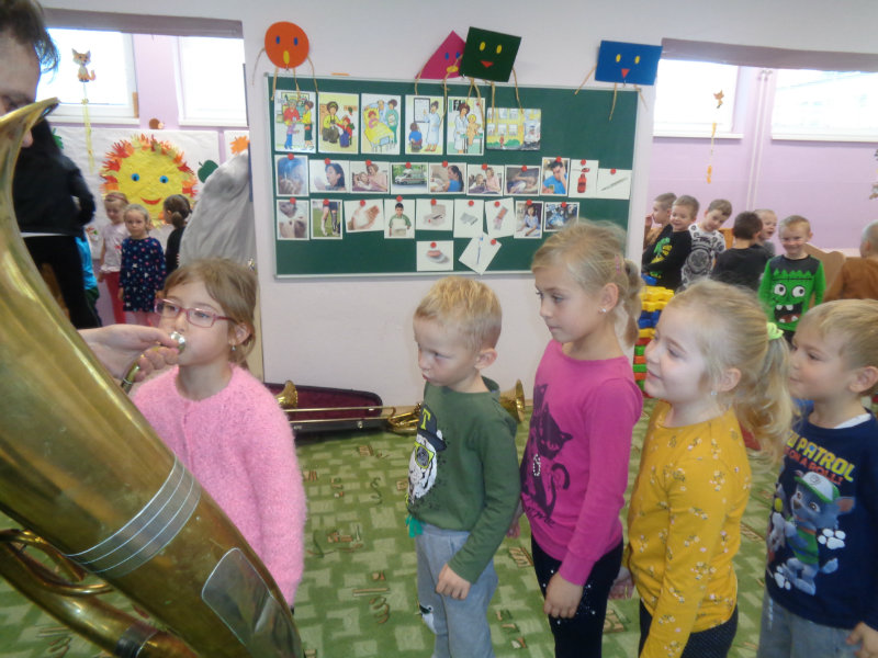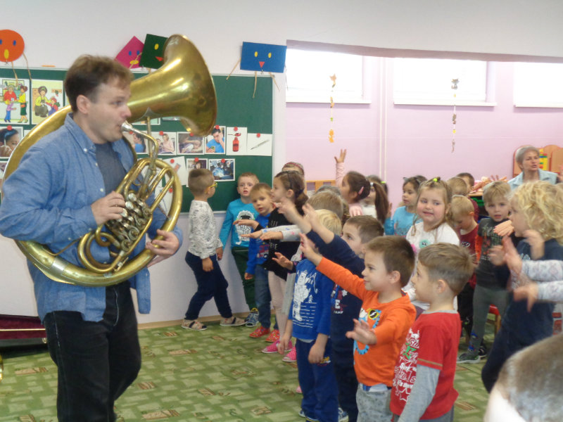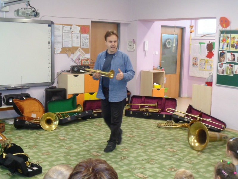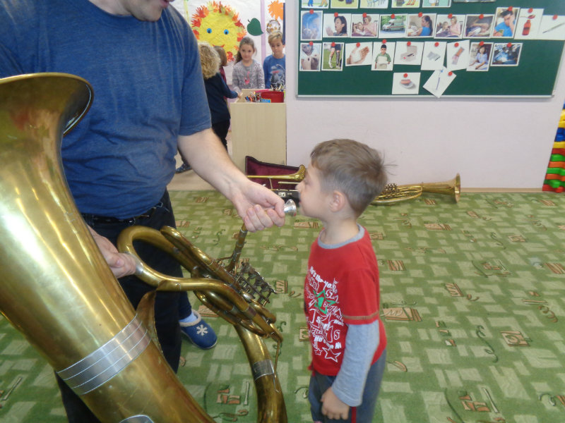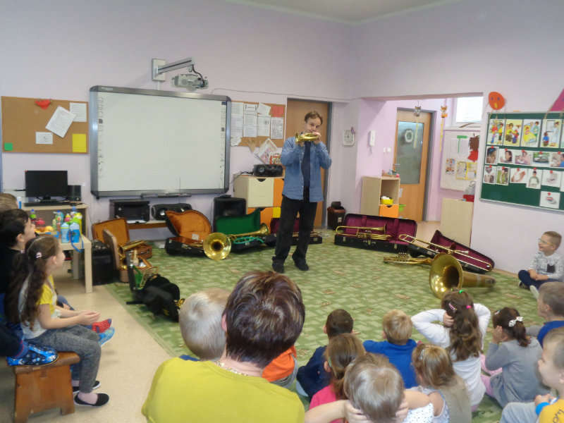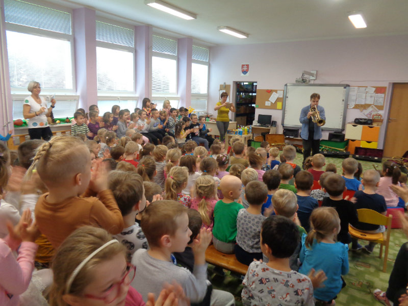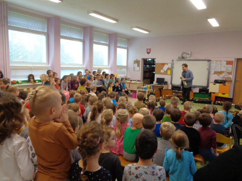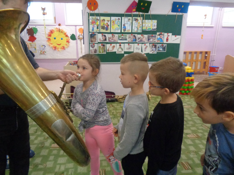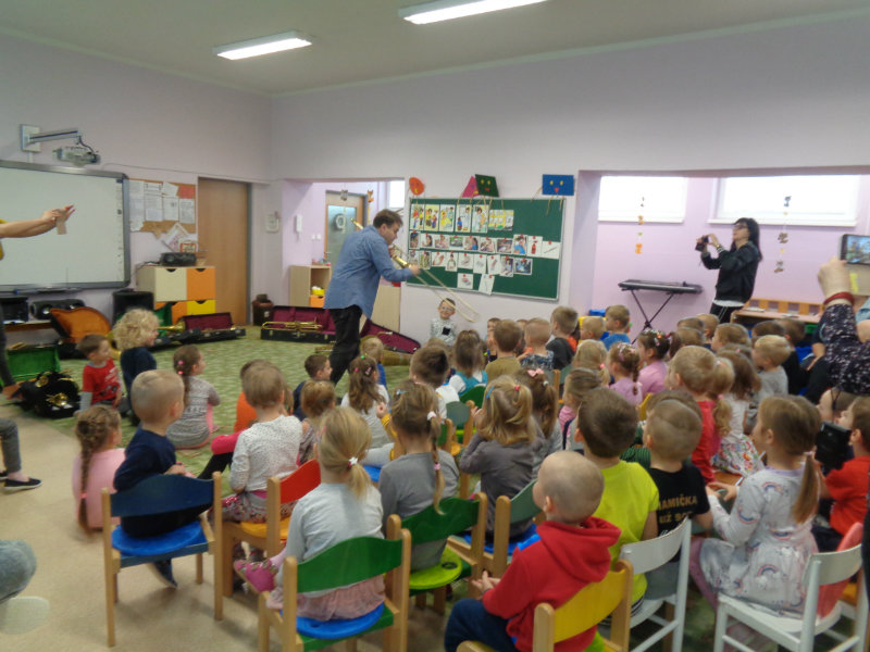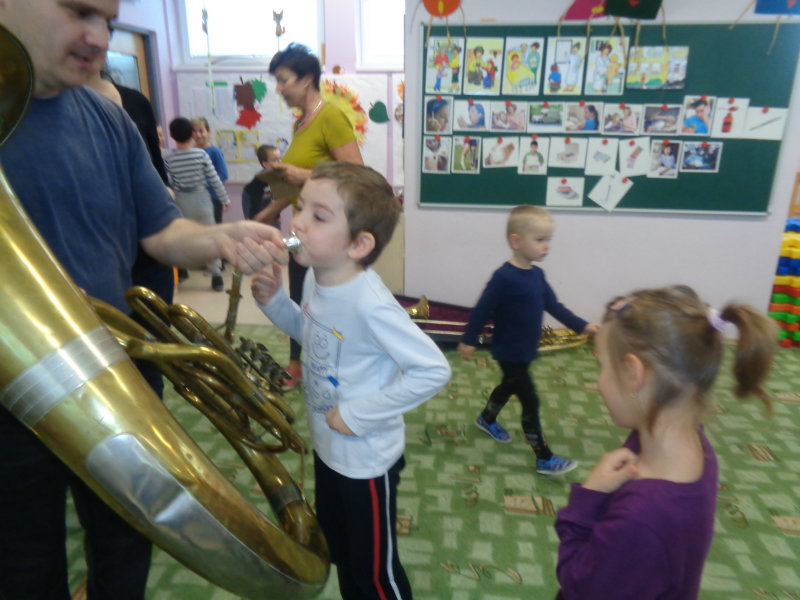 V utorok dopoludnia zavítal do MŠ pán Roman Ondrejka, ktorý pricestoval s mnohými zázračnými kuframi - plnými dychových plechových nástrojov. Pomocou pekného príbehu nás zoznámil s jednotlivými nástrojmi, ich názvami, dávnou minulosťou a z každého vylúdil známu pieseň a melódiu. Deti mali možnosť zaspievať si i fúknuť do toho najväčšieho, čo bolo pre nich naozajstným zážitkom. Ďakujeme.