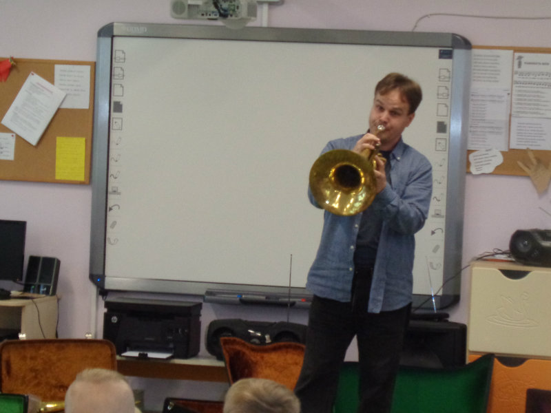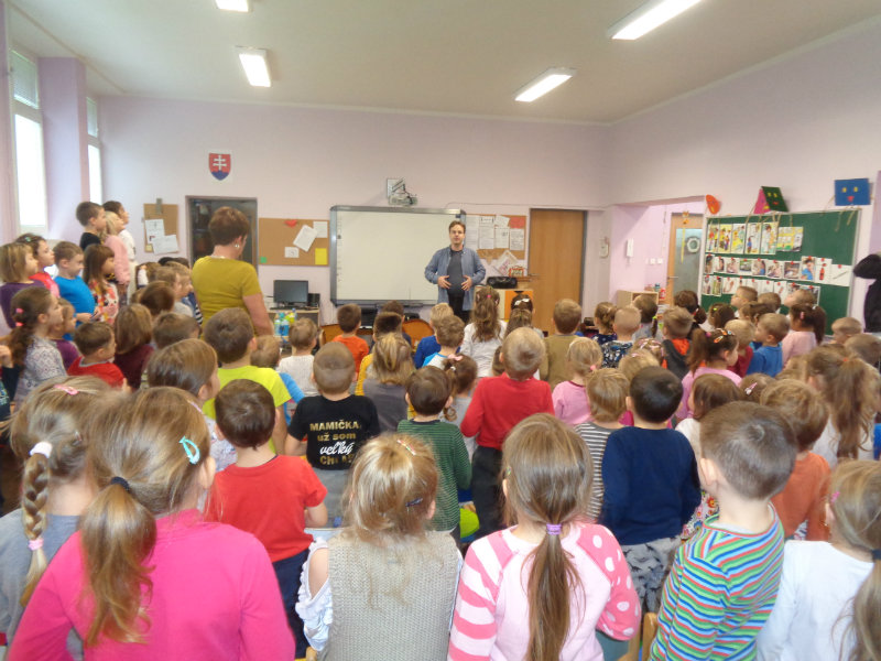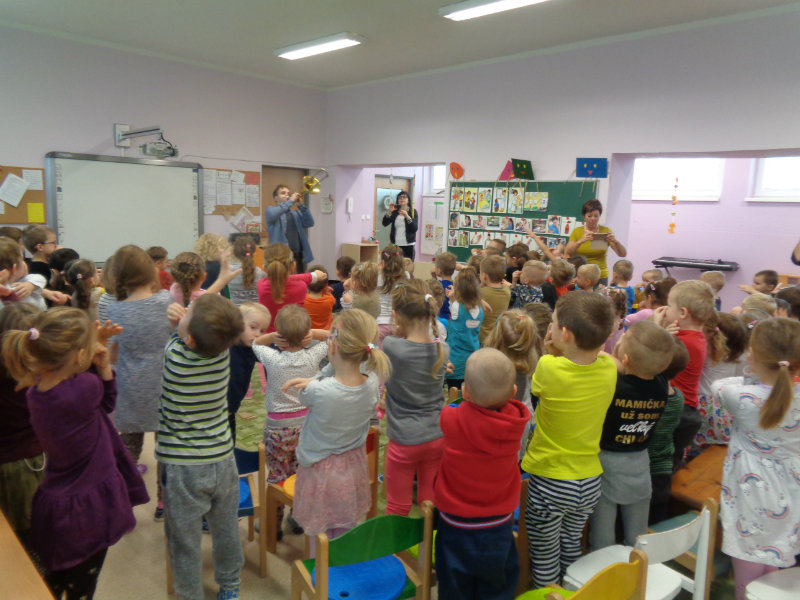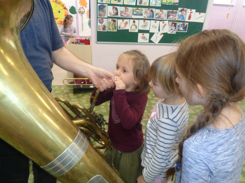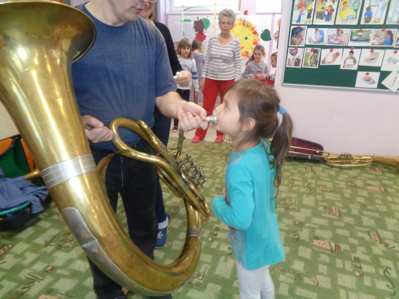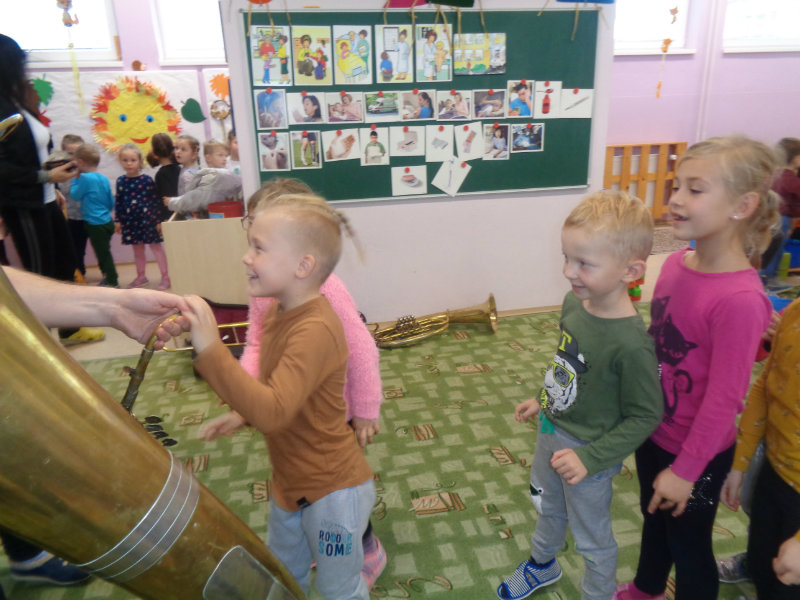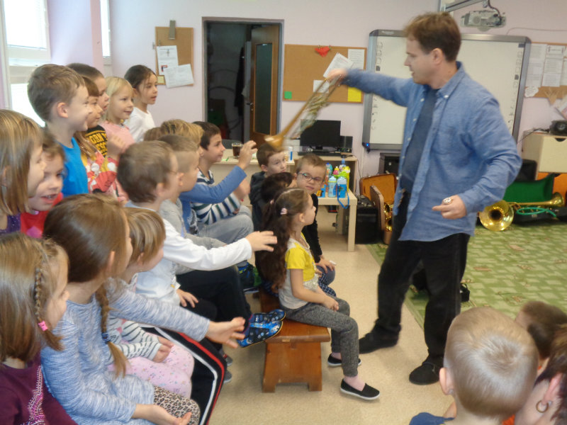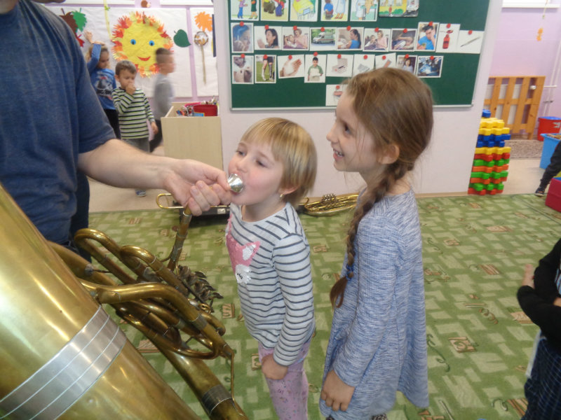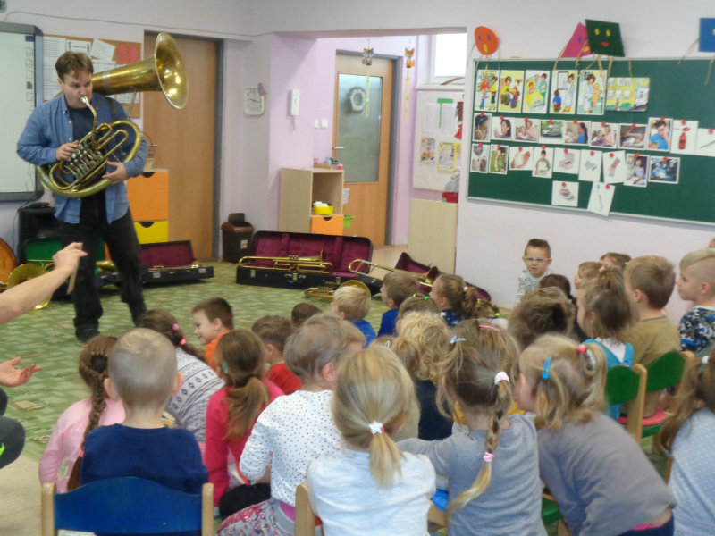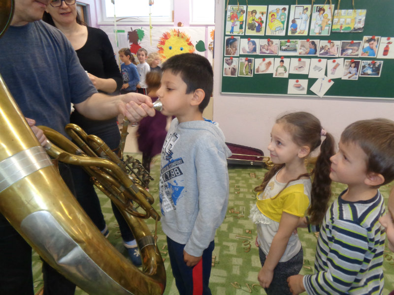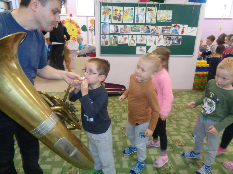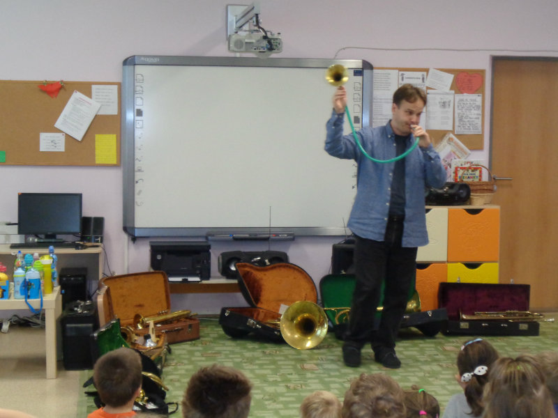 V utorok dopoludnia zavítal do MŠ pán Roman Ondrejka, ktorý pricestoval s mnohými zázračnými kuframi - plnými dychových plechových nástrojov. Pomocou pekného príbehu nás zoznámil s jednotlivými nástrojmi, ich názvami, dávnou minulosťou a z každého vylúdil známu pieseň a melódiu. Deti mali možnosť zaspievať si i fúknuť do toho najväčšieho, čo bolo pre nich naozajstným zážitkom. Ďakujeme.