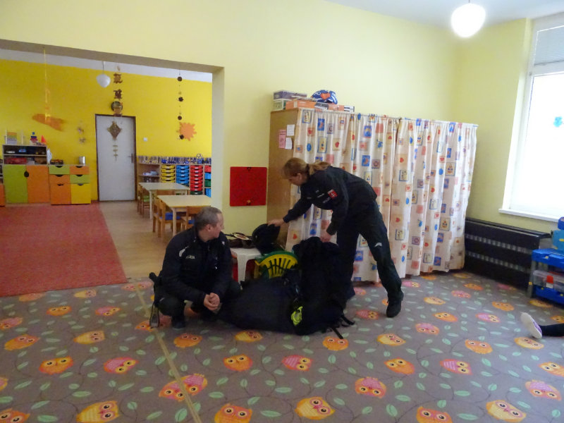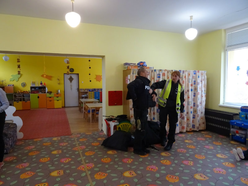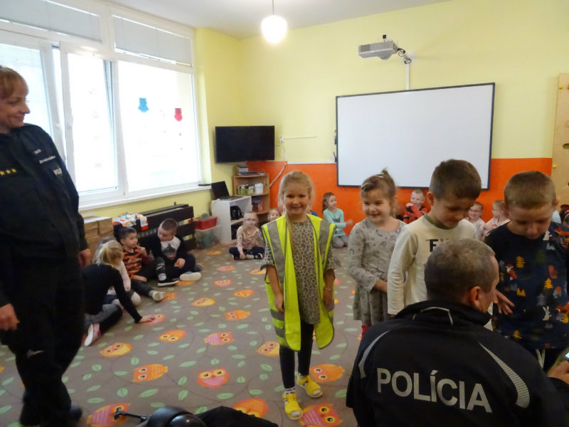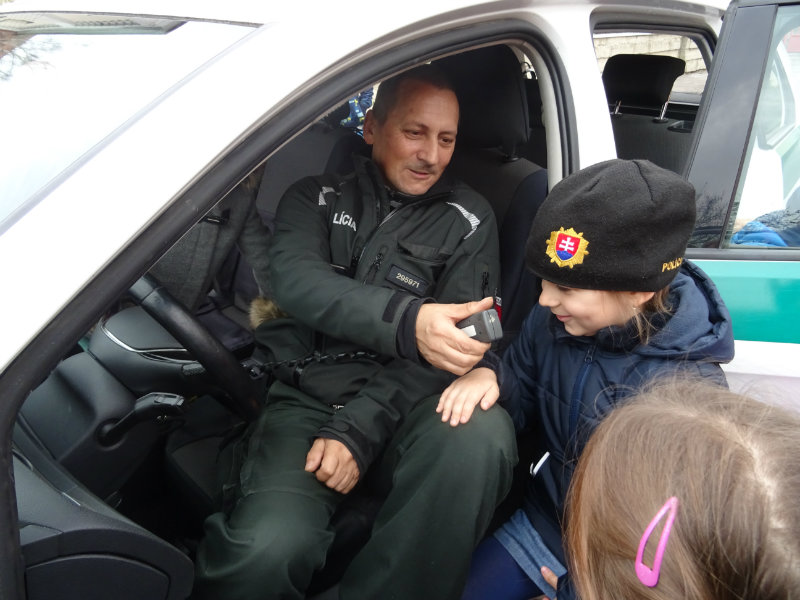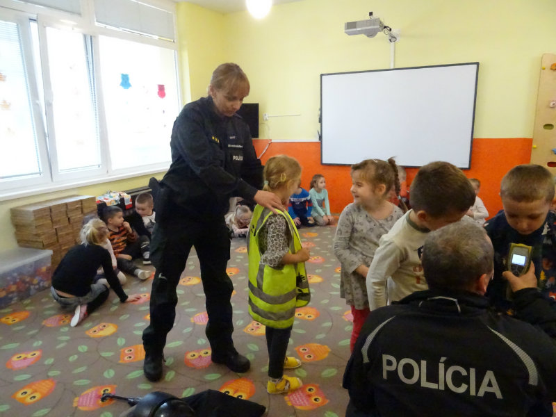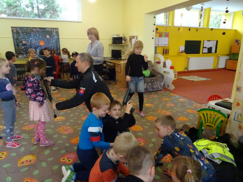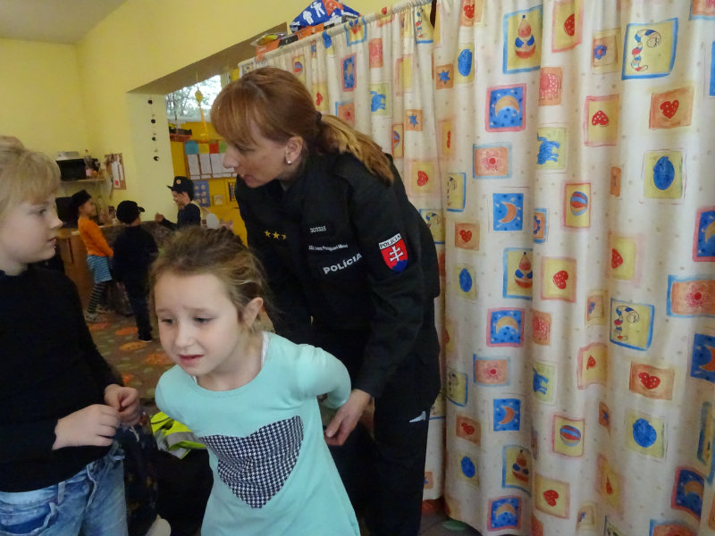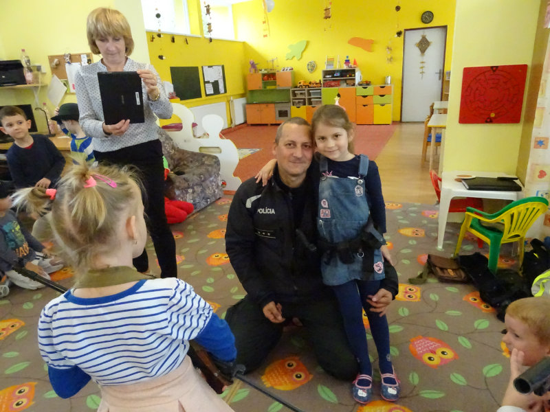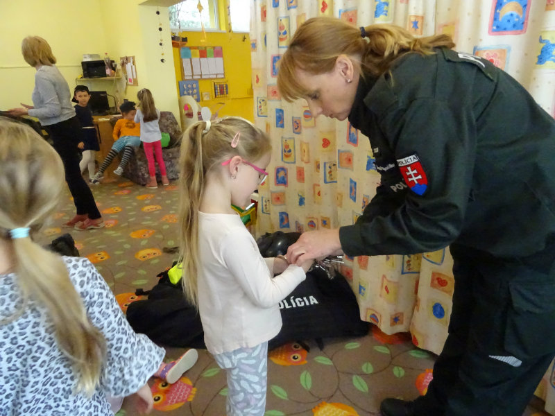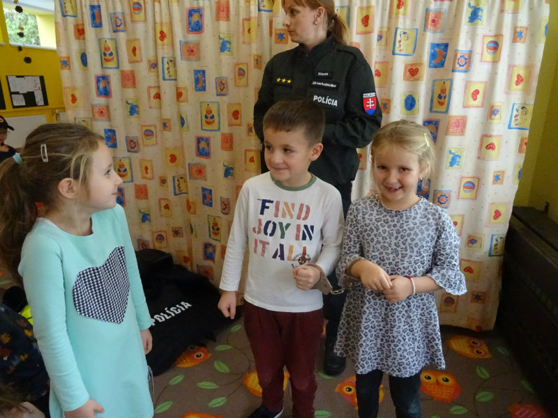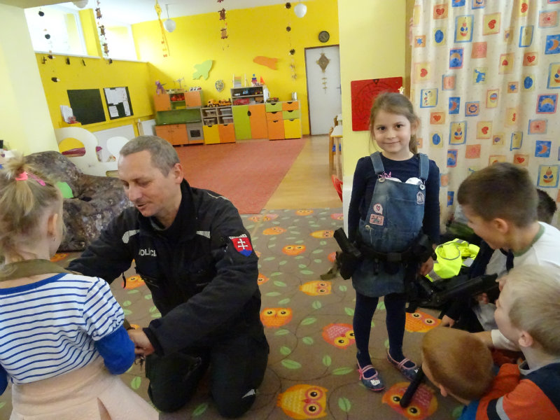 V stredu, 20.11., do MŠ pri cukrárni prišla POLÍCIA. Pani npor. JUDr. Ivana Pomajbová Miková a pán npráp. Marian Halienka nám porozprávali o dôležitosti ich povolania, o zásahoch polície, ukázali nám ich pomôcky pri zásahoch. Najviac sa nám páčilo, že sme si mohli všetko chytiť do svojich rúk a vyskúšať. Bolo to perfektné. Ďakujeme pracovníkom Staroturianskej polícií za krásne dopoludnie.